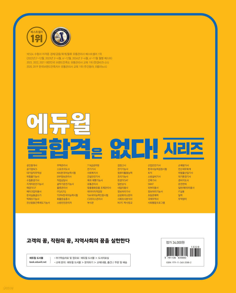 Why Eduwill? 에듀윌이 만들면 다릅니다. 단기합격을 위한 최적 구성 Learning Strategy 유통관리사 2급, 과목 분석 및 학습 전략 유통관리사 2급 시험의 모든 것 SUBJECT 01 유통·물류 일반관리 PART 01 유통의 이해 PART 02 유통경영전략 PART 03 유통경영관리 PART 04 물류경영관리 PART 05 유통기업의 윤리와 법규 SUBJECT 02 상권분석 PART 01 유통상권조사 PART 02 입지분석 PART 03 개점전략 SUBJECT 03 유통마케팅 PART 01 유통마케팅 전략기획 PART 02 디지털마케팅 전략 PART 03 점포관리 PART 04 상품판매와 고객관리 PART 05 유통마케팅 조사와 평가 SUBJECT 04 유통정보 PART 01 유통정보의 이해 PART 02 지식경영 PART 03 주요 유통정보화 기술 및 시스템 PART 04 유통정보의 관리와 활용 PART 05 전자상거래 [5개년 기출] 2024년 3회 기출문제 2024년 2회 기출문제 2024년 1회 기출문제 2023년 3회 기출문제 2023년 2회 기출문제 2023년 1회 기출문제 2022년 3회 기출문제 2022년 2회 기출문제 2022년 1회 기출문제 2021년 3회 기출문제 2021년 2회 기출문제 2021년 1회 기출문제 2020년 3회 기출문제 2020년 추가시행 기출문제 2020년 2회 기출문제 |