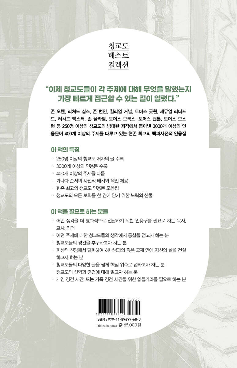 ㆍ250명 이상의 청교도 저자의 글 수록 ㆍ3000개 이상의 인용문 수록 ㆍ400개 이상의 주제를 다룸 ㆍ가나다 순서의 사전적 배치와 주제별 색인 제공 ㆍ현존 최고의 청교도 인용문 모음집 ㆍ청교도의 모든 보화를 한 권에 담기 위한 노력의 산물 이 책을 필요로 하는 분들 ㆍ설교를 풍성하게 만들어줄 인용구를 필요로 하는 목사 ㆍ어떤 생각을 더 효과적으로 전달하기 위한 인용구를 필요로 하는 교사, 리더 ㆍ어떤 주제에 대한 청교도들의 생각에서 통찰을 얻고자 하는 분 ㆍ청교도들의 경건을 추구하는 분 ㆍ피상적 신앙에서 탈피하여 하나님과의 깊은 교제 안에 자신의 삶을 건설하고자 하는 분 ㆍ청교도들의 다양한 글을 짧게 핵심 위주로 접하고자 하는 분 ㆍ청교도의 신학과 경건에 대해 알고자 하는 분 ㆍ개인 경건 시간, 또는 가족 경건 시간을 위한 읽을거리를 필요로 하는 분 |
