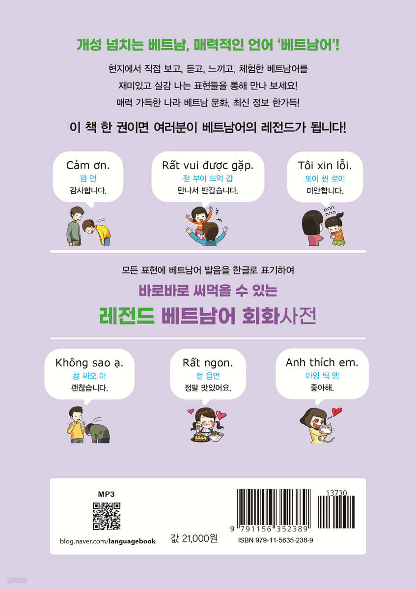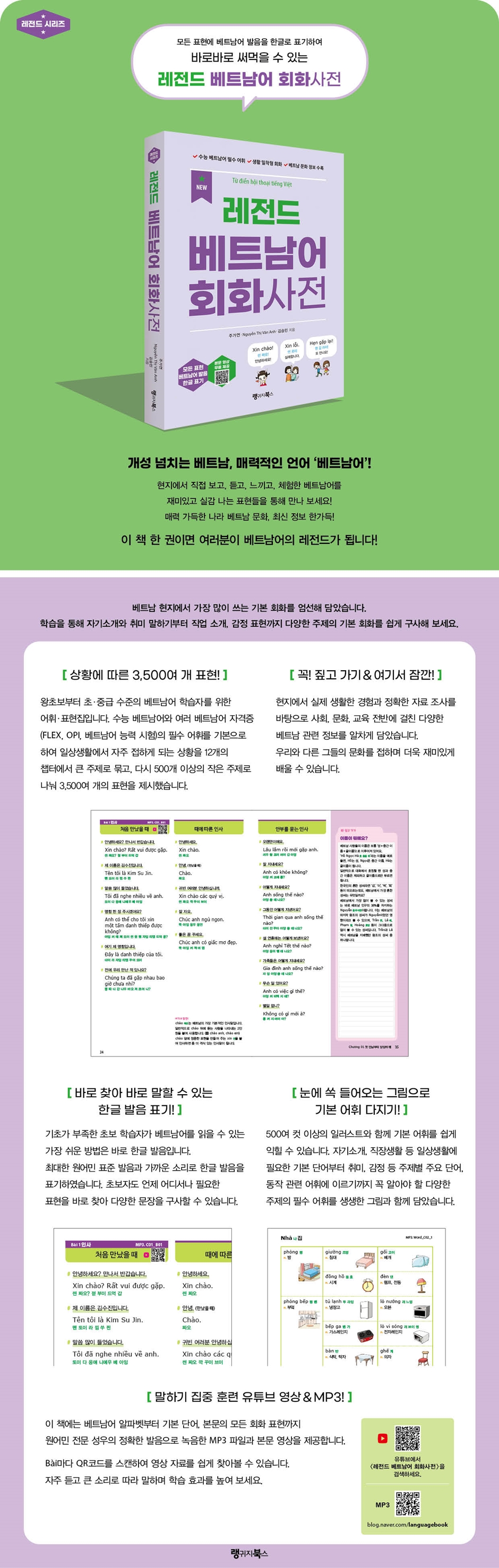 1. 베트남어 최신 3,500여 개 표현! 왕초보부터 초·중급 수준의 베트남어 학습자를 위한 어휘·표현집입니다. 수능 베트남어와 여러 베트남어 자격증(FLEX, OPI, 베트남어 능력 시험)의 필수 어휘를 기본으로, 일상 생활에서 자주 접하게 되는 상황을 12개의 챕터에서 큰 주제로 묶고, 다시 500개 이상의 작은 주제로 나눠 3,500여 개의 표현을 제시했습니다. 2. 눈에 쏙 들어오는 그림으로 기본 어휘 다지기! 500여 컷 이상의 일러스트와 함께 기본 어휘를 쉽게 익힐 수 있습니다. 자기소개, 직장 생활 등 일상생활에 필요한 기본 단어부터 취미, 감정 등 주제별 주요 단어, 동작 관련 어휘에 이르기까지 꼭 알아야 할 다양한 주제의 필수 어휘를 생생한 그림과 함께 담았습니다. 3. 바로 찾아 바로 말할 수 있는 한글 발음 표기! 기초가 부족한 초보 학습자가 베트남어를 읽을 수 있는 가장 쉬운 방법은 바로 한글 발음을 보고 읽는 것입니다. 베트남어 발음이 우리말과 일대일로 대응하진 않지만, 학습에 편의를 드리고자 베트남에서 사용하는 표준 발음과 가까운 소리로 한글 발음을 표기하였습니다. 초보자도 언제 어디서나 필요한 표현을 바로 찾아 다양한 문장을 구사할 수 있습니다. 각 표현의 하단에는 사전 없이 바로 이해할 수 있도록 참고 어휘를 정리해 뒀습니다. 4. 꼭! 짚고 가기 & 여기서 잠깐! 현지에서 실제 생활한 경험과 정확한 자료 조사를 바탕으로 사회, 문화, 교육 전반에 걸친 다양한 베트남 관련 정보를 알차게 담았습니다. 우리와 다른 그들의 문화를 접하며 더욱 재미있게 배울 수 있습니다. 5. 말하기 집중 훈련 유튜브 영상 & MP3! 이 책에는 베트남어 알파벳부터 기본 단어, 본문의 회화 표현까지 베트남 원어민의 정확한 발음으로 녹음한 MP3 파일과 본문 영상을 제공합니다. Bai마다 QR코드를 스캔하여 영상 자료를 쉽게 찾아볼 수 있습니다. 자주 듣고 큰 소리로 따라 말하며 학습 효과를 높여 보세요. 머리말 개성 넘치는 베트남, 매력적인 언어 ‘베트남어’! 한국과 베트남은 1992년 수교 이래, 양국의 교류가 사회 전반에 걸쳐 확대되어 왔으며, 한국의 많은 기업들이 베트남에 진출하여 활발한 경제 교류를 펼치고 있습니다. 이러한 추세에 따라 베트남어에 대한 필요성이 증대되면서 사람들의 관심이 늘고 있습니다. 쌀국수, 분짜 등 베트남 음식은 한국인들에게 많은 사랑을 받고 있으며 하노이, 호찌민, 다낭, 호이안, 푸꾸옥 등 베트남의 매력적인 여행지를 찾는 한국인의 수 역시 최근 폭발적으로 증가하는 추세입니다. 처음 베트남어를 접하면 성조가 6개이고 생소한 발음들이 많아서 어려운 언어라고 느낄 수 있습니다. 하지만 베트남어는 한자의 영향으로 한국어와 비슷한 단어들이 많기 때문에 한국인들이 공부하기에 굉장히 유리합니다. 문법 역시 다른 외국어보다 간단하여 수, 시제, 인칭 등 동사의 변화가 없고 비교적 단순한 체계를 가지고 있습니다. 이 책에는 베트남어를 다양한 상황에서 자연스럽게 사용할 수 있도록 구어체 중심의 표현들을 골라 담았습니다. 크게 12개의 챕터로 나누어 상황을 세분화하였기 때문에, 필요한 상황에 맞추어 원하는 표현들을 쉽게 찾아보실 수 있습니다. 또한, 초보 학습자분들도 무리 없이 읽을 수 있도록 한글로 발음을 표기하였습니다. 한글로 적힌 발음과 함께 원어민의 녹음을 들으면서 따라 하다 보면 베트남어 발음을 쉽게 익힐 수 있습니다. 개성 넘치는 베트남의 문화 및 알아두면 유용한 베트남 관련 정보까지 알차게 담았습니다. 이를 통해 베트남이라는 나라를 이해하고 느끼며 흥미를 가질 수 있기를 바랍니다. |