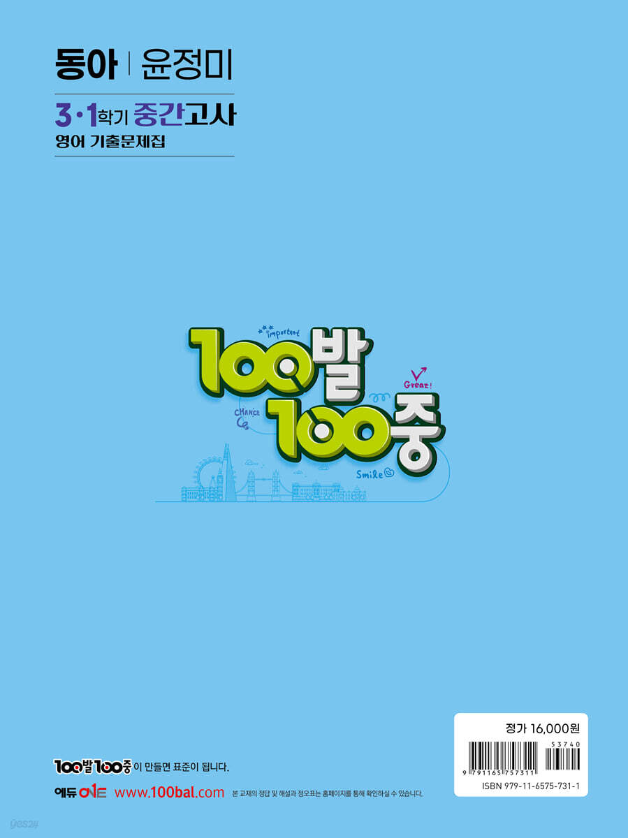- 2025학년도 3학년 교과서(2015 개정 교육 과정) 내용을 완벽히 수록 - 전국 중학교의 시험문제를 종합 분석하여 가장 높은 출제율의 예상문제 다량 수록 - 다양한 유형의 서술형 문제와 논술형 문제로 학교 시험과 수행평가 완벽 대비 2. 학습에 최적화된 구성으로 설계 - 교과서의 모든 내용이 자연스럽게 각인되는 단계별 학습 설계 - 수업 또는 자기주도학습을 통해 학습 내용을 완벽하게 습득할 수 있는 구성 3. 출판사별 맞춤형 교재 제작 - 3학년 12종 영어 교과서별 특성과 내용을 심층 분석한 맞춤형 교재 제공 - 풍부한 예문과 자세한 설명을 통해 부족한 학습 보충 가능 ※ 교재 구성별 특징 1. 교과서 속 핵심 어휘 / 교과서 어휘 다지기 Step 1, 2 교과서 핵심 어휘 및 표현 정리와 함께 단계별 확인 학습 문제를 제시함으로써 어휘를 완벽히 다질 수 있도록 함 2. 교과서 속 핵심 대화 / 교과서 대화 모두 보기 / 교과서 대화 다지기 Step 1, 2교과서 핵심 의사소통 및 단원 내 모든 대화문의 꼼꼼한 분석과 함께 단계별 확인 학습 문제를 제시함으로써의사소통 기능을 완벽히 다질 수 있도록 함 3. 교과서 속 핵심 문법 / 교과서 문법 다지기 Step 1, 2 / 서술형 교과서 핵심 문법과 확장된 개념을 통해 고난도 문항에 완벽히 대비하고, 다양한 쓰기 문제를 통해 서술형 문항에도 철저하게 대비할 수 있도록 함 4. 교과서 속 핵심 본문 / 교과서 본문 다지기 / 교과서 속 기타 지문 끊어 읽기와 구문 분석, 단답형 문제, 빈칸 완성 문제를 통해 교과서 본문을 확실하게 학습할 수 있게 하고, 교과서 내 기타 지문들을 모두 수록하여 점검할 수 있도록 함 5. 영역별 실력 굳히기 어휘, 대화, 문법, 독해의 각 영역별로 서술형 및 논술형 문제를 포함한 다양한 문제들을 풀어봄으로써 학교시험에 적응 할 수 있도록 함 6. 학교시험 100점 맞기 Step 1, 2 실전에 가까운 기출 유형 문제를 풀며 다시 한 번 실력을 점검함으로써 시험에 완벽 대비할 수 있도록 함 7. 서술형으로 끝내기 / 창의 서술형 다양한 유형의 서술형 문제 풀이를 통해 기본 서술형 문제뿐만 아니라 신경향 서술형 문제, 쓰기 수행평가까지 모두 대비할 수 있도록 함 8. 교과서 본문 손으로 익히기 교과서 본문을 문장 단위로 다시 써봄으로써 자기주도적인 반복 학습이 가능하도록 함 9. X-10(특별부록) Part I(시험대비 암기노트) - 교과서 어휘 및 표현, 대화 2단계, 본문 5단계의 단계별 쓰기 강화 훈련 수록 - 시험에 나올 만한 교과서 핵심 문장 복습 코너 수록 Part II(최종점검 모의고사) - 실제 기출 문제와 동일한 유형의 문제들을 단원별로 풀어봄으로써 실전에서 고득점을 받을 수 있도록 구성 |