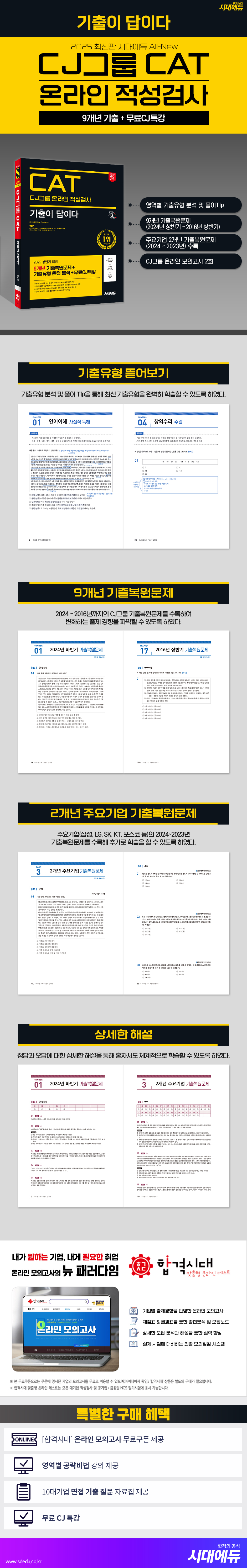 1. 기출유형 뜯어보기(유형분석 + 풀이 Tip) 2. 2024 ~ 2016년 9개년 CAT 기출복원문제 3. 2024 ~ 2023년 2개년 주요기업 기출복원문제 [특별혜택] 1. [합격시대] CJ그룹 온라인 모의고사 무료쿠폰 2. 10대기업 면접 기출 질문 자료집 3. 영역별 공략비법 강의 4. 무료CJ특강 |
