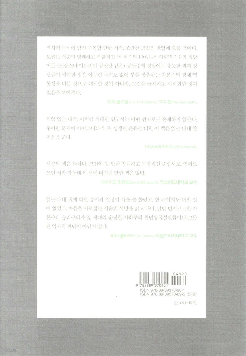 1책(1부)은 제2인터내셔널 결성부터 1945년 2차 세계대전까지 다룬다. 독일 사회민주당을 비롯한 서유럽 사회주의 정당의 등장과 두 차례 세계대전을 치르며 개별 민족국가와 정치적으로 분리될 수 없었던 사회주의 정당의 운명을 설명한다. 2차 세계대전 이후인 1945부터 1975년까지 지속된 자본주의 ‘영광의 30년’을 다룬 2책(2~5부)은 사회주의 정당의 집권과 변화를 다룬다. 서유럽 주요 좌파 정당이 직면한 정치권력의 문제와 제약, 선거 정치의 요구를 탐색한다. 이 기간은 사회주의 정당이 진정으로 권력을 바랄 수 있었으며, 민주정치의 만만찮은 한계에 부딪힌 때다. 자본주의 영광의 30년이 끝나는 1975년부터 1990년대 중반까지 20년을 다룬 3책(6~7부)은 자본주의 대호황의 종말과 함께 등장하는 신자유주의, 베를린장벽의 붕괴가 상징하는 공산주의의 몰락, 그에 따른 좌파 정당의 명암을 살펴본다. 짧지 않은 2014년판 서문에서는 세계시장에 자유롭게 작동하는 신자유주의에 도전하기는커녕 여전히 민족국가에 머무르며 수세에 몰린 채 새로운 비전을 제시하지 못하는 좌파 정당들의 암울한 현주소를 이야기한다. 『사회주의 100년』은 에릭 홉스봄의 말처럼 서유럽에서 사회주의가 지난 100년간 얻은 주요 성과인 자본주의를 문명화하는 과정을 보여주는 것이기도 하지만, 동시에 유럽 사회주의 정당들이 발전해가면서 필요에 따라 자본주의와 공존할 수밖에 없었고, 빌리 브란트가 ‘최종 목적의 신학’이라고 부른 자본주의의 폐기를 단념하는 과정을 보여주는 것이기도 하다. 지은이는 1970~1980년대에 케인스주의의 종언과 더불어 방향성을 상실함에 따라 사회주의는 쇠약해졌고, 이제 사회주의는 자본주의에 대한 설득력 있는 대안으로서 그 생명력을 다했다고 말한다. 만일 유럽 사회민주주의 정당들이 EU 전체를 아우르는 사회 안전망을 구축하거나 재분배를 위한 재정 정책을 개발하는 등 공동 정책을 개발했다면 사회주의가 여전히 살아남아 번성했을지도 모른다며, 사회민주주의가 민족국가라는 외피를 벗어던지지 못한 아쉬움을 표현한다. 그러면서도 진보에 대한 믿음, 지금보다 좀더 바람직한 상태로 나아갈 수 있을 것이라는 가정, 인류의 고난을 덜어줄 수도, 어쩌면 없앨 수도 있다는 생각… 이런 신념에 헌신하는 정치적 운동이 없다면 세상은 어떻게 되겠는가? 그런 믿음이 반드시 ‘사실’일 필요는 없다. 반드시 필요한 것은 그 믿음을 놓지 않는 것이라고 덧붙인다. |