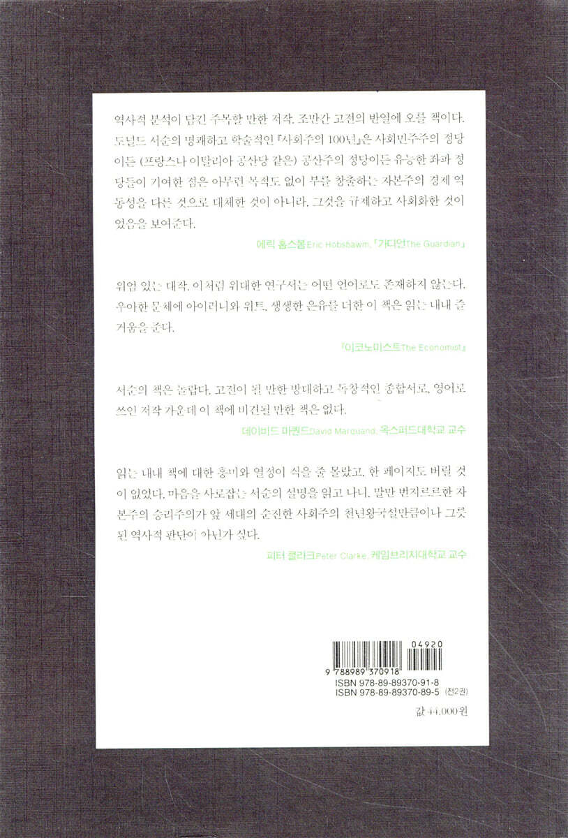 1책(1부)은 제2인터내셔널 결성부터 1945년 2차 세계대전까지 다룬다. 독일 사회민주당을 비롯한 서유럽 사회주의 정당의 등장과 두 차례 세계대전을 치르며 개별 민족국가와 정치적으로 분리될 수 없었던 사회주의 정당의 운명을 설명한다. 2차 세계대전 이후인 1945부터 1975년까지 지속된 자본주의 ‘영광의 30년’을 다룬 2책(2~5부)은 사회주의 정당의 집권과 변화를 다룬다. 서유럽 주요 좌파 정당이 직면한 정치권력의 문제와 제약, 선거 정치의 요구를 탐색한다. 이 기간은 사회주의 정당이 진정으로 권력을 바랄 수 있었으며, 민주정치의 만만찮은 한계에 부딪힌 때다. 자본주의 영광의 30년이 끝나는 1975년부터 1990년대 중반까지 20년을 다룬 3책(6~7부)은 자본주의 대호황의 종말과 함께 등장하는 신자유주의, 베를린장벽의 붕괴가 상징하는 공산주의의 몰락, 그에 따른 좌파 정당의 명암을 살펴본다. 짧지 않은 2014년판 서문에서는 세계시장에 자유롭게 작동하는 신자유주의에 도전하기는커녕 여전히 민족국가에 머무르며 수세에 몰린 채 새로운 비전을 제시하지 못하는 좌파 정당들의 암울한 현주소를 이야기한다. 『사회주의 100년』은 에릭 홉스봄의 말처럼 서유럽에서 사회주의가 지난 100년간 얻은 주요 성과인 자본주의를 문명화하는 과정을 보여주는 것이기도 하지만, 동시에 유럽 사회주의 정당들이 발전해가면서 필요에 따라 자본주의와 공존할 수밖에 없었고, 빌리 브란트가 ‘최종 목적의 신학’이라고 부른 자본주의의 폐기를 단념하는 과정을 보여주는 것이기도 하다. 지은이는 1970~1980년대에 케인스주의의 종언과 더불어 방향성을 상실함에 따라 사회주의는 쇠약해졌고, 이제 사회주의는 자본주의에 대한 설득력 있는 대안으로서 그 생명력을 다했다고 말한다. 만일 유럽 사회민주주의 정당들이 EU 전체를 아우르는 사회 안전망을 구축하거나 재분배를 위한 재정 정책을 개발하는 등 공동 정책을 개발했다면 사회주의가 여전히 살아남아 번성했을지도 모른다며, 사회민주주의가 민족국가라는 외피를 벗어던지지 못한 아쉬움을 표현한다. 그러면서도 진보에 대한 믿음, 지금보다 좀더 바람직한 상태로 나아갈 수 있을 것이라는 가정, 인류의 고난을 덜어줄 수도, 어쩌면 없앨 수도 있다는 생각… 이런 신념에 헌신하는 정치적 운동이 없다면 세상은 어떻게 되겠는가? 그런 믿음이 반드시 ‘사실’일 필요는 없다. 반드시 필요한 것은 그 믿음을 놓지 않는 것이라고 덧붙인다. |