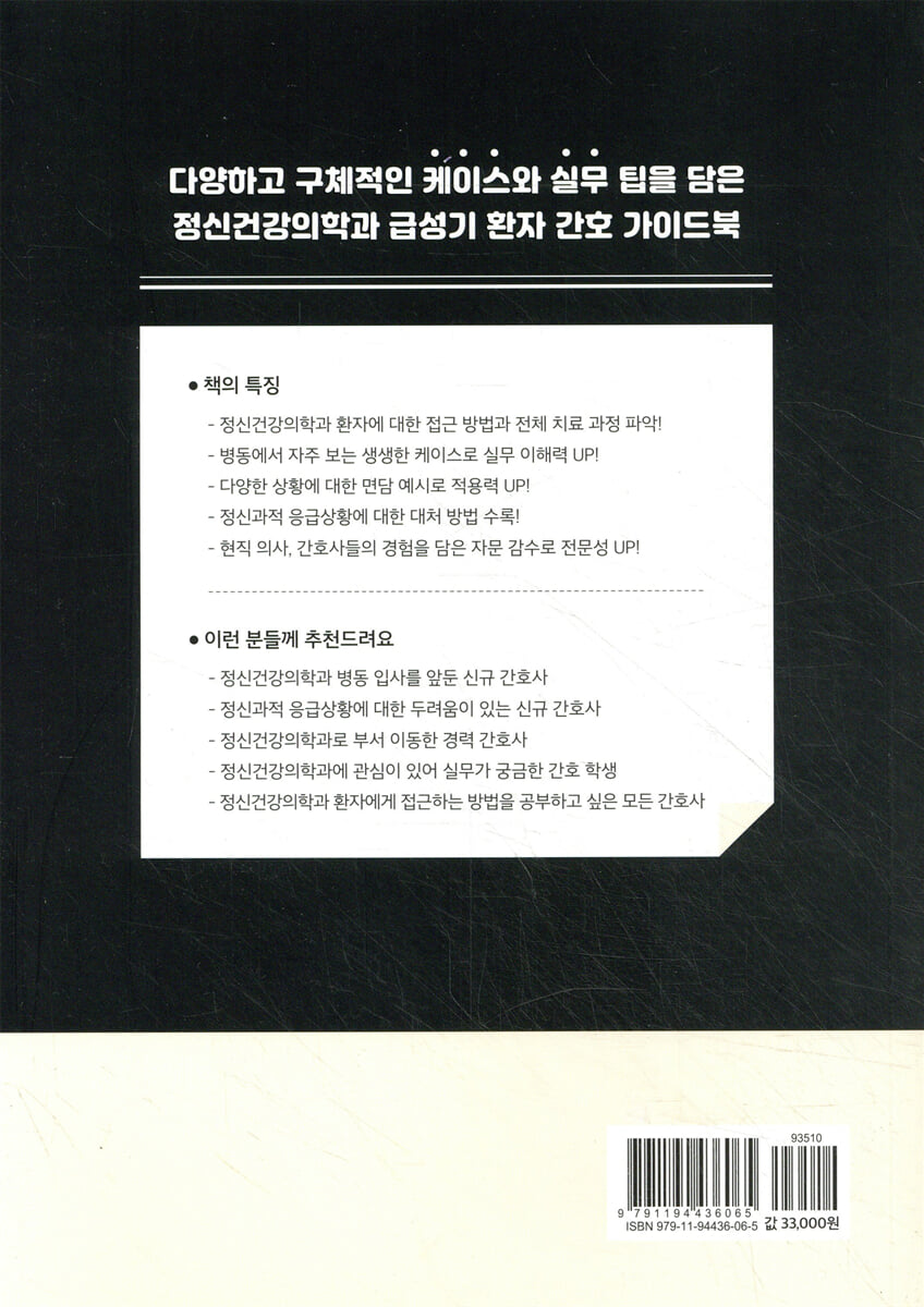 실제 임상에서 볼 수 있는 다양한 사례들을 통해서 정신건강의학과 간호사라면 알아야 하는 내용을 잘 제시해 준 책입니다. 다른 질환과는 성격이 매우 다른 정신건강의학과 질환들을 어떻게 다루어야 할지 모르는 선생님들께 좋은 참고서가 될 것입니다. 말 한마디, 몸짓 하나마다 긴장할 신규 간호사뿐만 아니라 정신건강의학과 간호사를 양성해야 하는 프리셉터 간호사에게도 좋은 자료가 될 것이라 생각합니다. - 여장현 (서울대학교병원 성인 보호병동 간호사)
