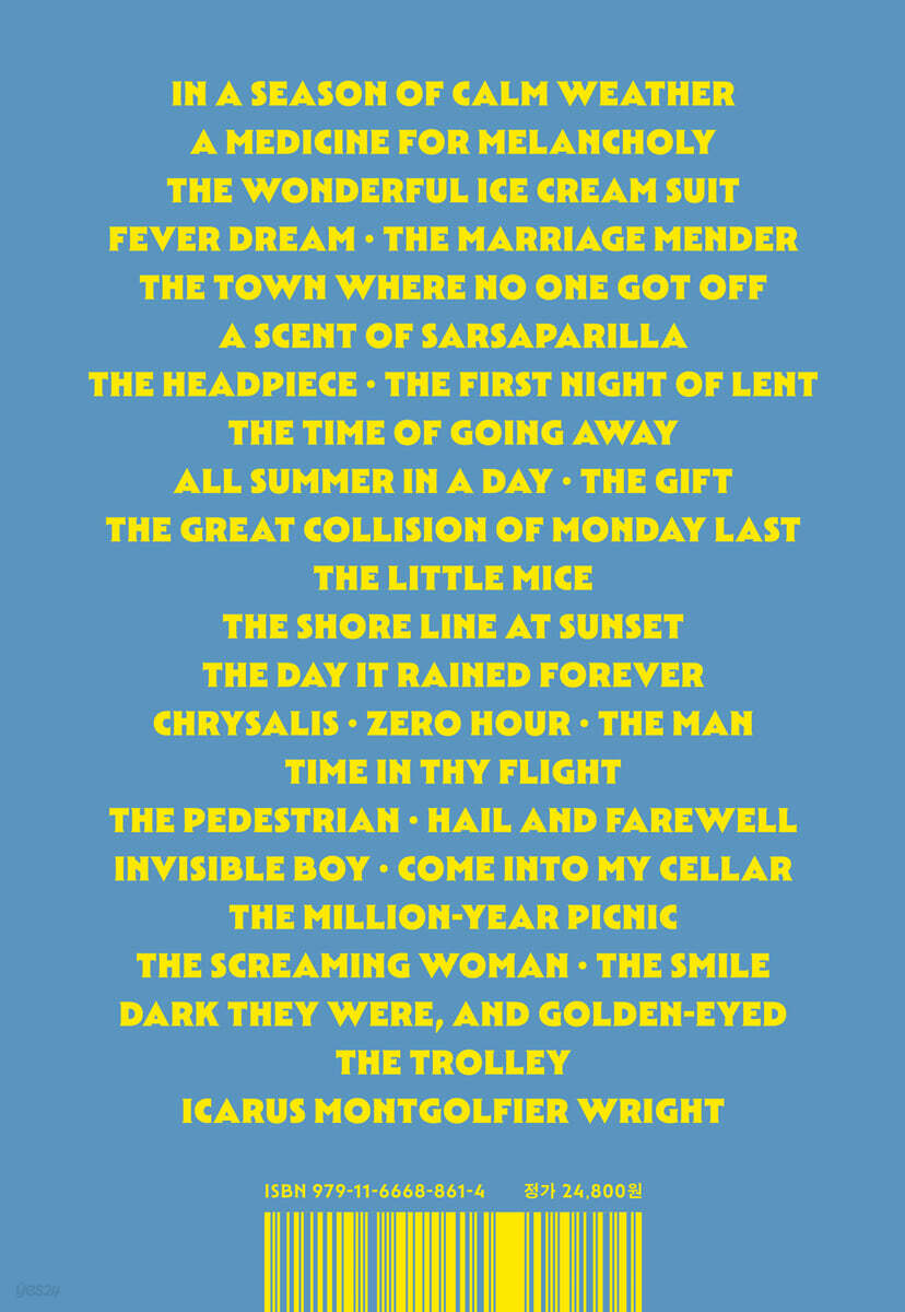 어느 잔잔한 날에_13 A MEDICINE FOR MELANCHOLY 멜랑콜리의 묘약_23 THE WONDERFUL ICE CREAM SUIT 멋진 바닐라 아이스크림색 양복_39 FEVER DREAM 열병_75 THE MARRIAGE MENDER 결혼생활을 고쳐드립니다_87 THE TOWN WHERE NO ONE GOT OFF 아무도 내리지 않는 역_97 A SCENT OF SARSAPARILLA 사르사 뿌리 음료수 냄새_111 THE HEADPIECE 레몬 씨의 가발_123 THE FIRST NIGHT OF LENT 사순절 첫날밤_137 THE TIME OF GOING AWAY 길 떠날 시간_149 ALL SUMMER IN A DAY 온 여름을 이 하루에_161 THE GIFT 크리스마스 선물_171 THE GREAT COLLISION OF MONDAY LAST 월요일의 큰 충돌사고_177 THE LITTLE MICE 작은 생쥐 부부_189 THE SHORE LINE AT SUNSET 석양의 바닷가_199 THE DAY IT RAINED FOREVER 영원히 비가 내린 날_215 CHRYSALIS 번데기가 된 사나이_231 ZERO HOUR 침공 놀이_263 THE MAN 그분_281 TIME IN THY FLIGHT 그대의 시간여행_301 THE PEDESTRIAN 고독한 산책자_311 HAIL AND FAREWELL 어서 와, 잘 가_319 INVISIBLE BOY 보이지 않는 소년_331 COME INTO MY CELLAR 나의 지하실로 오세요_347 THE MILLION-YEAR PICNIC 백만 년 동안의 소풍_373 THE SCREAMING WOMAN 비명 지르는 여자_389 THE SMILE 미소_409 DARK THEY WERE, AND GOLDEN-EYED 검은 얼굴, 금빛 눈동자_419 THE TROLLEY 마지막 전차 여행_441 ICARUS MONTGOLFIER WRIGHT 이카로스 몽골피에 라이트_449 |