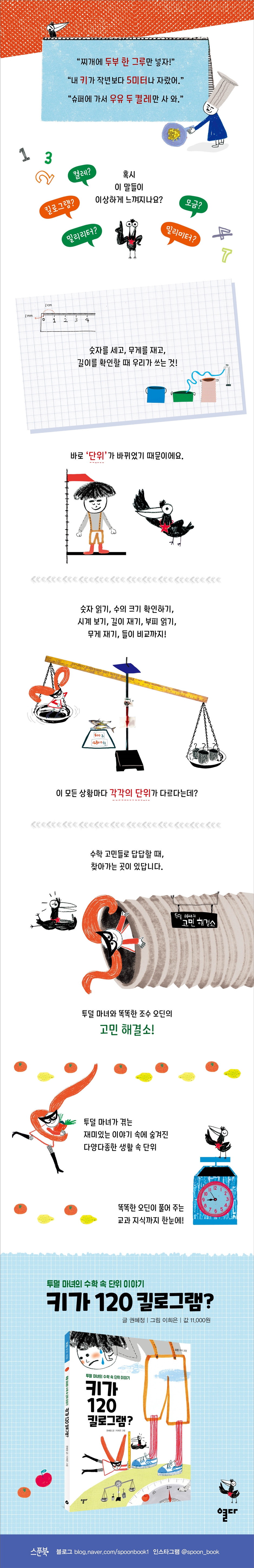 우리가 매일 만나는 다양한 단위약속 시간을 정할 때나 물건을 사고 거스름돈을 받을 때 등 단위는 우리가 매일 사용하는 것입니다. 그만큼 단위를 제대로 알고 쓰는 것은 매우 중요한 일이지요. 세상에는 수없이 많은 단위가 있지만 시 ? 분, cm ? m, mL ? L 등 우리가 평소 많이 쓰는 단위들을 골라서 준비했어요. 일상생활 속 단위를 알아 가며 단위의 중요성과 편리함을 느껴 보세요.맞춤식 코너로 단위 정복하기‘오딘의 잠깐 잘난 척’ 코너는 미로 찾기, 실험 등을 통해 단위를 설명해요. 매번 새로운 형식이기 때문에 지루할 틈이 없어요. 또 각 학년마다 배우는 단위를 모아서 한눈에 보여 주기 때문에 수준에 상관없이 누구나 쉽게 이해할 수 있어요. ‘투덜 마녀의 호기심 해결’에서는 수학 속 단위만 배우는 것이 아니에요. 저울의 종류, 시차가 생기는 까닭 등을 배우며 과학이나 사회 영역까지 수학과 단위 개념을 확장할 수 있어요.
