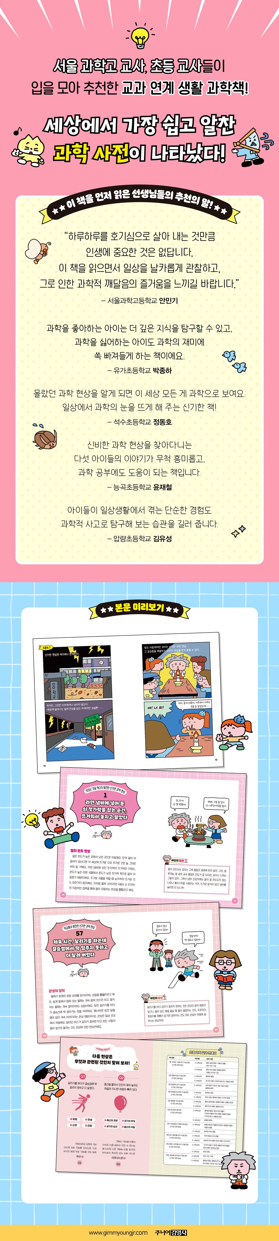 눈만 뜨면 과학 원리가 보인다고?20년 차 초등 교사가 쓴, 가장 쉬운 교과 연계 과학책!서울과학고등학교, 현직 초등 교사 20명의 강력 추천!20년 차 초등 교사가 쓴 《신기한 과학 사전》이 주니어김영사에서 출간되었다. 일상에서 흔히 일어나는 현상을 어린이의 눈높이에 맞추어 쉬운 과학 원리로 풀어낸 책이다. 한 권으로 초등 과학의 전 과정을 두루 훑어볼 수 있도록 알차게 구성했다. 우리는 하루도 빠짐없이 어떤 방식으로든 과학을 한다. 이를테면 시원한 코코아를 마시기 위해 조금 미지근한 물에 코코아를 타고 얼음을 넣는다. 어쩐지 차가운 물에서는 코코아 가루가 잘 녹지 않는 것 같아서다. 햇빛이 쨍한 날에는 검은 옷은 피하고, 모닥불을 피울 땐 부채질을 한다. 이처럼 우리의 일상에는 수없이 많은 과학 원리가 숨어 있다. 그런데 내가 목격하는 이 현상들의 원리를 막힘 없이 설명할 수 있는 아이가 얼마나 될까? 아마 대부분의 아이들은 그 현상이 학교에서 배운 것이었다는 사실만 감지할 뿐, 이내 설명을 포기할지도 모른다. 《신기한 과학 사전》은 그런 대부분의 아이들에게 맞춤한 책이다. 오랜 시간 초등학생을 가르쳐 온 저자의의 내공으로 아이들이 궁금해할 만한 62가지 현상을 뽑고, 최소한의 설명으로 어떤 책보다 쉽게 과학 원리를 풀어냈다. 서울과학고등학교와 초등 교사 20명이 먼저 읽고 강력하게 추천하는 이 책은 과학이 이렇게나 가까이에 있다는 사실을 다시 한번 일깨운다. 어린이들이 모처럼 신나게 읽을 수 있는 볼거리, 읽을거리 가득한 교양 과학책이다. 해수욕장에서 목이 마르다고 바닷물을 마시면 안 돼! 왜 그럴까?아무리 목이 말라도 바닷물을 마시면 안 된다는 사실쯤은 누구나 안다. 그런데 그 이유가 아직도 헷갈린다면? 얼려 둔 주스 병은 왜 저렇게 뚱뚱해진 것이며, 종이로 만든 냄비에 라면을 끓였는데 냄비가 왜 멀쩡한 건지 궁금한 적 있다면 이 책을 펼쳐 보자. 《신기한 과학 사전》에는 아인슈타인을 좋아하는 아인, 퀴리 부인을 좋아하는 마리, 찰스 다윈을 좋아하는 다위와 지구과학과 물리를 특히 좋아하는 레오, 《파브르 곤충기》를 열 번도 넘게 읽은 앙리까지, 다섯 친구가 등장한다. 호기심 가득한 이 어린이들이 세상에서 일어나는 신기한 과학 현상과 그 원리를 하나씩 풀어놓는다. 총 10장으로 구성된 이 책의 첫 장에서는 맛있는 것을 먹다가 발견한 현상을 다룬다. 2장과 3장에서는 각각 집과 병원에서, 4장은 하늘을 바라보다가 발견한 현상을 이야기하고 5장에서는 캠핑을 가서 발견한 현상, 6장에서는 바다, 7장에서는 시골 할머니 댁에서 발견한 현상을 살펴본다. 8장에서는 일기 예보를 보다가, 9장에서는 영화나 공연을 보다가 발견한 현상을 들려주고, 마지막 10장에서는 학교에서 발견한 현상을 다루며 아이들을 생생한 과학 현장으로 안내한다. 책을 읽은 아이들은 자기의 막연한 호기심이 어느새 지식으로 다가오는 놀라운 경험을 하게 될 것이다. 아이들의 뜬금없는 질문에 답을 고민하는 부모나 선생님, 그리고 시시때때로 과학적 호기심이 이는 모두에게 이 책을 추천한다. 간결한 설명과 재치 있는 그림으로 재미있게 배우는 생활 속 과학 이야기《신기한 과학 사전》은 한 번 읽고 마는 과학책이 아니라 물리지 않고 여러 번 읽을 만한 교양책이다. 어디를 펼쳐 보아도 나오는 재미있는 과학 현상이 아이들의 호기심을 자극하기 때문이다. 길게 이어지는 이야기가 아니라 간결한 설명과 다섯 명의 귀여운 캐릭터 역시 아이들이 좋아할 만한 구성이다. 이 덕분에 책을 한층 가볍고 유쾌하게 읽을 수 있다.한편, 책의 마지막에는 책의 내용과 교과 연계 부분을 한눈에 살펴볼 수 있는 교과 연계표를 수록했다. 초등 3학년에서 6학년까지 각 단원에서 성취하는 목표를 표기해 언제든지 필요한 부분을 찾아볼 수 있다. 아이들이 조금 더 재미있게, 조금 더 쉽게 과학을 접했으면 하는 선생님의 마음이 고스란히 녹아 있는 이 책은 초등 과학을 공부하는 학생도, 주변 모든 것에 관심이 있는 저학년 아이들에게도 유익한 책이 될 것이다.