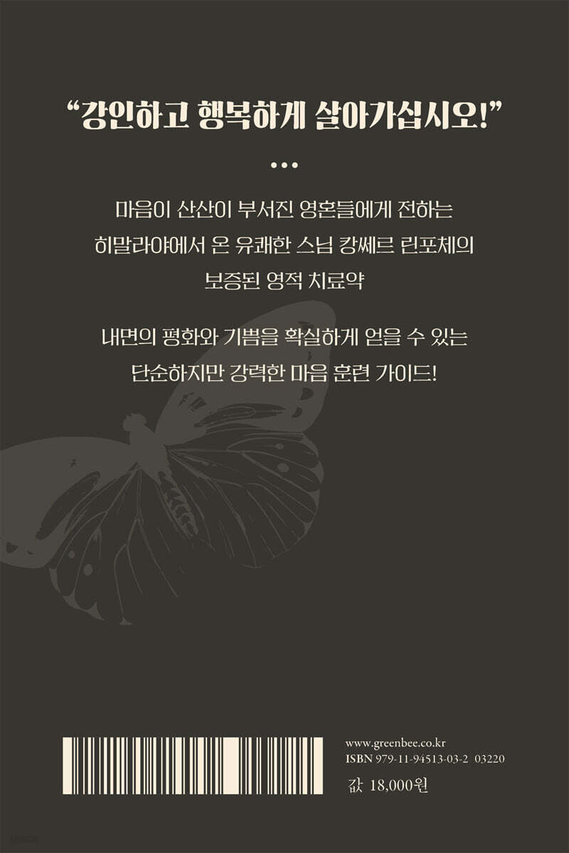 강인하고 행복하게 살아가는 법! 부서진 영혼 치유를 위한 구체적인 마음 훈련 가이드 엄청난 기술의 진보와 물질적 풍요에도 오늘날 세계에는 두려움, 슬픔, 비탄, 분노, 불안, 분열, 외로움이 만연해 있다. 그런 가운데 사람들은 간절하게 행복을 원한다. 그저 잠깐 스쳐 지나가고 마는 행복이 아니라, 안정적이고 믿고 기댈 수 있는 ‘기쁨’을 원한다. 이에 대해 히말라야에서 온 스님 캉쎄르 린포체는 분명하게 말한다. 행복은 외부에 존재하는 것이 아니라 내면에서 이루어지는 작업이라고! 『기쁨을 찾는 마음 훈련 가이드』는 제목 그대로 마음을 훈련하여 “강인하고 행복하게” 살 수 있도록 돕는 안내서다. 우리의 일상은 인간관계에서 오는 괴로움과 정서적 불안으로 채워지기 일쑤다. 원하는 대로 일이 되지 않아 화를 내게 되는 경우도 많다. 일상적인 짜증이나 불만 같은 부정적인 감정 외에도 가까운 이의 갑작스러운 죽음처럼 예상치 못한 사건은 우리를 큰 고통과 슬픔에 빠트린다. 캉쎄르 린포체는 그러한 모든 일을 피하지 않고 정면 돌파하면서 ‘지혜와 자비를 기르는 마음 훈련법’을 『기쁨을 찾는 마음 훈련 가이드』에 소개하고 있다. 다섯 살에 남인도에서 훌륭한 스승들을 만나 불교 수행의 길을 걷기 시작한 캉쎄르 린포체는 48세에 인도 규뙤 승원의 라마움제로 임명된, 학식과 수행이 모두 뛰어난 스님이다. 그는 “부서진 영혼을 치유하는 약을 제공”하는 데 자신의 모든 시간을 쓰고 있다. 배고픈 사람에게는 음식을, 배울 기회가 없는 아이들에게는 교육을 제공하고 있고, 신체적 질병을 완화하는 프로그램도 개발하고 있다. 나아가 내면의 혼란을 가라앉히는 지혜를 전달하고자 책을 쓰는 한편 한국, 몽골, 미국, 베트남, 대만 등에서 무료 온라인 수업과 명상 세션들도 진행하고 있다. 인생을 바라보는 관점을 바꾸면 행복해질 수 있다. 그러려면 삶의 진리인 무상과 괴로움의 원인인 GAS, 그리고 자기 집착을 제대로 이해해야 한다. 그런 후 자비를 실천하여 날마다 기쁜 날을 맞게 되는 구체적인 훈련법을 『기쁨을 찾는 마음 훈련 가이드』가 제시하고 있다. 우리는 모두 연결되어 있다. ‘함께’라는 아름다운 진실에 도달하면 우리는 어떤 문제를 만나도 “강인하고 행복하게!” 살게 된다. 모든 것은 변한다! 변화에서 기쁨 찾기 행복한 삶을 위한 첫 번째 관점은 삶의 무상함을 깨닫는 것이다. 즉 모든 것은 변한다는 사실을 마음 깊이 받아들여야 한다. 복권에 당첨되었을 때 ‘왜 하필 나야?’라고 생각하는 사람이 있을까? 그런데 품귀 현상이 일어나 화장지를 살 수 없는 상황에 맞닥뜨린다면 ‘왜 하필 나지?’라고 생각할 것이다. 이는 좋은 것만 받아들이고 나쁜 것을 애써 거부하는 태도이다. 하지만 인생에서 좋은 일과 나쁜 일은 언제나 필연적으로 같이 찾아온다. ‘왜 하필 나야?’라는 생각은 자기 연민에 사로잡히게 만들어 눈앞에 벌어진 일을 해결하는 데에 아무런 도움이 되지 않는다. ‘왜 나지?’에 갇히지 말고 ‘삶은 항상 변화하고 있고 영원한 것은 없다’라는 것을 이해해야 한다. 모든 것이 변한다는 사실은 영원할 것만 같은 눈앞의 문제 역시 반드시 지나감을 뜻한다. 이 진리를 받아들이면 변화와 그것이 가져오는 다양성이 우리의 유한한 삶을 더욱 즐겁게 만든다는 것을 깨닫게 된다. 끊임없는 걱정은 자신을 속이는 이야기를 꾸며내고, 내면에 부정적인 대화를 끌어내어 더 큰 고통을 만든다. 변화의 필연성에 초점을 맞추고 특히 자신에게 친절해지면 직면한 문제와 그로 인한 아픔은 아무리 강력할지라도 반드시 지나가게 되어 있다. 구름이 걷히고 태양이 다시 비치는 것처럼. 나쁜 GAS와 자기 집착으로부터 진정으로 해방되기 위하여 행복한 삶을 살아가기 위한 두 번째 관점은 자기 집착에서 벗어나서 상호의존성을 이해하는 자기 믿음의 관점이다. 부정적인 감정들과 GAS는 대부분 자기 집착에서 비롯된다. ‘GAS’는 탐욕(Greed), 분노(Anger), 어리석음(Stupidity)의 영어 앞 글자를 딴 말로, 불교 작가이자 교사이며 학자인 케네스 K. 다나카가 탐진치(貪瞋痴)를 일러 재치 있게 만든 말이다. 관점을 변화시키기 위해 캉쎄르 린포체는 우리에게 우리가 세상과의 관계에서 얻는 것들을 생각해 볼 것을 권한다. 이를테면 신선한 공기를 마시거나 깨끗한 물을 마실 수 있다는 사실에 감사하는 일 같은 것들이다. 이러한 유익한 감정을 더 밀고 나가면서 우선 가까운 이들에게 감사와 연민을 보내는 태도를 지속하다 보면 우리의 안과 밖에서 긍정적인 변화가 일어난다. 자신이 아닌 타인에게 베푸는 이타심이 기쁨과 관련한 뇌 부위를 자극한다는 것은 과학적으로도 입증되었다. 기부 행위를 할 때 우리 뇌는 엔도르핀을 내보내 ‘헬퍼스 하이’(Helper’s High)의 상태, 그러니까 남을 도움으로써 쾌감을 느끼는 상태에 이른다. 즉 이타적인 행동은 사회적 연결, 즐거움, 신뢰와 관련된 뇌 영역을 활성화하는 것이다. 이타심을 개발하는 수행을 지속하다 보면 “오래된 자아 개념을 깨뜨리고, 우리가 주변 세계와 상호 연결되어 있다는 진실을 목격”하게 된다. 불교에서 말