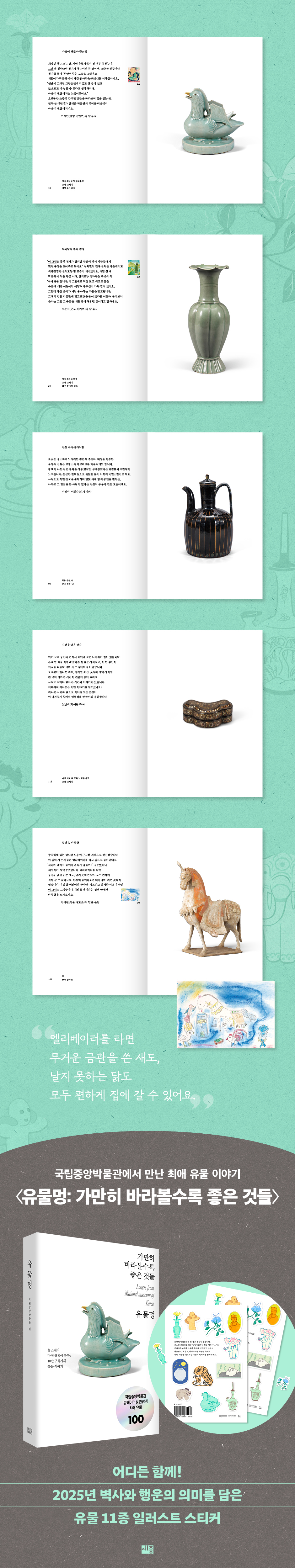 여기 한자리에 모인 물건은 한때 누군가의 애장품이었습니다. 박물관 큐레이터와 관람객이 뽑은 최애 유물은 우리 일상에 놓인 물건들처럼 각기 쓰임이 있었습니다. 오래된 물건은 긴 시간을 여행해 우리에게 도착했습니다. 바라볼수록 좋은 것들이 이 책에 담겼습니다. 같은 것을 보아도 만 명에게는 만 가지 이야기가 있다고 느낀 순간이 많았습니다. 당신이 어느 계절에 있든 지금 내게 좋은 것과 함께하는 시간을 소홀히 하지 않으면 좋겠습니다. 큰맘 먹지 않고도, 떠나지 않고도 여행하는 법이 박물관에 있습니다. 오늘 내게 좋을 것을 찾는 마음으로 조금 천천히 책장을 넘겨보세요. ---「프롤로그 _ 정명희 (국립중앙박물관 전시과장)」중에서 발걸음이 가는 대로 여행하다 보면, 그 지역의 맛있는 특산물과 인연을 맺게 됩니다. 조선시대의 여행자들은 찬합을 지니고 다녔다는군요. 어쩌면 그 찬합 1층에는 윤기 나는 여주 쌀로 지은 밥이 잠을 자고, 2층에는 울진 송이버섯 볶음이 춤을 추고, 3층에는 정선 찰옥수수가 삐죽 얼굴을 내밀고 있었을지도 몰라요. 그 시절의 사람들은 무엇을 먹으며 여행을 음미했을까요? ---「행복을 층층이_찬합」중에서 이건 남부끄러운 이야기일까요? 나이 오십이 넘도록, 한 번도 집에 내 책상을 가져본 적이 없었어요. 항상 조금씩 빠듯하고 바쁜 삶이었습니다. 그런데 10여 년 전, 자녀들이 다 대학을 가고 나니 욕심이 생기더군요. 덜컥 대학교에 지원서를 쓰고 합격까지 했습니다. 막내가 쓰던 방을 내 공부방으로 꾸미고, 아이들 입학시킬 때처럼 문구도 샀어요. 어느 날 남편이 아끼던 도자기 필통이 내 책상 위에 놓여 있더라고요. 나를 위한 일에 응원을 받은 그때의 기분은 말로 표현하기 어렵네요. 박물관에서 멋진 필통만 보면 지금도 뭉클한 눈물이 나오니 이것 참 큰일이지요. ---「나만의 책상_백자 투각 파초무늬 필통」중에서 여기 고개를 숙여 울음을 삼키고 있는 신라 여인이 있습니다. 얼굴에 천을 덮은 주검 앞에 내려앉은 깊은 슬픔, 말로 다 하지 못하는 마음을 손으로 꾹꾹 눌러 만든 모습이 보는 이의 가슴을 먹먹하게 합니다. 생동감 넘치는 축제의 장면들처럼 보이는 토우들을 바라보는 동안에는 나도 모르게 그 세상 속으로 빠져듭니다. 그러나 ‘신라의 피에타’라고 이름을 붙인 이 여인 앞에서는 아픈 현실을 깨닫습니다. 전시실을 나오면서 그 마음을 같이 느끼는 사람들이 있다고 여인을 위로하고 싶어집니다. ---「신라의 피에타_죽음의 순간을 지키는 사람 토우」중에서 독서실 칸막이 아래서 시험 준비를 하다 보면, 문득 이 좁은 자리가 내 무덤인 것만 같은 생각이 들 때가 있습니다. 그래서 미래에 대한 걱정과 불안이 찾아오는 날엔 무령왕릉 진묘수 사진을 찾아봅니다. 겉모습은 아담하고 귀엽지만, 어둠 속에서도 용맹하게 제일 앞에 서서 왕릉을 지키고 있던 진묘수. 아직은 아니지만, 저도 언젠가 세상에 멋지고 늠름한 모습으로 발견될 날을 상상합니다. 진묘수의 고독에 비하면 젊은 날 고생쯤이야 사서도 할 수 있어요. ‘나는 발효의 민족, 묵을수록 더 강해지는 대한민국의 취준생이다’ 다짐하면서, 집으로 가는 깜깜한 길을 씩씩하게 걸어가곤 합니다. ---「어두워도 씩씩하게_진묘수」중에서 |