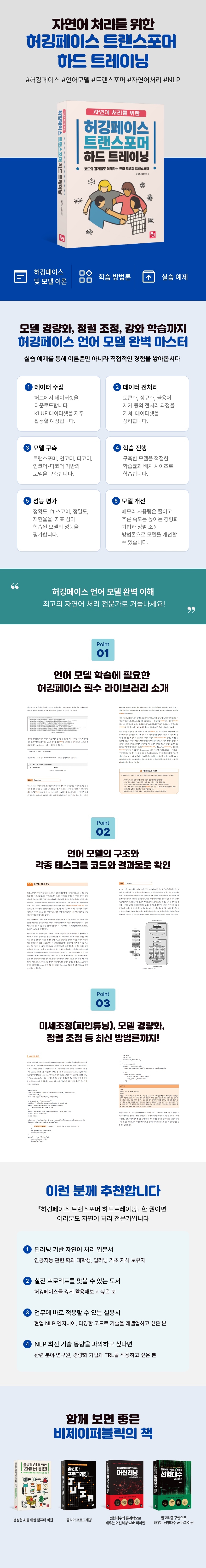 허깅페이스 라이브러리 하드 트레이닝 1장에서는 허깅페이스 허브에 등록된 모델 및 데이터셋을 확인해보고 자연어 처리와 허깅페이스의 관계에 대해 알아봅니다. 2장에서는 허깅페이스를 하드 트레이닝해보기에 앞서 구글 코랩 환경을 구축하고 구글 드라이브를 마운트합니다. 3장에서는 Datasets 라이브러리와 Transformers 라이브러리를 활용하여 토크나이저 및 모델 준비, KLUE 데이터셋 전처리, 학습 파라미터 선정 및 학습 진행과 성능 평가를 실습해봅니다. 4장에서는 사전학습 단계부터 직접 진행해야 하는 경우를 대비하여 Tokenizers 라이브러리에 대해 살펴봅니다. 그리고 정확도, f1 스코어, 정밀도, 재현율을 기준으로 모델을 평가하는 Evaluate 라이브러리에 대해 알아봅니다. 5장에서는 트랜스포머 모델, 인코더 기반 모델, 디코더 기반 모델, 인코더-디코더 기반 모델의 기본 구조를 살펴보고 문장 분류, 다중 선택, 토큰 분류, 질의 응답, 조건부 생성, 인과적 언어 모델(Causal LM) 태스크의 코드와 결과를 확인해봅니다. 6장에서는 모델 구조별 대표 태스크에 대해 미세조정(파인튜닝, fine-tuning)을 진행합니다. 확률적 특징의 이해를 돕는 수식과 꼭 필요한 메서드의 파라미터까지 함께 살펴볼 수 있습니다. 7장에서는 PEFT, 양자화, QLoRA 미세조정과 같이 모델의 메모리 사용량은 줄이고 추론 속도는 높이는 경량화 기법에 대해 알아봅니다. 8장에서는 RLHF, SFT, PPO, DPO, KTO, CPO, ORPO, Best-of-N 샘플링, 보상 모델 트레이닝 등 정렬 조정에 해당하는 최신 방법론과 이를 강화학습을 위한 트랜스포머(TRL)를 통해 활용하는 방식에 대해 알아봅니다. 이 책이 필요한 독자 - 자연어 처리 분야에서의 인공지능에 대해 알고 싶은 분 - 언어 모델을 처음 접하는 대학생 또는 대학원생 - 허깅페이스 코드를 실습해보고 싶은 자연어 처리 초보자 - 언어 모델의 구조와 다양한 태스크를 샅샅이 살펴보고 싶은 분 - 허깅페이스에 대한 이해도는 있지만, 직접 부딪혀가며 코드로 기술을 레벨업하고 싶은 분 - 경량화 기법과 강화학습을 위한 트랜스포머에 대해 궁금한 분 |