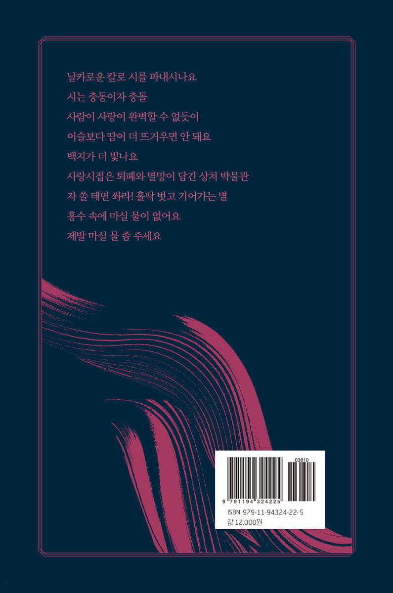 조금 절뚝이는 발걸음으로 일렁이는 햇살 속으로 걸어 들어간다 두 사람은 각자 제 방향으로 일단 첫걸음을 떼기 시작한다” ---「엑스」 중에서 “아무리 다 주려 해도 다 주지 못하고 아무리 다 꺼내도 다 꺼내지지 않아 달이 뜰 때 그때까지 참고 있던 문 플라워 고백처럼 터뜨리는 꽃말이 골목 빈터에 첫 물방울처럼 떨어진다 내 두 눈 실핏줄 모두 터졌다” ---「문 플라워」 중에서 “날카로운 칼로 시를 파내시나요 시는 충동이자 충돌 사람이 사랑이 완벽할 수 없듯이 이슬보다 땀이 더 뜨거우면 안 돼요 백지가 더 빛나요 사랑시집은 퇴폐와 멸망이 담긴 상처 박물관 자 쏠 테면 쏴라! 홀딱 벗고 기어가는 별 홍수 속에 마실 물이 없어요 제발 마실 물 좀 주세요” ---「홍수 속에 마실 물이 없어요」 중에서 “나는 내 길을 가고 있어 그게 내 권력이야” ---「몸에 털이 난 아침」 중에서 “나를 만날 수 있는 것은 나뿐인가 하늘 아래 가득한 질문 하나” ---「산티아고 순례길」 중에서 “당신의 깃털을 사납게 뽑아 당신의 몸에 시를 새기기 시작한다 원시림으로 다시 돌아가더라도 내 사랑을 당신 몸속에 시로 새겨 두기로 한다” ---「야생조」 중에서 |
