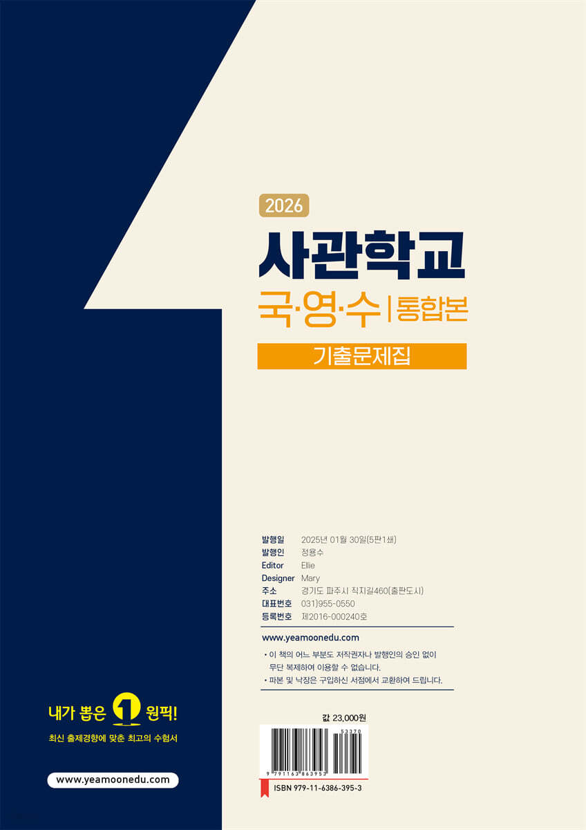 2025학년도 기출 문제를 포함하여 반드시 풀어보아야 할 3개년 기출문제를 수록하였습니다. 특히 최신 출제기준에 따라 시험범위에 해당하지 않는 문제들을 따로 표시하여 효율적인 학습을 할 수 있도록 구성하였습니다. 2026학년도 시험 완벽 대비를 위한, 기출모의고사 수록 2026학년도 시험 완벽 대비를 위해 최신 출제기준에 꼭 맞춰 과년도 기출문제를 재구성한 기출모의고사를 수록하였습니다. 이로 인해 수험생 여러분들은 최신 출제기준을 확실하게 분석하고 빈출 유형과 패턴을 파악하여, 개념을 빠르게 확립할 수 있습니다. 직관적인 오답 분석과 핵심만 짚어 주는 명쾌한 해설! 각 문항마다 꼼꼼한 분석과 명쾌한 오답해설을 제공하여 수험생 여러분들이 문제를 효율적으로 이해할 수 있도록 하였습니다. 또한, 국어 문학 작품과 영어 지문 해설을 체계적으로 제공하였으며, 수학 영역의 경우 다양한 시각 자료를 활용하여 2026학년도 시험에 확실한 대비가 가능합니다. 빠르고 효율적인 학습을 위한 분권 구성과 OMR 수록 수험생 여러분이 각 회차별 기출문제의 풀이와 정답 확인이 편리하도록 문제편과 해설편 두 권으로 나누어 구성되었습니다. 또한 빠른 정답표를 수록하여 문제 풀이 후 정답만 빠르게 확인할 수 있도록 하였으며, 도서 말미에는 영역별 빈출 이론 및 공식 등을 수록하여 언제 어디서든 학습할 수 있고, 마킹 연습용 OMR 카드, 오답노트 PDF까지 제공하여 실전 감각을 최대화할 수 있습니다. |