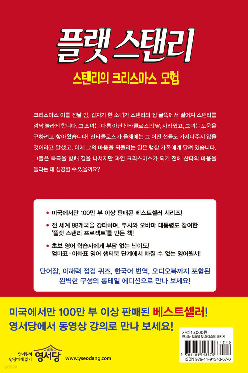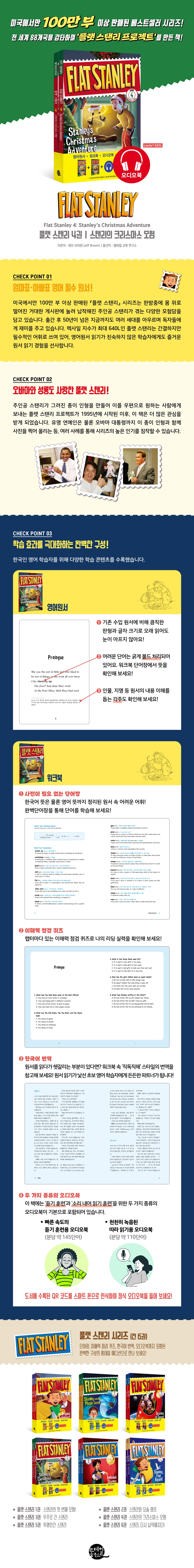 1. 미국 초등학생 사이에서 저스틴 비버보다 더 유명한 소년 플랫 스탠리! 미국 작가 제프 브라운(Jeff Brown)이 만든 쓴 『플랫 스탠리』 시리즈는, 한밤중에 몸 위로 떨어진 거대한 게시판에 눌려 납작해진 스탠리가 겪는 다양한 모험을 담고 있습니다. 아동 도서이지만 부모님과 선생님에게도 큰 사랑을 받으며 100만 부 이상 판매되며 50년이 넘은 지금까지 큰 사랑을 받고 있습니다. 또한 주인공 스탠리가 그려진 종이 인형을 만들어 우편으로 보내는 플랫 스탠리 프로젝트가 1995년부터 시작되면서 이 시리즈는 더 많은 관심을 받고 있습니다. 유명 연예인은 물론이고, 심지어 오바마 대통령까지 스탠리 종이 인형과 함께 있는 사진을 찍어 공유하는 모습을 보면 스탠리의 인기를 짐작할 수 있습니다. 2. 엄마표·아빠표 영어 필수 원서! 국내에서도 『플랫 스탠리』 시리즈는 ‘엄마표·아빠표 영어’를 하는 부모님과 초보 영어 학습자라면 반드시 읽어야 하는 영어원서로 자리 잡았습니다. 간결하지만 필수적인 어휘로 쓰여 있어 원서 읽기에 두려움을 갖는 학습자에게도 영어로 책을 읽는 재미를 선사합니다. 3. 학습 효과를 극대화하는 완벽한 구성! 롱테일북스에서는 국내외에서 검증받은 영어원서에, 학습 효과를 극대화하는 다양한 장치를 덧붙였습니다. ㆍ 영어원서: 본문에 나온 어려운 어휘에 볼드 처리가 되어 있어 단어를 더욱 분명히 인지하며 자연스럽게 암기하게 됩니다. ㆍ 단어장: 원서에 나온 어려운 어휘가 ‘한영’은 물론 ‘영영’ 의미까지 완벽하게 정리되어 있으며, 반복되는 단어까지 넣어 두어 자연스럽게 복습이 되도록 구성했습니다. ㆍ 번역: 영어와 비교할 수 있도록 직역에 가까운 번역을 담았습니다. 원서 읽기에 익숙하지 않는 초보 학습자들도 어려움 없이 내용을 파악할 수 있습니다. ㆍ 퀴즈: 매 챕터별로 내용을 확인하는 이해력 점검 퀴즈가 들어있습니다. ㆍ 오디오북: 미국 현지에서 판매 중인 빠른 속도의 정식 오디오북(분당 약 145단어)과 천천히 녹음된 따라 읽기용 오디오북(분당 약 110단어)을 포함하고 있어 듣기 훈련은 물론 소리 내어 읽기에까지 폭넓게 사용할 수 있습니다. 이런 분들께 강력 추천합니다! - 시험 점수 위주가 아닌 진짜 영어 실력을 키울 수 있는 통합적인 공부법을 찾고 있던 학습자 - 탁월한 영어 리딩 능력이 필요한 학습자 - 부담 없이 읽을 만한 쉬운 원서를 찾고 있던 학습자 - 영어원서 완독 경험이 없는 초보 영어 학습자 (토익 기준 450~750점대) - 엄마표·아빠표 영어 교재를 찾고 있는 학생·부모님 - 영어 수준: 국내 학습자 기준 초등학교 ~ 중학교 1학년 이상 |