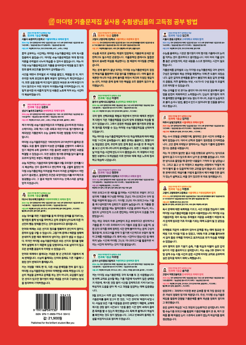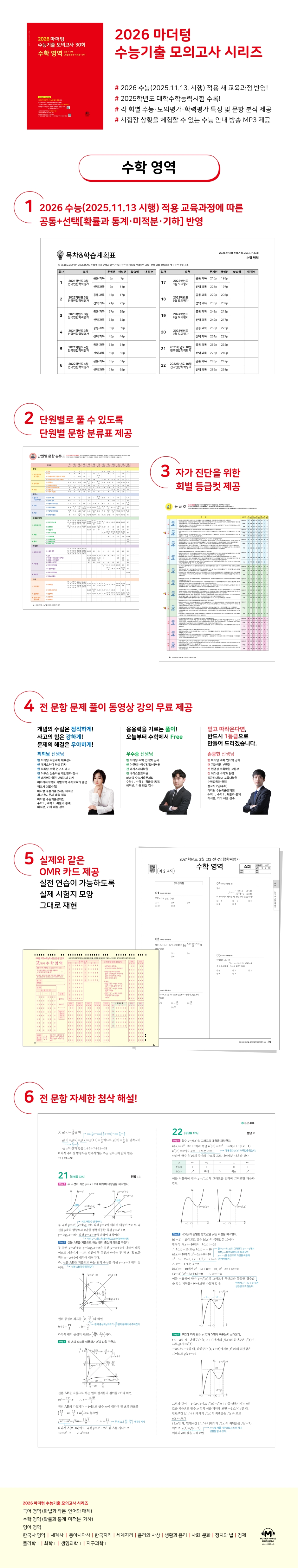 2. 2020~2024 시행 수능(수능예시문항 포함) + 2021~2024 시행 모의평가·학력평가 → 총 1,380문항 3. [특별 무료 제공] ① 전 문항 문제 풀이 동영상 강의 ② 실전용 OMR 카드 4. 부족한 부분을 채워주는 자세한 첨삭 해설 5. 자가 진단을 위한 회별 등급컷 제공 6. 각 회별 모의고사 특징 및 문항 분석 7. 시험장 상황을 체험할 수 있는 수능 안내 방송 MP3 및 동영상 제공 |