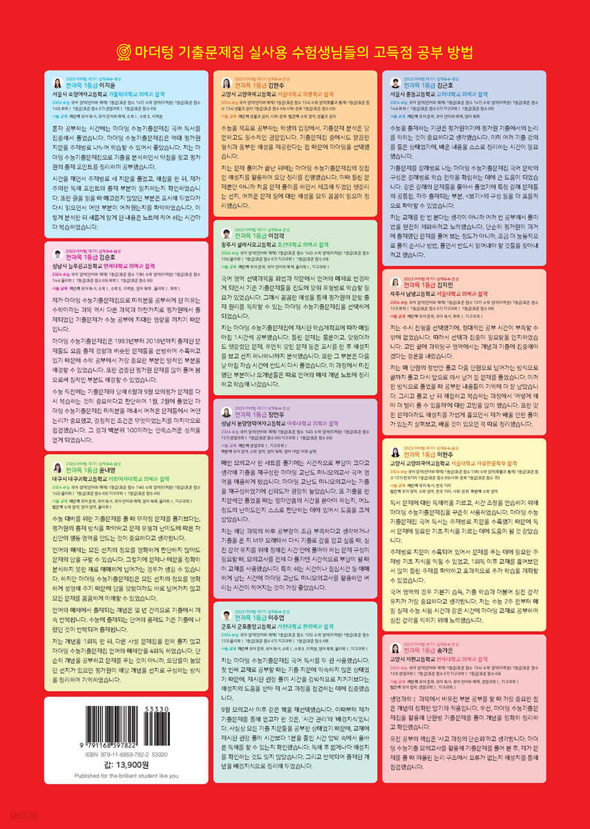 실제 수능과 똑같은 구성 / 수능과 똑같은 실전용 OMR 카드 제공 / 시험장 상황을 체험할 수 있는 안내 방송 MP3 제공 2025학년도 대학수학능력시험 전 문항 포함 2020~2024 시행 5개년 수능 + 2021~2024 시행 4개년 모의평가 + 2022~2024 시행 3개년 학력평가 기출문제 전 문항 25회 → 총 500문항 수록 선별 문항 문제풀이 동영상 무료 강의 단원별로 문제를 풀고자 하는 학생, 취약한 부분의 문제를 집중적으로 풀고자 하는 학생들을 위한 단원별 문항 분류표 제공 자가 진단을 위한 회차별 등급컷 제공 전 문항 정답률 표기 |