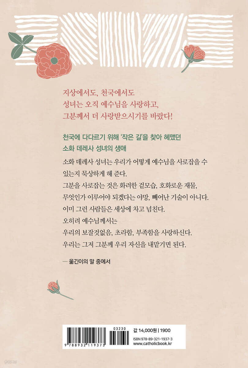 성녀의 신앙 여정 『성녀의 작은 길』은 소화 데레사 성녀의 자서전, 시, 편지에서 발췌한 주요 메시지를 엮은 책이다. 성녀는 24년이라는 짧은 생애 동안 온전히 하느님을 신뢰하며 기도와 희생을 바쳤고, 이례적으로 빠른 기간에 성인품을 받았다. 프란치스코 교황은 소화 데레사 성녀의 가르침이 복잡한 현대 사회에서 단순함, 사랑, 신뢰의 중요성을 재발견하게 한다며 누구나 이 ‘작은 길’을 걸어갈 수 있다고 강조했다. 이 책은 독자들이 소화 데레사 성녀의 가르침을 쉽게 접할 수 있도록 구성되어 있다. 1장 ‘작은 길을 걸어가며’에서는 ‘작은 길’, ‘부르심’, ‘기도의 힘’, ‘영성 생활’, ‘빈손’, ‘소원’ 등의 키워드를 통해 성녀의 삶과 영성의 핵심을 조명한다. 또한 2장 ‘작은 꽃의 마음’에서는 짧지만 깊이 있는 문장들을 담아 삶에 지친 독자들에게 위로와 영감을 전하고 있다. 소화 데레사 성녀의 가르침은 우리가 하는 작은 사랑의 행위를 이어가며, 겸손한 마음으로 하느님을 따라 살 수 있도록 돕는 지침이 된다. 자신이 지닌 부족함과 나약함을 인정하고, 하느님께 모든 것을 내어 맡길 때 비로소 진정한 기쁨과 평화를 느낄 수 있다는 점을 몸소 보여 주기 때문이다. 소화 데레사 성녀는 다음과 같은 말을 남겼다. “제게는 위대해지는 것이 불가능에 가깝습니다. 흠결투성이인 저라는 짐을 짊어지고 있기 때문입니다. 하지만 저는 천국에 다다르기 위해 작은 길을 찾을 것입니다.” 이러한 성녀의 말처럼 우리도 ‘작은 길’을 걸어 하느님께로 나아가야 한다. 이 길은 매우 작고 좁지만, 소화 데레사 성녀의 삶은 우리에게 이 길을 알려 주는 등불이 될 것이다. 우리가 바늘귀로 들어가는 방법은 바로 우리가 태어난 먼지처럼 그분 앞에서 작아지는 것이다. 낙타에게는 어려운 일이지만, 먼지는 바늘귀로 들어가기가 쉽다. 그리고 바로 이것이 소화 데레사 성녀가 우리에게 가르쳐 주는 ‘작은 꽃’, ‘작은 길’의 영성이다. ― ‘옮긴이의 말’ 중에서 |