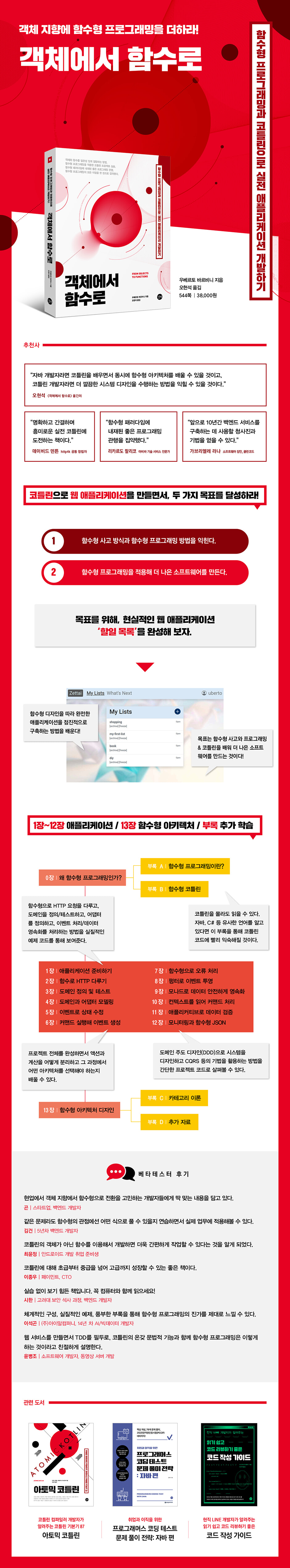 0.1 왜 코틀린인가? 0.2 함수형 프로그래밍의 진정한 의미는 무엇인가? ____재사용은 정말 과대평가된 것인가? 0.3 객체 지향 프로그래밍 지식을 일부러 잊어버리기 ____대상과 동작에 집중하기보다 데이터 변환에 집중하기 ____메서드 없는 객체 생성하기 ____불필요한 인터페이스 피하기 ____복잡한 제네릭 타입을 두려워하지 말자 0.4 요약 1장 애플리케이션 준비하기 1.1 예제 애플리케이션 정의하기 ____새 제품 상상해보기 1.2 제타이: 혁신적인 할 일 목록 애플리케이션 ____사용자 스토리 정의하기 ____이벤트 스토밍을 통해 스토리 검증하기 ____목업 준비하기 ____요구 사항을 코드로 작성하기 1.3 테스트가 개발을 안내하게 하라 ____지속 가능한 페이스로 생각하기 ____디자인 방향을 이끌기 ____올바름 보장하기 ____여러 가지 유형의 테스트들 ____테스트에 대한 두 가지 학파 1.4 프로젝트 설정하기 ____테스트 라이브러리 1.5 단위 테스트를 함수형으로 만들기 ____첫 번째 단위 테스트 ____목을 사용하지 말라 1.6 요약 1.7 연습 문제 ____연습 문제 1.1: 슈퍼마켓 이벤트 스토밍 ____연습 문제 1.2: TDD로 할인 금액 계산하기 ____연습 문제 1.3: 1씩 더해가는 테스트 2장 함수로 HTTP 다루기 2.1 프로젝트 시작하기 ____작동하는 골격 2.2 HTML 페이지를 함수적으로 제공하기 ____함수로서의 웹 서버 ____Http4k 소개 ____스파이크: 첫 번째 웹 페이지 ____Http4k 도메인 특화 언어 ____위험 관리 2.3 제타이 시작하기 ____첫 번째 인수 테스트 ____유비쿼터스 언어 ____인수 테스트 실행 2.4 화살표로 디자인하기 ____여러 함수 결합하기 2.5 맵으로부터 목록 제공하기 ____응답 파싱하기 ____스토리 완성하기 2.6 요약 2.7 연습 문제 ____연습 문제 2.1: 함수 연쇄 호출 ____연습 문제 2.2: 함수형 스택 ____연습 문제 2.3: RPN 계산기 3장 도메인 정의 및 테스트 3.1 인수 테스트 개선하기 ____부정적 사례 테스트 ____시나리오 액터 ____애플리케이션 파사드 ____함수로 표현한 단계 3.2 고차 함수 사용하기 ____순수 고차 함수 3.3 인프라에서 도메인 분리하기 ____허브 ____허브를 제타이에 연결하기 3.4 도메인에서 테스트 구동하기 ____프로토콜 ____인수 테스트를 DDT로 전환하기 3.5 DDT를 Pesticide로 변환하기 ____시나리오 ____액션과 프로토콜 ____액터들 ____단계 ____Pesticide DDT로 전환하기 ____애플리케이션 호출하기 ____최종 테스트 3.6 요약 3.7 연습 문제 ____연습 문제 3.1: 계산원 DDT ____연습 문제 3.2: 할인 DDT ____연습 문제 3.3: 결과로 함수 반환하기 ____연습 문제 3.4: 템플릿 엔진 4장 도메인과 어댑터 모델링하기 4.1 목록을 수정하는 새 스토리 시작하기 ____진행 중인 작업 ____도메인 주도 테스트 과정 ____액터 단계 ____HTTP 액션 호출 ____다른 페이지 처리하기 ____CRUD 예제 ____항목을 추가하는 경로 4.2 함수적 의존관계 주입 사용하기 ____객체 지향 의존관계 주입과의 비교 ____부분 적용 ____허브에 항목 추가하기 ____호출 가능한 클래스로서의 함수 ____허브 밖에 목록 저장하기 ____음성(부정적인 경우) 검사하기 ____목록에 항목 추가하기 4.3 함수형 코드 디버깅하기 ____의심이 된다면 출력하라 4.4 함수형 도메인 모델링 ____낮은 카디널리티 ____오류를 나타내도록 널 반환하기 ____널의 문제 ____속성 테스트 ____타입 안의 널이 될 수 있는 필드 ____더 나은 HTML ____HTML 파싱하기 ____고차 함수 추출 4.5 요약 4.6 연습 문제 ____연습 문제 4.1: DiscardUnless ____연습 문제 4.2: 널이 될 수 있는 함수 연쇄 호출하기 ____연습 문제 4.3: 커링 ____연습 문제 4.4: 호출 가능 객체 5장 이벤트를 사용해 상태 수정하기 5.1 할 일 목록 만들고 표시하기 ____사용자 목록 페이지 만들기 ____HTTP DDT로 전환 ____도메인 전용 DDT 통과시키기 ____사용자의 할 일 목록 페이지 생성하기 5.2 변경된 상태 저장하기 ____이벤트 소싱 ____불변 데이터로 상태 변경하기 ____임시 가변성 ____변경 가능한 지역 변수 제거하기 5.3 재귀의 힘 활용하기 ____접을 수 있게 만들기 ____왼쪽 접기와 오른쪽 접기 5.4 이벤트 접기 ____유한 상태 기계 구현하기 ____유니언 타입 ____복합 타입의 카디널리티 계산하기 ____상태 변경 정의하기 5.5 모노이드 알아보기 5.6 요약 5.7 연습 문제 ____연습 문제 5.1: 재귀 ____연습 문제 5.2: 접기 ____연습 문제 5.3: 유니언 타입 ____연습 문제 5.4: 모노이드 6장 커맨드 실행해서 이벤트 생성하기 6.1 새 목록 만들기 ____새 목록을 만드는 DDT 추가하기 ____HTML UI에 버튼 추가하기 ____HTTP 핸들러에 경로 추가하기 6.2 커맨드를 사용해 상태 변경하기 ____커맨드에서 이벤트 생성하기 6.3 상태와 이벤트로 도메인 모델링하기 ____트랜잭션 엔티티 ____엔티티 상태 ____ToDoListEvent ____ToDoListState 6.4 함수형 상태 기계 작성하기 ____이벤트 스토어 6.5 허브 연결하기 ____읽기 모델 ____목록에 항목 추가하기 6.6 커맨드와 이벤트 더 잘 이해하기 ____변경 가능한 상태와 변경 불가능한 상태 ____정체성과 엔티티 ____이벤트 소싱 애플리케이션 지원 6.7 요약 6.8 연습 문제 ____연습 문제 6.1: 엘리베이터를 상태 기계로 모델링하기 ____연습 문제 6.2: 이벤트를 사용해 엘리베이터 상태 유지하기 ____연습 문제 6.3: 고장 상태 추가하기 7장 함수형으로 오류 처리하기 7.1 오류를 더 잘 처리하기 ____널