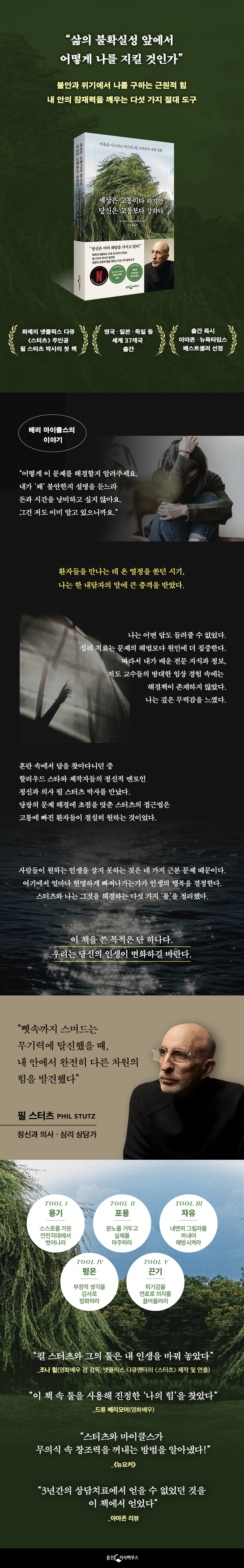 당신의 인생이 뜻대로 흘러가지 않는 이유 심리 치료사 배리 마이클스는 한 내담자와 이야기를 나누던 중 다음과 같은 말을 들었다. “어떻게 이 문제를 해결할지 알려주세요. 내가 ‘왜’ 불안한지 설명을 듣느라 돈과 시간을 낭비하고 싶지 않아요. 그건 저도 이미 알고 있으니까요.” 그는 환자의 요구에 어떤 답도 들려줄 수 없다는 사실에 큰 충격을 받았다. 그동안 배우고 익힌 심리 치료는 문제의 해법보다는 원인에 집중했다. 마이클스가 가진 전문 지식과 정보, 심지어 지도 교수들의 방대한 임상 경험 속에서도 해결책은 존재하지 않았다. 깊은 무력감에 빠진 그는 혼란 속에서 답을 찾던 중, 필 스터츠와 만난다. 정신과 의사이자 심리 상담가인 스터츠의 접근법은 마이클스에게 새로운 세계를 열어주었다. 스터츠는 과거 속의 원인이 아닌 당장의 문제 해결에 주목한다. 그리고 변화는 단지 문제의 원인을 알고 마음가짐을 바꾸는 것만으로는 일어나지 않는다고 강조한다. 진정한 변화는 행동을 통해 이뤄지며, 행동을 스스로 통제할 수 있을 때 비로소 다른 삶을 살 수 있다는 것이다. 행동을 통제하기 위해서는 특정한 순간에 특정한 문제와 싸우기 위해 사용할 특정한 방법이 필요하다. 스터츠는 그 도구로 ‘툴(Tool)’을 제안한다. 스터츠는 내면의 힘과 툴에 관해 더욱 깊이 연구하고 다양한 임상 경험을 쌓으면서 사람들이 원하는 인생을 살지 못하게 만드는 네 가지 근본 문제를 찾아냈다. 그에 맞춰 총 다섯 가지의 툴을 완성했는데, 각각의 툴은 서로 다른 내면의 힘을 끌어올리는 데 최적화되어 있다. 고통을 피해 나만의 안전지대로 숨고 싶을 때, 타인에게 받은 상처 때문에 스스로 만든 분노의 미로에 갇혔을 때, 어둡고 거친 모습으로 자신을 포장해 불안에서 벗어나려 할 때, 부정적 생각에 뒤덮여 빠져나오지 못할 때 등 위기에 맞닥뜨린 순간 적절한 툴을 제대로 활용하기만 한다면 현실의 문제는 물론, 자신의 한계를 뛰어넘을 수 있다. “당신은 이미 해답을 가지고 있다” 마음을 다스리는 마스터, 필 스터츠와 그의 툴 스터츠의 툴은 초월적 힘을 작동시키는 버튼이자 그 힘이 흘러나오는 통로다. 스터츠는 현대인들은 쇼핑뿐 아니라 자신의 삶도 소비주의에 휘둘리고 있다고 진단한다. 인간의 기본적인 욕구가 바로 소비주의를 추동하고 있으며, 그럼으로써 자기 자신을 들여다보지 못하고 외부의 힘에 휩쓸리게 한다는 것이다. 스터츠의 툴은 편리함과 편안함, 향략과 안주, 노력 없는 요행을 바라는 인간의 욕구를 뒤집어 앞으로 나아가게 한다. 불러야 할 노래를 부르지 못한 채 영원히 잠드는 것만큼 슬픈 일이 또 있을까? 더욱 안타까운 것은 우리가 목소리 내는 것을 막는 범인이 ‘우리 자신’이라는 사실이다. 우리는 스스로 자신을 잠재운다. 커다란 대가를 지불해야 함에도 안전지대를 떠나지 않는다. 왜일까? 현대인이 흔하게 지닌 욕구에 발목을 붙잡히기 때문이다. 바로 즉각적인 만족에 대한 욕구다. 우리는 안전지대에 있는 그 순간만큼은 행복하다. 미래에 어떤 대가를 지불해야 하든 알 게 뭐란 말인가? 그러나 그 대가를 치러야 하는 때가 되면 무엇보다 큰 고통과 마주해야 한다. 인생을 낭비했다는 깨달음이 그것이다. _57쪽 스터츠는 또한 사람 사이 관계에서도 유용한 통찰을 제안한다. 스터츠는 타인에게 부당한 대우를 받았다고 느끼며 그 경험을 떨쳐내지 못할 때 우리는 미로에 갇힌다고 말한다. 일단 미로에 갇히면 부당함을 보상받고 공정함을 회복할 방법이 무엇인가 하는 데에만 생각이 쏠리며, 이는 타인이 우리의 마음을 점령해버리는 것과 다름없다. 이렇게 강박적 생각에 빠져 있으면 삶은 우리에게 아무것도 주지 않고 그냥 스쳐 지나가 버린다. 스터츠는 이런 때에 열린 자세로 ‘능동적 사랑’의 툴을 실천하면 관계의 미로에서 빠져나올 수 있다고 설명한다. 스스로 커리어를 망치는 코미디언부터 걱정 중독으로 가정이 위태로워진 주부까지 툴을 경험하고 인생이 바뀐 사람들의 이야기 『세상은 고통이다 하지만 당신은 고통보다 강하다』는 스터츠의 첫 책으로, 지난 30여 년간 함께 연구해온 마이클스와 공동 집필했다. 개념과 작동원리, 개발 과정 등 두 저자가가 초월적 힘과 툴에 관해 연구한 모든 것이 담겨 있는 이 책은 출간 직후 아마존과 뉴욕타임스 베스트셀러에 올랐고, 전 세계 37개국에서 읽히고 있다. 특히 이 책에는 툴을 활용해 문제를 해결하고 행복으로 나아간 사람들의 실제 사례들이 가득하다. 매번 이해할 수 없는 이유를 대며 자기 손으로 커리어를 망쳐버리는 스탠드업 코미디언이 ‘욕구 뒤집기’ 툴로 재기의 기회를 얻은 이야기부터 어린 시절의 트라우마 때문에 다른 사람과 솔직하게 교류하지 못하는 모델이 ‘내면의 권위’ 툴을 사용해 대인관계를 개선한 이야기, 너무 많은 것을 걱정하느라 정작 가족을 돌보지 못한 주부가 ‘감사의 흐름’ 툴로 평온을 되찾고 진짜 중요한 것을 볼 수 있게 된 이야기 등 다양하고 흥미로운 사례들은 독자로 하여금 툴을 활용할 수 있는 무궁무진한 영역과 그 효과를 보다 쉽게 이해하도록 돕는다.