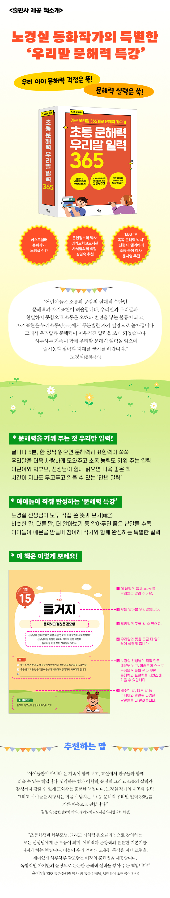 “『초등 문해력 우리말 일력 365』는 아이들만이 아니라 온 가족이 함께 보고, 교실에서 친구들과 함께 읽을 수 있는 책입니다. 생각하는 힘과 어휘력, 문장력 그리고 소통의 실력과 감성까지 갖출 수 있게 도와주는 훌륭한 책입니다. 노경실 작가의 내공과 실력 그리고 아이들을 사랑하는 마음이 넘치는 『초등 문해력 우리말 일력 365』를 기쁜 마음으로 권합니다.” - 김임숙 (문헌정보학자, 경기도학교도서관사서협의회 회장)