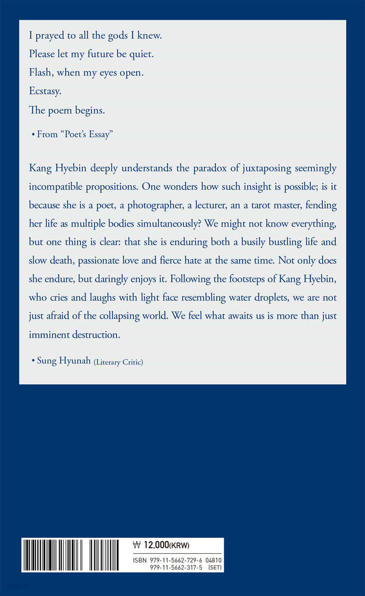 Please let my future be quiet. Flash, when my eyes open. Ecstasy. The poem begins. --- 「From “Poet’s Essay“」 중에서 Kang Hyebin deeply understands the paradox of juxtaposing seemingly incompatible propositions. One wonders how such insight is possible; is it because she is a poet, a photographer, a lecturer, an a tarot master, fending her life as multiple bodies simultaneously? We might not know everything, but one thing is clear: that she is enduring both a busily bustling life and slow death, passionate love and fierce hate at the same time. Not only does she endure, but daringly enjoys it. Following the footsteps of Kang Hyebin, who cries and laughs with light face resembling water droplets, we are not just afraid of the collapsing world. We feel what awaits us is more than just imminent destruction. --- 「Sung Hyunah (Literary Critic)」 중에서 |