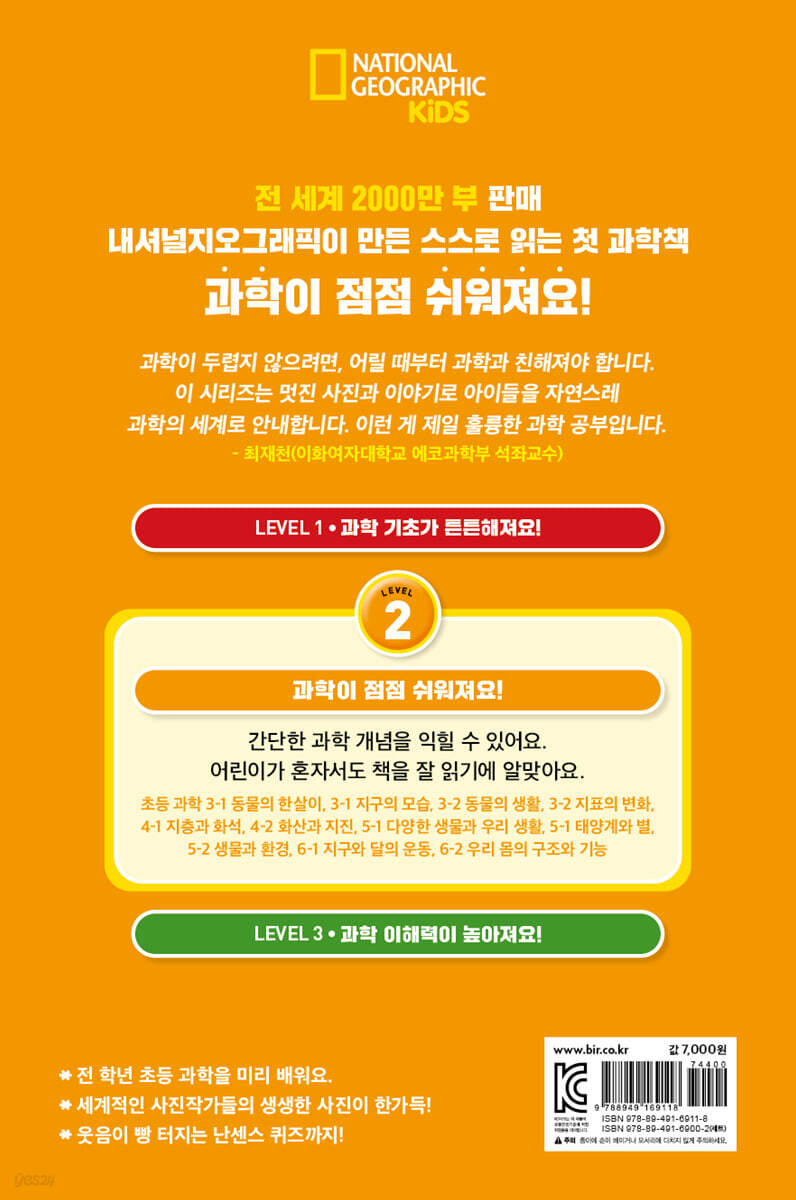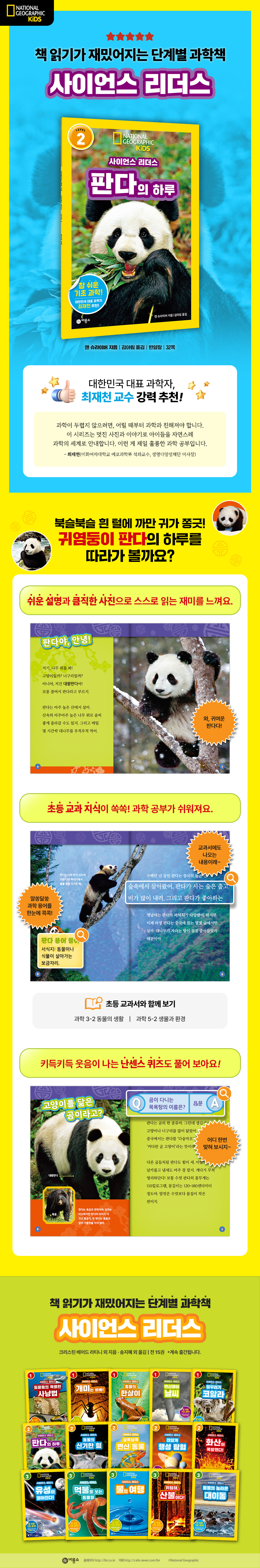 과학 정보 수준과 읽기 난이도에 따라 3단계로 나뉘어진 이 시리즈는, 단계별로 꼭 알아야 할 핵심 내용을 간결하고 짧은 글로 담아냈다. LEVEL 1은 권마다 번데기, 포식자, 포유류처럼 기초 과학 용어 4~5개를 익힐 수 있으며, 페이지당 2~3문장의 아주 짧은 글로 이루어져 있다. 자연 관찰에 관심이 생긴 유아가 부모와 함께 처음 보며 읽기를 배우는 과학책으로도 손색이 없다. LEVEL 2는 권마다 마그마와 용암, 궤도, 야행성 등 초등 과학 교과서에 등장하는 기본 용어 6~7개와 간단한 과학 개념이 나온다. 페이지당 4~5문장 정도여서, 아이들이 혼자서 술술 책 읽는 연습을 하기에도 알맞다. LEVEL 3은 권마다 응결, 연소, 침식 등 초등 과학 교과의 심화 용어 10개 이상과 복잡한 과학 원리를 이해하기 쉽게 다룬다. 1~2단계보다 긴 문장들로 이루어져 있어 독해력을 기르기에 효과적이다. ■ 동식물부터 지구, 우주까지! 초등 과학이 재밌어지는 풍성한 과학 주제 초등 과학 교육 과정에 맞춰 구성된 이 시리즈는 동물의 생태, 지구의 변화, 우주의 신비 등 다양한 과학 주제를 아우른다. 개미, 판다, 카멜레온 등 유아가 좋아하는 동물 주제뿐 아니라, 동물의 한살이, 화산, 태양계, 물의 순환처럼 초등 과학 교과의 중요 주제도 포함되어 있다. 꼭 알아야 할 초등 과학 개념을 쏙쏙 골라 담은 이 시리즈로 초등 과학 지식을 예습할 수 있다. ■ 내셔널지오그래픽만의 고품격 사진과 손에 쏙 잡히는 판형 내셔널지오그래픽은 퓰리처상 수상자를 다수 배출한 세계 최정상급 사진작가들의 생생한 사진으로 널리 알려져 있다. 이 시리즈에도 고퀄리티 사진을 가득 담았다. 날쌘돌이 치타가 사냥감 가젤을 쫓는 장면, 무시무시한 번개가 맨땅을 내리치는 찰나 등 평소에 쉽게 만날 수 없는 순간을 포착한 사진들이 과학 정보를 더욱 생동감 있게 전하며, 과학 이해력을 높여 준다. 아이가 갖고 다니며 읽을 수 있도록 가볍고 작은 판형으로 이루어진 점도 특별하다. 이동하는 차 안이나, 학교 아침 독서 시간 등에 활용할 수 있어 언제 어디서나 책 읽는 습관을 기르기에 좋다. ■ 과학 용어 풀이, 난센스 퀴즈 등 과학이 만만해지는 다채로운 코너! 이 시리즈의 본문 구석구석에는 과학이 쉽고 재밌어지는 코너들이 마련되어 있다. 책을 읽다가 알쏭달쏭 궁금한 과학 용어가 있다면 용어 풀이 코너를 살펴보자. 읽기 쉬운 말로 쏙쏙 이해되도록 설명되어 있다. 본문 곳곳의 난센스 퀴즈를 풀면서 키득키득 웃으며 잠깐 쉬는 재미도 있다. 책을 다 읽고 나서 마지막 과학 퀴즈를 풀며 실력을 점검하는 것도 잊지 말자. ■ 북슬북슬 흰 털에 까만 귀가 쫑긋! 귀염둥이 판다의 신나는 하루 둥글둥글 귀여운 생김새에 흰 털과 검은 털의 대비가 눈에 띄는 판다는 동물원의 슈퍼스타다. 이 책은 아이들이 가장 만나고 싶어 하는 동물 판다를 속속들이 파헤친다. 판다의 서식지와 먹이, 생김새, 다른 곰들과는 다른 판다만의 특징 등 판다에 대한 기본 정보를 알차게 담았다. 또한 판다끼리 의사소통하는 방법, 태어나서 다 자랄 때까지의 과정 등 초등 과학 교과서 속 ‘동물의 한살이’, ‘동물의 생활’과 연계된 내용으로 과학 실력을 탄탄하게 다질 수 있다. 한편 데굴데굴 구르는 판다의 모습, 판다가 높다란 나무를 타는 장면 등 내셔널지오그래픽만 보여 줄 수 있는 생동감 넘치는 사진이 가득해 아이들의 흥미를 끈다. |