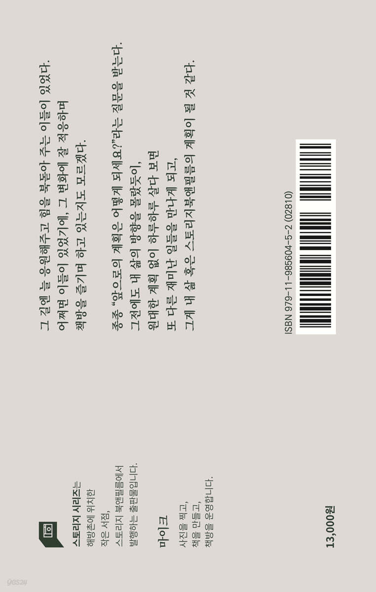 이럴 땐 이런 책 #1 뭘 하고 싶은지 찾고 있는 동생 / 마가진가쎄 / 첫 번째 사진집 /첫 번째 입고 / 재입고! / 새 직장 / 독립출판물만 파는 마켓 / 14년 가을, 도쿄아트북페어 이럴 땐 이런 책 #2 밀접한 관계는 되어있지만 간여하지 않는, / 책방들의 책방 / 책방 운영 / 오늘의 기분 / 마켓 후 재진 씨 / 리틀 프레스, 6699프레스 / 손으로 만든 책의 공간 / 춘천, 인문학 카페 36.5도 / 테이크아웃드로잉과 치읓 / 첫 번째 퍼블리셔스 테이블 / 추석으로 상경한 오월의 방과 귀향하기 전 들른 태재 / 오키로 사장님과 은지 씨 / 해방촌과 추석 / 추석과 이북식 녹두전 이럴 땐 이런 책 #3 계동 무사 책방과 요조 그리고 종수 씨 / 해말라야 / 코코넛 레코드 / 테이크아웃드로잉 책집 전시와 그라치아 매거진 / 아무것도 하지 않겠다는 결심의 유효함 / 컨셉진 29호 / 곧 8년, / 마이크, 마 사장 / 또다시, 언리미티드 에디션! / 연관 책방 / 해방촌 이전 / 해방촌 / 직장 / 해방촌 이웃들 / 성장시킨 사람들 / 바캉스 / 무서운 얼굴 / 아와 어 / 두통 / 상상 / 나초, 에딧, 그리고 요조 / 기억 / 영화 / 휴일을 정말 휴일처럼 / 안면인식 / hbc / 어떤 책방으로부터의 행운의 이메일 / 나의 에너지의 근원은 어디인가 / 36개월, 해방촌 / 지난밤에 / 어떻게 할 거야? / 독립출판물을 만들면서 이럴 땐 이런 책 #4 두 번째 책방을 준비하며, / 적게 벌면 행복하기 어렵쥬 / 곧, 열 살 / 꼭 그렇게 말해야 할까? / 어느새 2월, 변영근이 그리고 무명 / 어느새 2월, 제주 / 어느새 2월, 이제 일을 합시다 / 어느새 2월, 무사무사 / 어느새 2월, 무명 이튿날 / 해방촌 이웃, 오랑오랑 책은 어떻게 만드나요? ‘기획’ / 책은 어떻게 만드나요? ‘디자인과 인쇄’ / 독립출판물은 어떻게 파나요? / 성수동 / 언더그라운드 마켓 / 불편할 수도 있겠지만, / 메시지 기계 / 문을 열기까지, / 오늘 아침 / 6118 / 덤프트럭과 코끼리 / 물에 빠진 사람은 물에 빠진 채로 / 몇 살이에요? / 남해에 다녀오면서, / 독립출판과 독립책방 팟캐스트, ‘스몰포켓’ / 돈 받고 여행가는 일 / 시시때때 특별활동 나가며, / 다시 펴내며 |