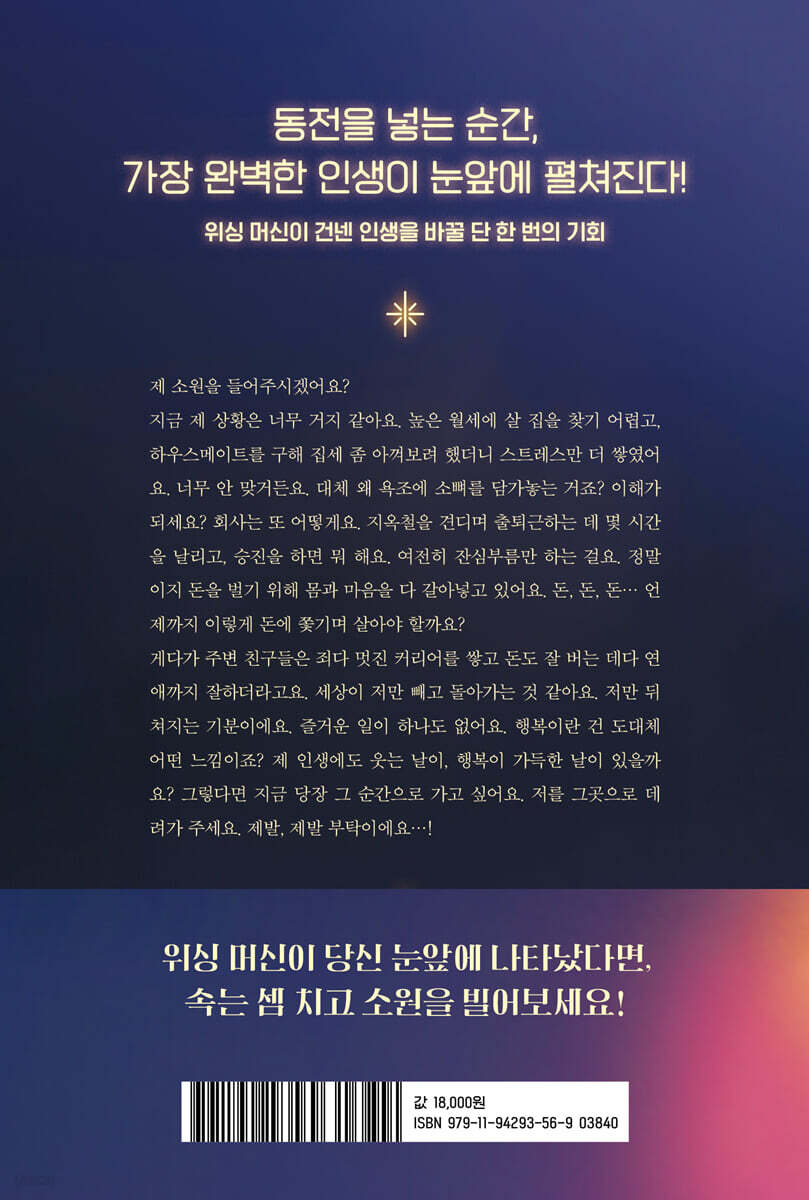 꿈처럼 이뤄진 완벽한 삶 그 속에 떨어진 ‘나’는 완벽한 타인이었다 “나는… 더 이상 가난한 채로 혼자 있고 싶지 않고, 이렇게 정체되어 있기도 싫어요. 그냥 빨리 내 인생의 좋은 부분으로 넘어가고 싶어요.” _62~63쪽 그날은 루시에게 정말이지 되는 일이 하나도 없는, 꼬일 대로 꼬인 이상한 하루였다. 그즈음의 루시는 뭐든 할 수 있을 것 같았던 어린 시절과 달리 꿈을 펼쳐보지도 못한 채 하루하루를 버티는 그야말로 바람 앞에 촛불과 같았다. 회사, 집, 연애, 인간관계 모든 게 불안정했다. 그녀는 이런 현실 앞에서 생각했다. 나는 인생에서 무엇을 얻었을까? 무언가를 잘못 선택했던 걸까? 제대로 살아가고 있는 게 맞을까? 루시는 도무지 이 막막한 현실을 어찌할 수가 없었다. 루시의 우울함이 극점을 찍던 그날, 새로운 인생을 갈망하던 그녀 앞에 신비한 소원 기계가 나타났다. 이건 루시에게 주어진 첫 번째 행운일까? “엄마는 어디 갔어요? 외계인이 엄마를 자기네 별로 납치한 거예요?” _77쪽 잠에서 깨어난 루시는 순식간에 16년을 건너뛰었다. 마흔두 살의 루시는 화목한 가정을 이뤘다. 완벽한 등 근육을 가진 자상한 남편. 분명 처음 보는 남자인데 왜 이렇게 설레는 거지? ‘엄마는 외계인’을 외치는 똑똑한 첫째. 외계인이 진짜 엄마를 납치해 갔다고 믿는 천재라 조심해야 한다. 본능에 충실한 둘째. 블러셔는 먹는 게 아니라는 걸 꼭 가르치고 말 테다. 그리고 원하던 형태의 멋진 집을 가졌다. 항상 그녀를 향해 박수치는 사람들을 거느린 회사의 공동 대표이기도 하다. 그야말로 여태껏 꿈꿔왔던 이상적인 삶의 모습이다. 기계가 루시의 소원을 들어준 걸까? 자신의 인생이 이토록 고단했던 이유는 ‘좋은 시절’이 시작되지 않았기 때문이라고 생각했던 루시는 드디어 맞이한 전성기 안에서 가진 걸 누리며 살 수 있는 기회를 얻었다. 그런데 왜 이렇게 이상한 기분이 드는 걸까? 왜 그토록 벗어나고 싶던 예전 집이 그립고 이곳의 모든 게 내 것 같지 않은 기분이 드는 거지? 무언가 많은 것을 잃은 듯한 느낌을 지울 수 없다. 루시는 그제야 깨달았다. 자신이 진정으로 원한 건 완벽한 순간이 만들어지기까지의 과정과 선택의 즐거움이었음을. 바꾸고 싶은 과거도 행복한 미래도 온전한 ‘나’의 순간들 있는 그대로의 지금을 사랑하는 법 “제발 돌아가게 해줘요. 내가 뭘 하고 있는지 모르고, 어디로 가는지 모르고, 어떻게 가야 하는지도 모르는 지저분하고 소란스러운 하루를, 좋은 날이든 나쁜 날이든 온전히 살고 싶어요.” _298쪽 16년을 건너뛴 루시는 너무 큰 공백들을 마주했고, 그 안에는 소중한 것들이 가득했다. 중요한 순간을 잊은 채, 후회를 바로잡지 못한 채 이대로 시간을 흘려보낼 수는 없었다. 모든 걸 온전한 ‘나’의 모습으로 다시 만날 수 있는 기회를 되찾아야 했다. 힘든 시간도, 벗어나고 싶은 순간도, 찌질한 과거도, 불확실한 미래도 모두 ‘나’이기에. 모든 순간의 내가 모여 더 나은 순간을 이루고 전성기를 만들기에. 이런 루시의 삶의 태도는 힘든 순간을 살아내는 우리에게 따스한 위로와 희망을 건네며 미처 발견하지 못한 지금 이 순간의 좋은 것들을 찬찬히 생각해 보게 한다. 작가는 이 책을 통해 고단하고 평범한 날들이 모여 삶을 이루니, 결국 지금 이 순간순간이 가장 소중한 것이라는 메시지를 전한다. |