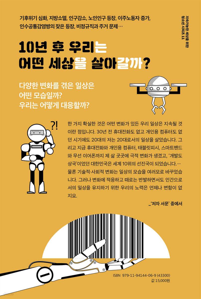 이 책은 빠르게 변화하는 과학기술, 이에 따라 달라진 사회문화와 우리 일상이 만들어내는 새로운 풍경을 상상하여 이야기로 풀어낸다. 그리 멀지 않은 미래인 ‘10년 후 우리는’ 어떤 사회에서 어떻게 살아갈까? 저자는 이야기 주인공 김기사의 일상을 통해 10년 후 우리 사회 모습을 다각도로 그려 보인다. 비약적으로 발전한 인공지능과 로봇은 사람의 수고를 여러모로 덜어주지만 사람의 일자리를 없애기도 한다. 기후위기와 기후난민 문제, 에너지 문제, 인수공통감염병 증가 등은 과학기술이 아무리 발전해도 온전한 해결책이 없어 보인다. 지방은 소멸해가고 인구는 감소한다. 폐지를 줍는 노인은 줄지 않고 비정규직 문제 또한 여전하다. ‘과학기술의 미래’를 다룬 《10년 후 우리는, AI와 친구가 될 수 있을까?》는 과학기술의 발전이 인간의 삶을 어떻게 변화시킬지 전망하는 이야기다. 주인공 김기사는 인공지능이 탑재된 자율주행 트럭을 타고 협동 로봇과 함께 일하면서 기술이 어떻게 일상의 일부가 되는지 체험한다. 인공지능, 자율주행, 유전자 편집, 확장현실 등 첨단 기술이 스며든 일상에서 기술의 가능성과 한계를 목도한다. 약간의 놀라움과 흥미를 유발하는 10년 후 우리 사회의 모습은 여러 예상되는 문제점에 대해 생각할 거리를 제공한다. ‘일상의 미래’에 대한 이야기인 《10년 후 우리는, AI 로봇을 구독하다!》는 과학기술의 발전이 사회적 문제와 개인 삶에 미치는 영향을 탐구한다. 김기사는 기후위기, 노인돌봄 문제, 인구감소와 주거 문제 등 다양한 사회문제에 직접 맞부딪히며 기술이 인간의 존엄성과 가치에 어떤 영향을 미칠지 고민한다. 또 AI와 데이터의 활용이 새로운 윤리적 문제와 갈등을 초래하는 상황 속에서 어떤 선택을 해야 할지 질문한다. 각 이야기 뒤에는 ‘생각과 지식의 확장’ 섹션을 두어 해당 기술의 개념과 사회적 함의를 깊이 있게 다루고, 독자의 생각을 확장시키는 질문을 던진다. 이 두 권은 각각 독립적으로 읽을 수 있지만, 함께 읽으면 과학기술과 사회적 변화가 얼마나 밀접하게 연결되어 있는지 더욱 깊이 이해할 수 있다. 단순히 과학기술의 진보를 예측하는 데 그치지 않고, 그 변화가 우리의 삶과 사회에 어떤 의미를 가지는지 성찰하게 만든다. 청소년부터 성인 독자까지 모두에게 다가올 미래를 준비할 통찰을 제공하며, 지금 우리가 상상하는 미래가 10년 후의 현실이 될 것임을 강조한다. |