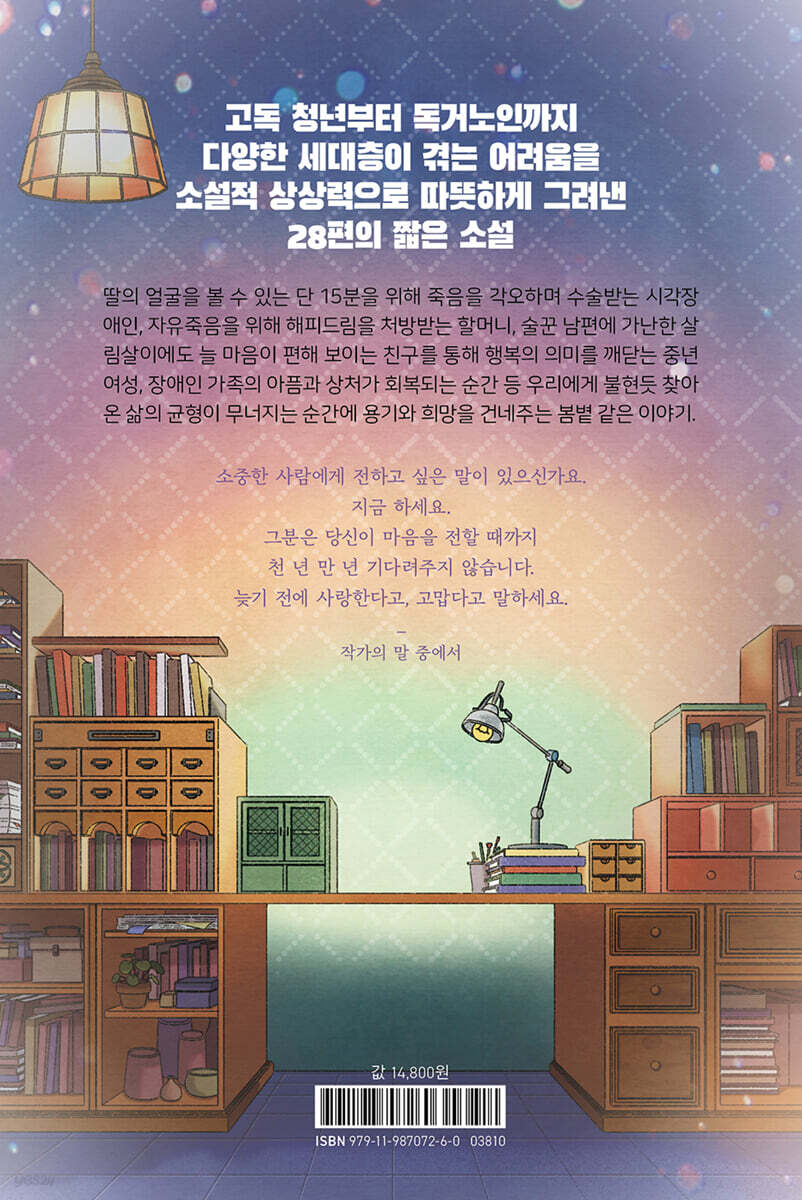 “그래, 그럴지도 몰라. 그렇더라도 나에게 이 일은 기적과도 같아. 나는 내 두 눈으로 본 세상을 사랑하게 될 거야. 비록 15분의 짧은 시간이지만 내 인생에서 가장 긴 시간으로 기억 속에 남게 되겠지.” “15분……?” 스티브 김이 받을 수술은 망막 위에 컴퓨터 칩을 삽입해 칩이 건강한 시신경을 자극해 시력을 회복하게 하는 시술이다. 문제는 시신경이었다. 담당의사는 그의 시신경이 거의 죽은 상태라서 수술에 성공한다 해도 그가 볼 수 있는 시간은 겨우 15분 정도밖에 되지 않을 거라고 말했다. “맙소사! 당신은 목숨을 담보로 15분을 얻었군요. 그렇게 죽음을 각오하면서까지 보고 싶은 것이 정말 세상에 있기나 한 걸까요?” 스티브 김은 눈을 떴다. 그에게 허락된 시간은 고작 15분 아니 어쩌면 10분 혹은 상황이 나쁘면 그보다 더 짧을 수도 있었다. 그는 마치 지난 36년이 오직 이 순간을 위해 존재했던 것 같았다. 한 번만. 딱 한 번만 실체를 본다면 영원히 깨어나지 않더라도 후회하지 않으리라 생각했던 그것이 바로 눈앞에 있었다. 다홍치마에 색동저고리를 입은 자그마하고 동실동실한 소녀. 그에게 희망의 싹을 틔워준 존재. 아이의 손에 들린 것은 노란 개나리 한 줌. 그것들이 한데 뭉쳐져 어룽어룽 무지갯빛으로 흔들렸다. “아빠아!” 무지개가 큰 소리로 그를 부르며 달려와 목에 매달렸다. --- 「가장 긴 15분」 중에서 “안녕하세요 황이순 고객님. 저희 해피드림 메이커를 이용해주셔서 감사합니다. 지금부터 고객님은 내일 아침 모닝콜 사인이 울리는 순간까지, 기억의 창고 저 너머에 던져진 그립고 소중한 시간을 찾아 복원하며 행복한 시간을 갖게 됩니다. 자, 그럼 함께 가보실까요.” 황할머니는 AI 미녀가 가리키는 곳을 바라보았다. 순백의 하얀 커튼이 바람에 가볍게 휘날리고 있었다. 커튼 뒤에는 태양이 숨어 있는 건지 뜰 수가 없을 만큼 눈이 부셨다. 그녀는 천천히 다가갔다. 갑자기 커튼이 휙 젖혀지고 그곳에는 갈래머리 여고생 이순이 서 있었다. 그런데…… 이순의 옆에 한 남자가 서 있는 게 아닌가. 아아, 저이가 누구더라? 깊은 잠에 빠진 황할머니의 미간이 살짝 좁혀진다. 드디어 생각해냈다. ‘아, 형식이 오빠! 그래, 논골에 살던 형식이 오빠야. 이런, 이제야 만나다니! ’첫사랑. 그것은 전생으로 착각할 만큼 오래전의 일이었다. 살아오는 동안 때때로 느닷없이 옆구리가 찔리듯 그리워지곤 했지. 얼마나 보고 싶었는데……. 잠든 황할머니의 입에서 흐르는 숨결은 뜨겁다. 꿈속의 그녀는 지금 배꽃처럼 고운 열여덟 살이다. 두 사람이 마주 서 있는 고향 마을 언덕 너머로 다음과 같은 광고를 단 기차가 지나간다. 해피드림― 당신의 꿈을 조립해 드립니다. 원하는 꿈이 있나요? 지금 주문하세요. --- 「꿈을 디자인해 드립니다」 중에서 녀석을 위해 케이크를 하나 샀다. 정임의 집에 도착했을 때 그들 다섯 식구는 동그란 식탁에 모여 앉아 서로 팔을 부딪혀 가며 저녁을 먹고 있었다. 식탁 위의 불빛이 왜 그렇게 따뜻하고 정겹게 느껴지는지, 정임의 얼굴이 왜 그토록 빛나 보이는지 이제야 조금 알 것 같았다. --- 「행복한 건빵」 중에서 죽은 내 엄마가 생각났던 것이다. 나는 엄마 몸을 빌려 태어났고 내 모든 것을 엄마한테서 받아다가 썼다. 엄마의 땀과 눈물, 엄마의 고된 노동들, 엄마가 마땅히 누려야 했을 자유, 엄마의 여유와 꿈을 마치 내 것인 양 필요할 때마다 당연하게 갖다 썼다. 생수 한 병을 얻어도 고맙다는 말을 하는 세상인데, 그렇게 엄마 것을 모조리 박박 긁어서 썼음에도 헤어질 때 고맙다는 말을 못했다. 엄마와 헤어질 줄 몰랐다. 엄마와의 이별은 그렇게 황망하고 어리석었다. 엄마 생각에 너무 깊이 빠져 있었던 탓일까. 정신을 차려보니 몸은 여전히 거대한 주차장 안이었다. 주위는 온통 콜타르 빛깔의 어둠. 망망대해 한복판 같기도 하고 밤안개가 내리는 우주 정거장 같기도 했다. ‘여긴 대체 어느 별일까. 어디로 가야 내 출구가 있을까?’ 두리번거리며 헤매고 있을 때 멀리 모녀가 보였다. 모녀는 팔짱을 낀 채 도란도란 이야기를 나누며 걷고 있었다. 어디서 용케 불러왔는지 모녀 뒤엔 캐리어에 짐을 실은 짐꾼이 있었다. 세 사람은 어둠의 물살을 가르며 느리지도 빠르지도 않은 걸음을 걷고 있었다. 그들이 가는 방향에 불빛이 있었다. 휘익. 찬바람이 볼을 스쳤다. 눈앞의 몽롱함이 걷히고 비로소 정신이 들었다. 나는 몸을 틀어 그들 쪽으로 걷기 시작했다. --- 「밤안개가 내리는 우주 정거장」 중에서 어떤 모임에서 저는 아래와 같은 물음을 던진 후 의견을 들은 적이 있어요. “깊은 숲속에서 길을 잃었을 때 내 옆에 누가 있으면 좋겠습니까?” 그날 가장 잊을 수 없는 이야기를 들려주신 분은 시각장애를 가진 젊은 여성이었습니다. “우리 엄마요!” 숲에서 길을 잃었을 때 그분은 꼭 엄마랑 같이 있고 싶다고 하셨습니다. “엄마 살아생전에 우린 많이 싸웠어요. 엄마는 눈이 안 보이는 저를 위해 정성을 다했어요. 늘 저를 위해서 기도했고, 저한테도 늘 기도하라고 하셨어요. 그때마다 저는 악다구니처럼 외쳤어요. 엄마, 아무짝에도 소용없는 말