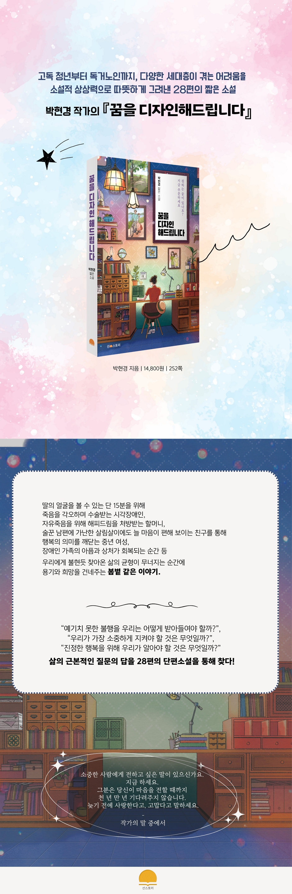 행복의 본질을 질문하다 아동청소년 문학 작가로 오랜 시간 독자들에게 사랑받아온 박현경 작가의 성인을 위한 짧은 소설. “예기치 못한 불행을 우리는 어떻게 받아들여야 할까?”, “우리가 가장 소중하게 지켜야 할 것은 무엇일까?”, “진정한 행복을 위해 우리가 알아야 할 것은 무엇일까?”라는 삶의 근본적인 질문에 대해 답을 작가는 짧은 소설 28편의 이야기를 통해 함께 고민해보고자 한다. 『꿈을 디자인해 드립니다』는 시각장애인, 독거노인, 빈곤 청년, 사별 가족 등 우리 사회의 소외된 이들을 주인공으로 한 이야기를 비롯해, 예기치 못한 사건을 통해 삶의 의미를 찾는 평범한 이들의 감동적인 이야기를 담았다. 죽음, 가난, 장애, 질병, 노화 등 우리가 삶에서 불현듯 마주하는 보편적인 경험을 작가 특유의 따뜻한 상상력과 섬세한 문체로 풀어내어 독자에게 깊은 몰입감을 제공한다. 가족의 의미와 관계의 소중함, 사랑의 복잡함, 일상의 가치 등 다양한 주제는 독자로 하여금 자신의 삶을 돌아보게 하고, 삶에서 가장 중요한 것은 무엇인지, 우리가 잃어버린 것들은 무언인지 성찰하게 하는 소중한 경험을 제공할 것이다. 읽는 이 누구에게나 봄볕 같은 위로와 희망을 전하며 마음의 깊은 곳에 울림을 주는 작품으로 자리매김할 것이다. |