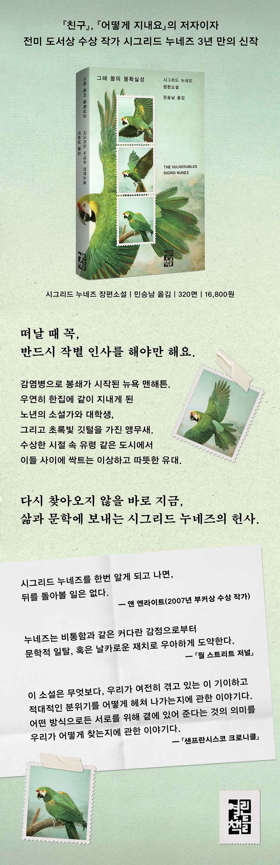 ★★★[NPR], [커커스], [보그], [하퍼스 바자] 등이 선정한 올해의 책 무엇도 알 수 없는 세계, 일상의 평범함에 담담히 건네는 안부 [뉴욕 타임스] 21세기 최고의 책에 선정된 『친구』의 저자이자 전미 도서상 수상 작가 시그리드 누네즈의 신작 장편소설. 버지니아 울프를 인용하며 『불확실한 봄이었다』라고 시작하는 이 소설은 감염병에 따른 봉쇄 조치로 인적이 뜸해진 뉴욕 맨해튼에서 우연히 지인의 반려 앵무새를 돌봐 주게 된 한 나이 든 소설가의 이야기를 담고 있다. 친절했던 이웃이 차갑게 돌변하고, 거리를 산책하는 개들마저도 이해할 수 없는 일이 일어나고 있음을 아는 듯했던 그 봄, 우리에게 주어져 있던 평온한 일상이 얼마나 깨지기 쉬운 것이었는지 돌아보는 책이다. 『그해 봄의 불확실성』은 누네즈의 아홉 번째 소설로, 특유의 건조한 듯 온기 있는 문체와 독특한 유머 감각이 빛을 발한다. 산문처럼 읽히기도 하는 이 소설은 함축적인 일상의 대화와 문학에 대한 인상 비평 들 사이에 코로나 팬데믹이라는 사회적 트라우마를 녹여 내며 기억과 상실, 애착에 대해 담담히 이야기한다. 수상한 시절 속 유령 같은 도시 노년의 소설가와 대학생, 그리고 초록빛 앵무새 사이의 이상하고 따뜻한 유대 이 소설은 봄과 꽃 이름에 대해 이야기하는 소설가 화자의 일상으로 시작한다. 그가 통과하고 있는 봄은 코로나 바이러스로 서서히 사회적 혼란이 시작되고 있는 바로 그 봄이다. 뉴욕에 봉쇄령이 떨어지고 소설가는 지인의 부탁으로 사람이 없는 집에서 유레카라는 이름의 앵무새를 돌봐 주기로 한다. 선명한 초록색 깃털이 매력적인 유레카와 함께 고급스러운 아파트에서 홀로 지내던 것도 잠시, 불청객이 찾아든다. 소설가보다 앞서 유레카를 돌보던 대학생인 베치가 한밤중 불쑥 들어온 것. 소설가는 우연치 않게 시작된 동거를 어쩔 수 없이 받아들이고, 한산한 공원을 산책하며 일상을 이어 가지만, 마주치는 사람들은 어쩐지 조금씩 예민하고 날카롭다. 산책길에 낯선 이에게 「기침 테러」를 당하고 침대에서만 시간을 보내던 소설가는 어느 날 베치가 사다 놓은 아이스크림 한 통을 다 먹어 치운다. 베치는 그를 위해 같은 아이스크림을 네 통이나 사 오고, 그 후로 둘 사이에 조금씩 유대감과 친밀함이 쌓여 간다. 수상한 시절 속 유령 같은 도시에서 노년의 소설가와 대학생, 그리고 앵무새 한 마리는 서로에게 점차 위안이 되어 준다. 다시 찾아오지 않을 바로 지금, 삶과 문학에 보내는 시그리드 누네즈의 헌사 시그리드 누네즈는 작품들을 통해 동시대 사람들의 삶의 방식과 그들이 발붙인 현실에 대한 사유를 예리하면서도 다정하게 그려 내며 독자와 평단의 인정을 두루 받아 왔다. 2018년작 『친구』는 전미 도서상을 수상하였고, [뉴욕 타임스] 21세기 최고의 책 1백 권 중 하나로 선정되었으며, 『어떻게 지내요』는 2024년 영화로 제작되어 베니스 영화제 황금 사자상을 받았다. 신작 『그해 봄의 불확실성』은 앞선 작품들에서 보여 주었던 유머와 통찰력을 잃지 않고 이어 가며, 삶의 비루하고 어두운 순간들을 따스하게 조명하는 누네즈의 특별한 재능이 다시 한번 빛을 발하는 작품이다. 「나는 왜 평생 애도하며 사는 기분인지 알고 싶다. 그 감정은 지금까지도 남아 있고 도무지 사라지려 하질 않는다」(20면)라는 문장을 읽고 가슴 한 편이 먹먹해졌다가, 「나는 코믹한 소설을 쓰고 싶었고, 내 인생에 대해 쓰면 된다는 걸 깨달았다」(184면)이라는 문장을 읽으면 피식하고 웃음이 나온다. 한편 이 소설은 누네즈의 전작들과 비슷하게 글쓰기와 문학에 대한 단상들이 이야기 전개 사이사이에 자리하며 읽기의 즐거움을 더해 준다. 특히 1부와 2부 사이를 잇는 「막간」에는 루소부터 고다르, 앨런 긴즈버그에 이르기까지 많은 유명인들이 쓰기에 관해 남긴 말들이 이어지며, 화자이자 자기 자신이기도 한 소설가의 글쓰기에 대한 생각을 엿볼 수 있다. 그러면서 소설가는 책의 말미에, 자신이 사용하고 싶었던 상징을 쓸 기회가 영원히 찾아오지 않을 수도 있다고 말하고는 「그 상징을 여기에 둬야겠다」고 하는데, 이는 『그해 봄의 불확실성』이 그의 마지막 작품이 될 수도 있다는 생각을 하게 만든다. |