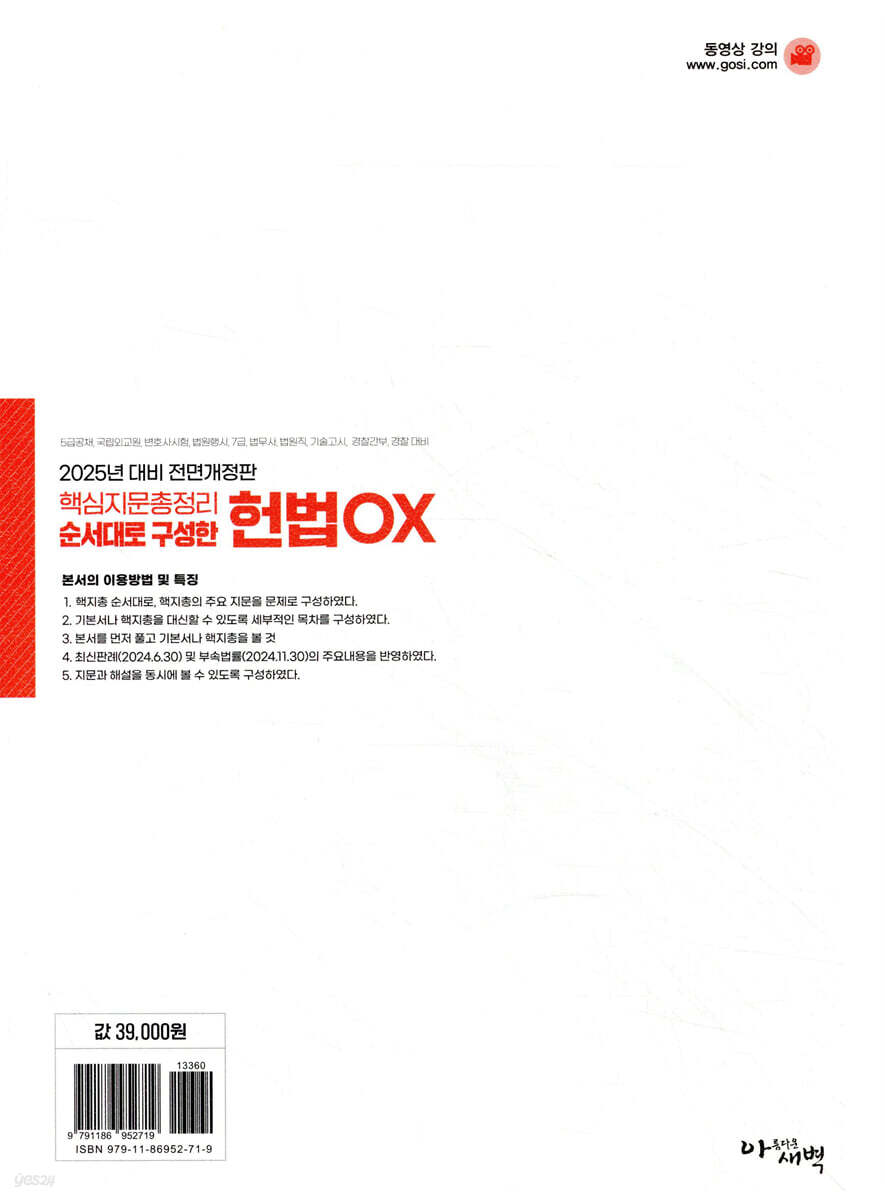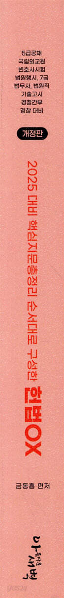 본서는 마무리 요약서를 대신하며, 객관식 문제집을 별도로 봐야 하는 부담을 덜고자 집필하였습니다. 주요 지문을 모아둔 것으로 해당 문제들을 반복하여 학습한다면 원하는 수준의 득점이 가능할 것입니다. 2025년 대비 개정판에서는 출제 가능성이 낮은 문제는 삭제하고 출제 가능성이 높은 최신 판례를 우선적으로 수록하였습니다. 또한 문제 배치에 변화를 주어서 효율성을 높이는 것에 중점을 두었습니다. 마지막 정리에 유용하게 활용될 수 있도록 심혈을 기울였습니다. 저자의 핵심지문총정리는 물론이고 본서 역시 최근 시행된 각종 국가고시에서 높은 적중률을 보였습니다. 앞으로의 시험에서도 높은 적중률을 자신합니다. 본서를 신뢰하고 아껴주신 수험생 여러분에게 감사드리며, 건강하게 시험 치르시길 바랍니다. 본서의 이용 방법 및 특징 1 핵지총 순서대로, 핵지총의 주요 지문을 문제로 구성하였다. 저자의 기본서나 핵지총을 보는 수험생들의 편의를 위하여 기본서·핵지총의 순서대로 지문을 구성하였으며, 중요 내용만 선별하였다. 시험에 임박한 시기임을 감안하여 세부적인 내용은 과감히 삭제하였다. 지문이 정선된 만큼 적중률 또한 자신한다. 2 기본서나 핵지총을 대신할 수 있도록 세부적인 목차를 구성하였다. OX문제만을 볼 경우 발생할 수 있는 논리적 흐름의 단절을 극복하기 위하여 기본서 및 핵지총의 세부적인 목차를 반영하여 지문을 구성하였다. 주제별, 쟁점별 강약 파악에 도움이 될 것이다. 핵지총을 볼 시간적 여유가 없는 수험생의 경우에는 본서를 반복하는 것만으로 충분히 핵지총을 보는 효과를 얻을 수 있다. 3 본서를 먼저 풀고 기본서나 핵지총을 볼 것 본서는 그동안 학습한 내용을 점검하는 자료이다. 따라서 적당한 분량을 정하여 풀어 본 다음, 본인의 취약점을 확인하고 기본서나 핵지총을 읽어 보기를 권한다. 시간이 절대적으로 부족한 경우에는 이러한 과정을 생략하고 본서만을 반복해도 충분히 합격한다. 4 최신판례(2024.6.30) 및 부속법률(2024.11.30)의 주요내용을 반영하였다. 출제 가능성이 높은 최신 판례를 지문화하였다. 부속 법률 또한 중요 지문으로 엄선하였기에 이에 대한 대비도 가능하다. 2024년 6월 30일까지의 최신판례 및 2024년 11월 30일까지의 개정법률을 반영하였다. 5 지문과 해설을 동시에 볼 수 있도록 구성하였다. 시험이 임박한 시점이므로 지문과 해설을 같은 위치에 배치함으로써 정답을 빠르게 확인할 수 있도록 하였다. 이는 효율적인 학습을 가능하게 할 것이다. 맺으며 본서만으로 시험 대비는 충분합니다. 시험을 앞두고 해당 교재를 반복해서 학습한다면 원하는 점수를 받을 수 있을 것입니다. 마무리 교재로 자신합니다. 2025년이 수험생 여러분의 합격의 해가 되기를 진심으로 바랍니다. 아울러 바쁜 와중에도 자신의 일처럼 저자를 도와주는 아름다운 새벽출판사 배은지 과장에게 감사의 말을 전하며, 건승을 기원합니다. 모두가 원하는 꿈을 이루는 2025년이 되기를 기원합니다. 2025. 1. 3. 편저자 금 동 흠 |