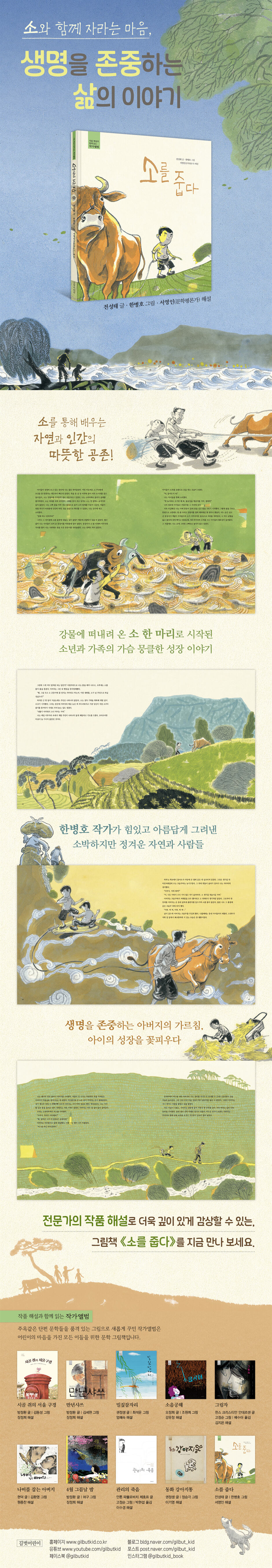 강물에 떠내려 온 소 한 마리로 시작된 소년과 가족의 가슴 뭉클한 성장 이야기 우리는 다양한 관계 속에서 성장합니다. 가까운 사람과의 대화, 새로운 대상과의 만남, 뜻밖의 인연을 통해 새로운 감정을 배우고, 때로는 이별을 겪으며 마음의 깊이가 더 깊어지지요. 특유의 토속적 언어와 해학적 문체로 인간에 대한 따뜻한 시선을 담아 깊은 울림을 전하는 것으로 평가받는 전성태 작가는 《소를 줍다》를 통해 이런 우리 삶 속의 만남과 헤어짐을 통해 소년과 가족이 성장하는 과정을 따뜻하게 그려냈습니다. 이야기는 물살이 거세게 불어난 강물 위로 떠내려 온 커다란 소 한 마리를 동맹이와 친구들이 발견하며 시작됩니다. 소를 집으로 데려온 동맹이는 기쁨에 들뜨지만, 정직하고 올곧은 성품의 아버지는 소의 주인을 찾아 돌려주어야 한다고 말하며 갈등이 생깁니다. 결국 동맹이와 아버지는 주인이 나타날 때까지만 소를 돌보자는 약속을 하게 되고, 동맹이는 소를 돌보며 책임감을 배우고, 늘 매사에 정성을 다했던 아버지 역시 동맹이가 주워 온 소에 깊은 애정을 쏟게 됩니다. 하지만 마침내 소의 주인이 나타나고, 동맹이와 아버지는 각자의 방식으로 슬픔을 표현하고 서로를 위로합니다. 책은 우리 삶 속에서 만남과 헤어짐은 끝없이 반복되며, 그 속에서 만들어지는 관계들은 우리에게 진정한 삶의 의미를 되새기게 한다고 이야기합니다. 소와 함께 한 그 짧은 시간 동안, 훌쩍 성장한 동맹이의 모습은 독자들에게 따뜻한 울림을 전합니다. 자연과 인간이 교감하고 공존하며 살아가는 아름다운 삶에 대하여 《소를 줍다》는 자연을 그 자체로 존중하고 인간과 자연이 공존할 때, 비로소 우리의 삶은 아름답고 따뜻해질 수 있다는 중요한 교훈을 다시 한 번 일깨워 줍니다. 이야기 속 동맹이의 아버지는 매사에 최선을 다하고 생명을 소중히 여기는 인물입니다. 그는 사소해 보이는 일을 할 때에도 허투루 하는 법이 없습니다. 농사일조차 예술처럼 접근하며 밭고랑을 반듯하게 만들고, 돼지 한 마리를 키울 때도 새끼들이 고루 젖을 먹을 수 있도록 밤낮으로 세심하게 돌봅니다. 이러한 아버지의 태도는 강물에서 떠내려 온 소를 돌보는 과정에서도 잘 드러납니다. 아버지는 소를 단순한 가축이 아니라 생명으로 바라보며 정성껏 돌보고, 동맹이의 생각과 마음가짐에도 커다란 영향을 주게 되지요. 동맹이는 아버지와 소를 키우고 보내며 생명의 소중함을 배우고, 자연과의 조화로운 삶을 경험하게 됩니다. 동맹이와 아버지의 이야기는 자연과 교감하는 태도가 인간의 삶에 얼마나 깊은 영향을 미치는지를 감동적으로 그려내며, 자연과의 공존이 주는 아름다운 가치를 보여줍니다. 현대 사회를 살아가는 우리에게 꼭 필요한 공존의 가치를 다시 한 번 생각하게 하는 이야기입니다. 한병호 작가가 힘있고 아름답게 그려낸 정겨운 자연과 사람들 깊이 있는 감상을 위한 전문가의 작품해설 수록 한국적인 정서를 담은 소박하면서 아름다운 그림으로 사랑을 받는 한병호 작가는 특유의 힘 있는 필치와 편안하고 따뜻한 색감으로 농촌의 풍경과 사람들의 정겨운 모습을 생생하게 그려냈습니다. 그는 농촌 생활에 대한 깊은 이해와 애정을 바탕으로 단순히 눈에 보이는 아름다움이 아니라 삶의 현장을 있는 그대로 담아내어 독자들에게 강한 인상을 남깁니다. 특히 강물에 떠내려 온 소를 구해내는 아슬아슬한 장면, 소를 돌보며 생기는 동맹이와 아버지의 갈등, 가족이 소와 함께 지내며 점차 변해가는 과정 등에서 등장인물의 심리적 변화를 세밀하게 표현해 이야기의 몰입도를 높였습니다. 또한 소를 돌려주게 되는 장면에서는 가족이 느끼는 깊은 슬픔과 애정이 고스란히 전해져 독자들에게 큰 여운을 남깁니다. 더불어 책 말미에 수록된 서영인 문학평론가의 작품 해설은 등장인물에 대한 심층적인 분석은 물론, 이야기의 시대적 배경과 사회적 분위기를 살펴보며 작품을 더욱 깊이 이해할 수 있도록 돕습니다. 《소를 줍다》는 따뜻한 그림과 정감 있는 이야기, 그리고 전문가의 깊이 있는 해설을 통해 자연과 인간의 교감을 진정성 있게 그려낸 그림책으로 독자들에게 잔잔한 감동과 여운을 선사합니다. |
