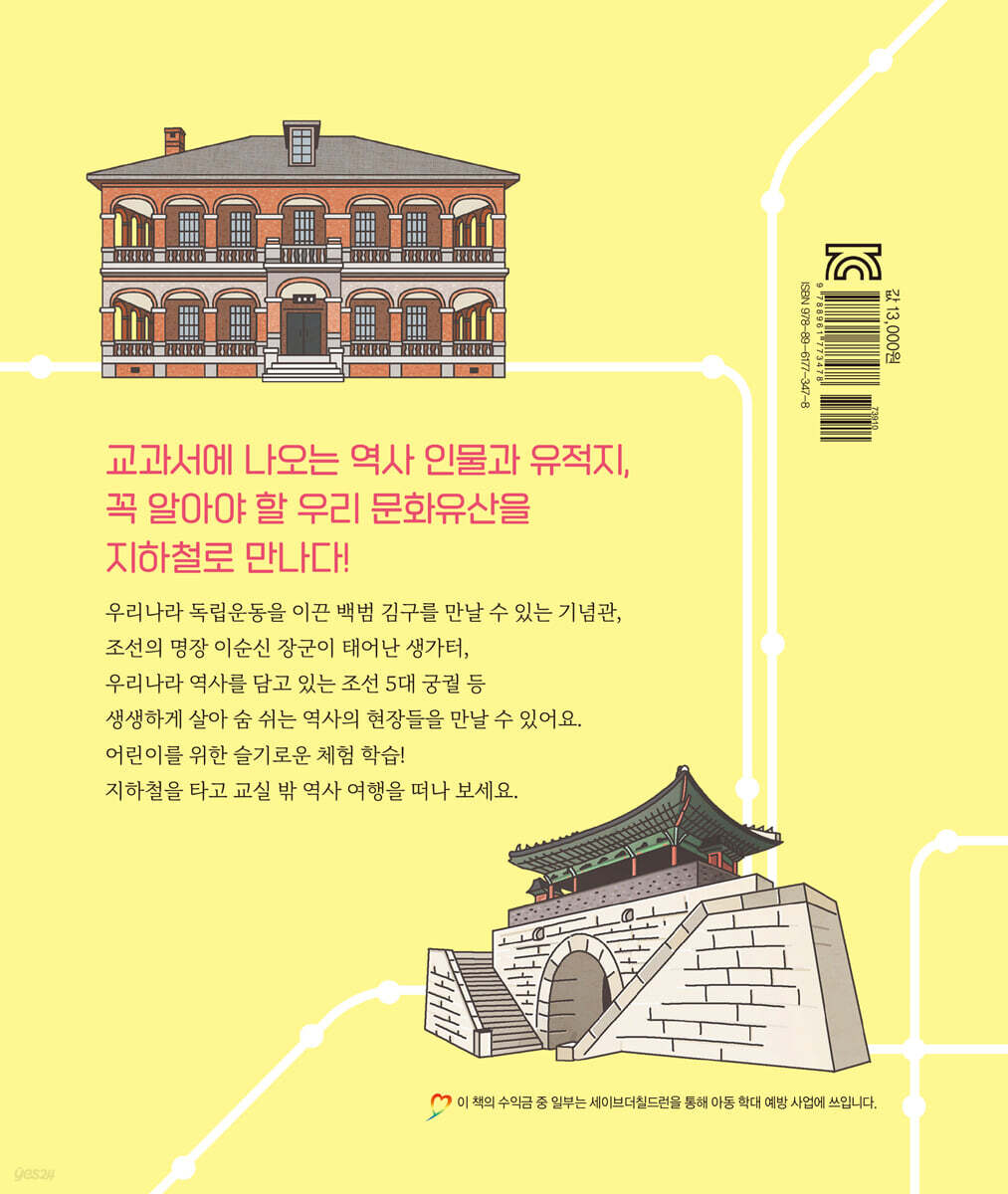 지금 내가 살고 있는 이곳이 한때는 뜨거운 역사의 현장이었다는 사실을 느낄 수 있다면 딱딱한 교과목도 한결 친근하게 느껴질 거예요. 《움직이는 역사 박물관》은 한국사가 아직 낯선 아이들을 위해 일상에 녹아 있는 역사에 집중했어요. 우리의 발이 되어 주는 지하철에 숨은 한국사와 국가 유산에 관한 이야기를 담았지요. 지하철역에서 내려 쉽게 방문할 수 있는 역사적 장소를 소개함으로써, 책으로 먼저 읽고 직접 가서 체험할 수 있도록 내용을 구성했어요. 각 장소와 관련된 역사 인물도 함께 알아보면서 장소와 역사 인물을 연결해서 기억할 수도 있답니다. 작가가 답사 현장에서 직접 찍은 사진 자료와 역사 속 한 장면을 재현한 삽화도 내용을 이해하는 데 큰 도움이 될 거예요. 교과서에서는 잘 다루지 않는 흥미진진한 한국사의 뒷이야기도 장마다 배치해 역사 공부와 재미 요소를 둘 다 잡았어요. 책을 읽으면서 자연스럽게 한국사와 가까워지고, 어느새 한국사의 매력에 푹 빠져들게 될 거예요. 2024년 국가유산기본법 전격 반영, 추가된 노선도로 더욱 풍부해진 역사 이야기 이번 개정증보판은 2024년 국가유산기본법 시행령을 반영하여 ‘문화재’와 같은 옛 용어를 바로잡고, 신분당선 노선을 추가하여 다양한 시간대의 역사 이야기를 담았어요. 풍납 토성, 낙성대, 심곡 서원 등 잘 알려지지는 않았지만 역사적 의미가 있는 장소를 소개해요. 고려 시대 명장 강감찬, 조선 초기의 문신 조광조, 독립운동가 윤봉길 의사 등 역사에 한 획을 그은 위인들의 업적도 알 수 있어요. |