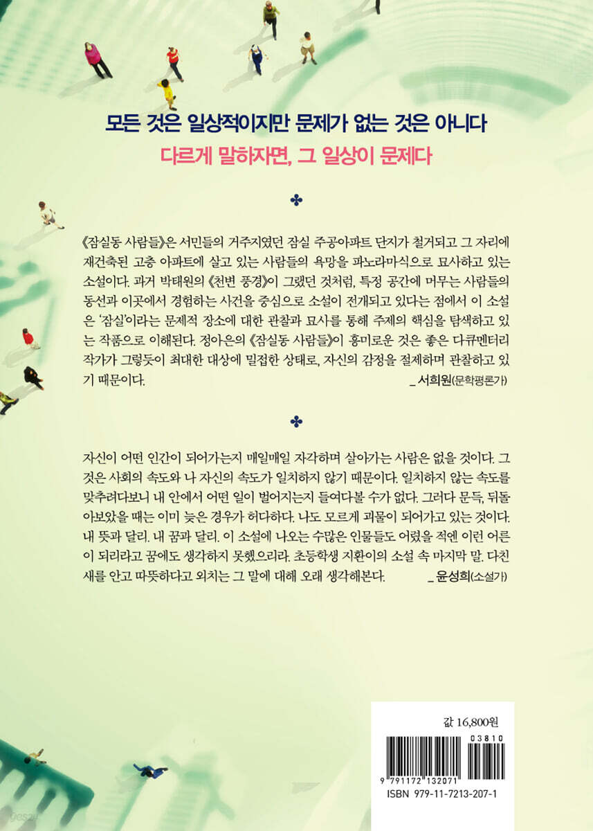 『잠실동 사람들』은 서민들의 거주지였던 잠실 주공아파트 단지가 철거되고 그 자리에 재건축된 고층 아파트에 살고 있는 사람들의 욕망을 파노라마식으로 묘사하고 있는 소설이다. 과거 박태원의 『천변 풍경』이 그랬던 것처럼, 특정 공간에 머무는 사람들의 동선과 이곳에서 경험하는 사건을 중심으로 소설이 전개되고 있다는 점에서 이 소설 은 ‘잠실’이라는 문제적 장소에 대한 관찰과 묘사를 통해 주제의 핵심을 탐색하고 있는 작품으로 이해된다. 정아은의 『잠실동 사람들』이 흥미로운 것은 좋은 다큐멘터리 작가가 그렇듯이 최대한 대상에 밀접한 상태로, 자신의 감정을 절제하며 관찰하고 있기 때문이다. - 서희원 (문학평론가)