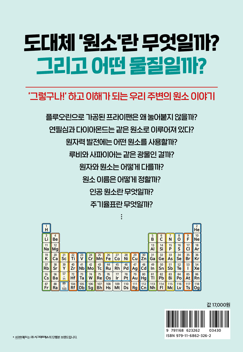 우리 주변의 원소 이야기 우리는 원소에 둘러싸여 있다. 우리 몸도 원소로 이루어져 있는데, 산소, 탄소, 수소, 질소가 우리 몸의 96%를 차지하고 있고, 다양한 원소들이 나머지를 채우고 있다. 따라서 자신의 주변에 있는 것들의 원리를 잘 이해하기 위해서는 원소에 대해 아는 것이 중요하다. 원소를 알면 납득이 가는 일도 늘어날 것이고, 이해하기가 더 쉬워질 것이다. 이 책을 통해 그렇게 하루하루가 더 즐거워지기를 바란다. 이 책은 총 3개 장으로 구성되어 있다. “제1장 원소에 대한 기본적인 내용과 이런저런 궁금한 이야기”에서는 원소가 정확하게 무엇인지를 설명하고 있다. 원소 주기율표부터 일상생활에 원소가 활용되는 예까지 원소에 대해 자세히 알아보자. “제2장 ‘그렇구나!’ 하고 이해가 되는 우리 주변의 원소 이야기”에서는 인간을 비롯한 모든 물질을 구성하는 118가지 원소 중에서 현재 우리 생활에 쓰이고 있는 원소와 앞으로의 활약이 기대되는 원소를 소개한다. “제3장 내일이라도 당장 이야기하고 싶어지는 원소 이야기”에서는 ‘원소 이름의 유래’, ‘이온’, ‘인공 지능’에 대한 이야기부터 ‘연금술의 역사’까지, 누구에게든 이야기해주고 싶은 원소의 이모저모를 살펴본다. |