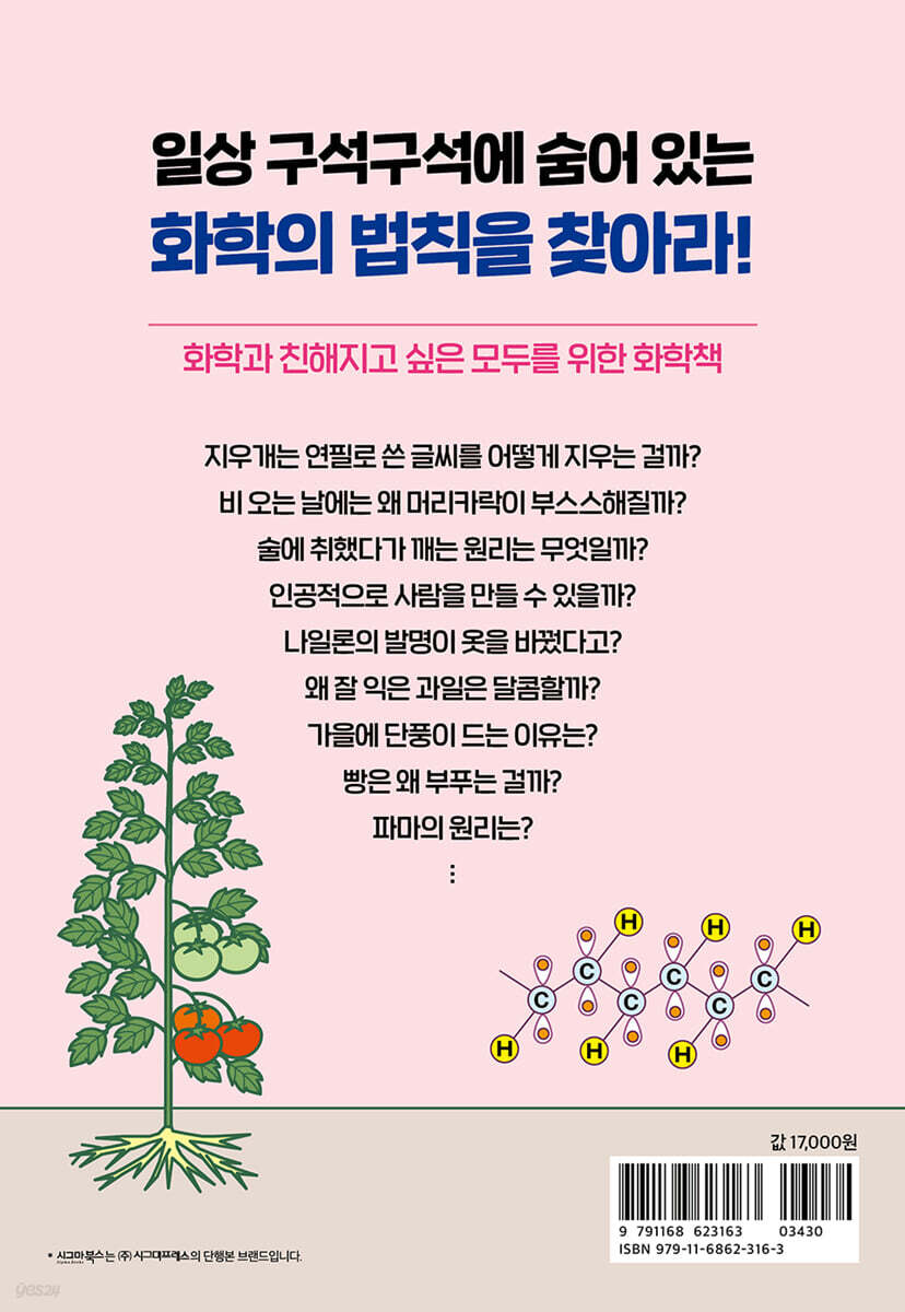 --- p.14 기름에는 동물성 기름과 식물성 기름이 있습니다. 동물성 기름인 돼지기름과 버터는 실온에서 굳지만, 식물성 기름인 샐러드 오일은 굳지 않지요. 이는 녹는점이 서로 다르기 때문입니다. 녹는점이 낮은 식물성 기름은 실온에서 액체로, 녹는점이 높은 동물성 기름은 실온에서 고체로 존재합니다. --- p.60 전자레인지의 가정 보급률은 거의 100%에 달합니다. 전자레인지는 전자파로 식품을 데우는 조리 기구지요. 식품을 데우는 원리는 바로 물 분자를 강하게 진동시키는 것이랍니다. 물질을 구성하는 원자와 분자의 운동이 격해질수록 온도는 높아집니다. 1945년 미국의 퍼시 스펜서가 작동 중인 레이더 앞에 서 있다가 전자파 때문에 주머니에 있던 초콜릿이 녹은 현상에서 아이디어를 얻어 발명했습니다. --- p.66 비누가 물에 녹으면 분자들이 기름때 분자에 둥글게 붙는데, 친수기가 바깥쪽, 소수기가 안쪽으로 향하는 구형 미립자인 마이셀을 형성합니다. 그리고 기름때는 옷 표면에서 떨어져 마이셀 내부로 들어가 미립자째로 물에 분산되면서 옷이 깨끗해지지요(그림 2). 이러한 작용을 유화, 친수기와 소수기를 가진 물질을 계면 활성제라고 합니다. --- p.88 고대 그리스에는 ‘모든 물질이 무수히 많은 원자(부서지지 않는 입자)로 이루어져 있다’라고 생각한 철학자가 있었습니다. 하지만 17세기까지는 “모든 물질이 불, 물, 공기, 흙이라는 네 원소로 이루어져 있다”라는 4원소설이 유력했지요. 근대까지 화학자들은 물질이 어떤 형태인지 모른 채 상상만으로 연구해왔습니다. --- p.106 카메라 옵스큐라로 비친 풍경을 사진에 정착시키는 장치를 최초로 만든 인물은 프랑스의 화학자 조제프 니세포르 니엡스입니다. 니엡스는 아스팔트(원유에 들어 있는 탄화수소)가 빛에 닿으면 굳는 성질을 이용해서 굳지 않은 부분을 씻어내고 원판을 만들었습니다. 빛에 닿지 않은 부분에는 구멍이 생기고, 그 구멍으로 잉크를 흘려 넣으면 판화(에칭)처럼 종이에 상을 그릴 수 있습니다. 이 기법을 헬리오그래피, 장치를 헬리오그래프라고 합니다. --- p.134 햄과 소시지 같은 가공육이 가열 처리를 거쳤는데도 신선한 생고기처럼 선명한 빨간색을 띠는 이유는 아질산 소듐이라는 발색제가 들어 있기 때문입니다. 고기가 선명한 빨간색인 이유는 근육에 들어 있는 미오글로빈이라는 색소 때문인데, 아질산 소듐이 산화를 막으면 이 선명한 빨간색을 안정적으로 유지할 수 있습니다. --- p.160 화학적 재활용은 폐기물을 화학적으로 분해해서 원료 상태까지 되돌린 다음 재활용하는 방법인데요. 유색 페트병도 재활용할 수 있는 데다 양질의 PET 수지를 얻을 수 있는 방법입니다. 씻어서 잘게 부순 PET 플레이크를 화학 분해해서 불순물을 제거합니다. 이를 전용 반응기에서 화학적으로 합성(중합)하면 새로운 PET 수지가 만들어지는데, 이를 원료로 재생 페트병을 만드는 것입니다. 그 밖에도 부숴서 씻은 PET 수지를 낮은 압력에서 고온 처리해서 불순물을 제거하는 방법도 있습니다. --- p.178 |