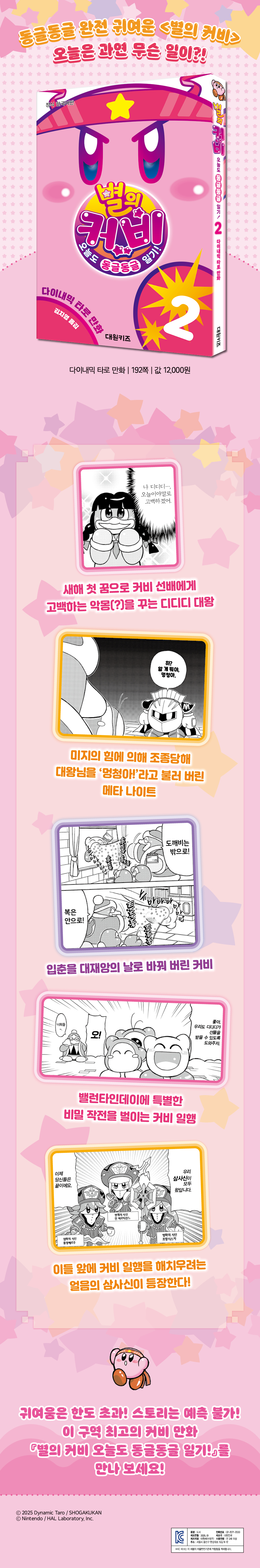 우당탕탕, 좌충우돌! 스토리는 예측 불가 이 구역 최고의 커비 만화 『별의 커비 오늘도 동글동글 일기!』를 만나 보세요! 커비와 디디디 대왕에게 오늘은 또 무슨 일이 벌어질까요? 새해 첫 꿈으로 커비 선배에게 고백하는 악몽(?)을 꾸는 디디디 대왕, 미지의 힘에 의해 조종당해 대왕님을 ‘멍청아!’라고 불러 버린 메타 나이트, 입춘을 대재앙의 날로 바꿔 버린 커비, 밸런타인데이에 특별한 비밀 작전을 벌이는 커비 일행… 그리고 이들 앞에 커비 일행을 해치우려는 얼음의 삼사신이 나타납니다! 하루도 조용할 날 없는 커비와 디디디 대왕의 하루하루를 담은 『별의 커비 오늘도 동글동글 일기!』. 두 번째 이야기는 다이내믹함과 폭소가 더욱 업그레이드되어 찾아옵니다! 「스타 얼라이즈」 「털실 커비 이야기 플러스」 등 전 세계인이 사랑한 「별의 커비」 속 캐릭터 대집합! 우리의 주인공 커비를 비롯, 「별의 커비」의 숨은 주인공인 디디디 대왕, 커비의 라이벌 메타 나이트는 물론, 푸푸푸랜드에 멸망을 가져오겠다며 등장한 얼음의 삼사신과 하이네스, 디디디 대왕의 자리를 차지하려는 할트만과 도팡까지… 전 세계 사람들로부터 사랑받은 「별의 커비」 속 캐릭터가 속속 등장! 각자 놀라운 능력을 선보이며 커비를 위협하지만, 환한 핑크빛 미소로 가볍게 제압해 버리는 커비의 눈부신 활약을 기대해 주세요! |