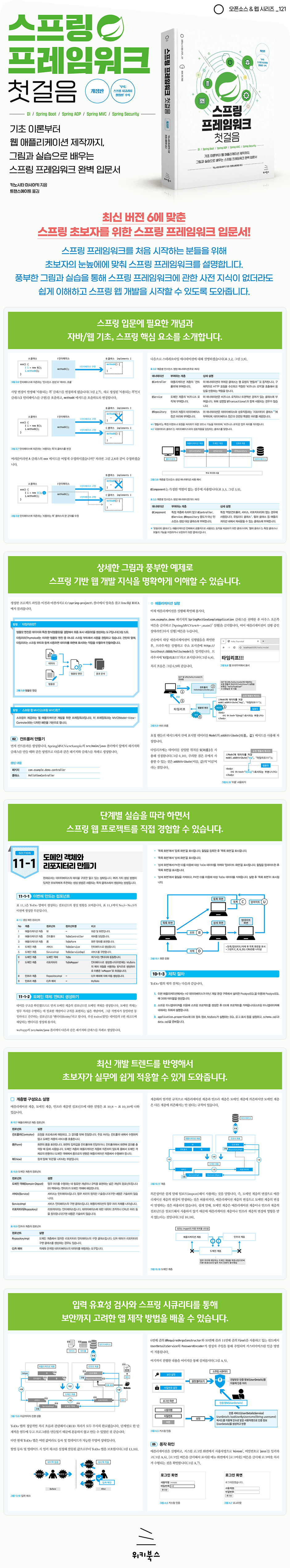 1-1 스프링 프레임워크 개요 ___1-1-1 프레임워크란? ___1-1-2 스프링 프레임워크란? 1-2 개발 환경 준비(IDE) ___1-2-1 IDE 설치 1-3 개발 환경 준비(PostgreSQL) ___1-3-1 PostgreSQL 설치 ▣ 02장: 기초 지식 배우기 2-1 자바 기초 지식 복습 ___2-1-1 인터페이스란? ___2-1-2 컴파일 오류란? ___2-1-3 의존성이란? ___2-1-4 인터페이스에 의존하는 프로그램 만들기 ___2-1-5 다형성이란? 2-2 웹 애플리케이션 제작을 위한 필수 지식 ___2-2-1 클라이언트와 서버 ___2-2-2 애플리케이션과 웹 애플리케이션 ___2-2-3 AP 서버 ___2-2-4 HTTP 통신 ___2-2-5 GET 메서드와 POST 메서드 ___2-2-6 3계층 구조 2-3 개발에 유용한 라이브러리와 도구 ___2-3-1 롬복이란? ___2-3-2 롬복을 사용하는 프로그램 만들기 ___2-3-3 그레이들이란? ▣ 03장: 스프링 프레임워크의 핵심 기능(DI) 알아보기 3-1 스프링 프레임워크의 핵심 기능 ___3-1-1 의존성 주입 ___3-1-2 관점지향 프로그래밍 3-2 DI 컨테이너 알아보기 ___3-2-1 DI 컨테이너 ___3-2-2 5가지 규칙 ___3-2-3 DI를 사용하는 프로그램 만들기 ___3-2-4 요약 3-3 DI 컨테이너 알아보기 (인스턴스 생성) ___3-3-1 빈이란? ___3-3-2 빈 정의란? ___3-3-3 자바 컨피그를 이용하는 프로그램 ___3-3-4 요약 3-4 DI 컨테이너 알아보기 (주입) ___3-4-1 주입 방법 ___3-4-2 각 주입 방법을 사용하는 프로그램 만들기 ___3-4-3 DI 이해하기 ▣ 04장: 스프링 프레임워크의 핵심 기능(AOP) 알아보기 4-1 AOP(관점지향 프로그래밍)의 기초 지식 ___4-1-1 AOP 예제(데이터베이스 접근) ___4-1-2 AOP 고유 용어 ___4-1-3 포인트컷 식 4-2 AOP 프로그램 만들기 ___4-2-1 프로젝트 생성 및 AOP 사용 준비 ___4-2-2 타깃 만들기 ___4-2-3 애스펙트 만들기 ___4-2-4 시작 클래스 생성 및 동작 확인 4-3 스프링 프레임워크가 제공하는 AOP 기능 이해하기 ___4-3-1 트랜잭션 관리 ___4-3-2 AOP 이해하기 ▣ 05장: MVC 모델 알아보기 5-1 MVC 모델 알아보기 ___5-1-1 MVC 모델이란? ___5-1-2 MVC 모델의 개요와 이점 5-2 스프링 MVC 알아보기 ___5-2-1 스프링 MVC란? ___5-2-2 요청 수신에서 응답 전송까지의 흐름 5-3 스프링 MVC 사용해보기 ___5-3-1 스프링 MVC 프로그램 만들기 ___5-3-2 요약 ▣ 06장: 템플릿 엔진(타임리프) 알아보기 6-1 타임리프 알아보기 ___6-1-1 타임리프란? ___6-1-2 Model 인터페이스란? ___6-1-3 기억해야 할 중요한 메서드 6-2 Model을 사용하는 프로그램 만들기 ___6-2-1 Model을 사용하는 프로젝트 ___6-2-2 ModelAndView 사용법 6-3 타임리프 사용법 ___6-3-1 타임리프를 사용하는 프로젝트 ___6-3-2 타임리프 사용법 ___6-3-3 컨트롤러와 뷰 생성 ___6-3-4 직접 문자를 삽입해서 값 결합 만들기 ___6-3-5 값 결합(리터럴 치환)에서의 비교와 등가 ___6-3-6 조건 연산자를 이용한 조건부 분기(false) 예시 ___6-3-7 switch에서 th:object 만들기 ___6-3-8 참조(List) 반복 예시 ___6-3-9 반복 상태에서 유틸리티 객체 만들기 ___6-3-10 HTML 파일의 부품화 예시 ___6-3-11 공통 레이아웃 만들기 ___6-3-12 요약 ▣ 07부: 서버로 데이터를 전송하는 방법 7-1 요청 파라미터 알아보기 ___7-1-1 요청 파라미터란? ___7-1-2 요청 파라미터를 획득하는 방법 ___7-1-3 요청 파라미터를 사용하는 프로그램 만들기 7-2 여러 개의 요청 파라미터 전송하기 ___7-2-1 @RequestParam으로 여러 개의 값 받기 ___7-2-2 Form 클래스란? ___7-2-3 요약 7-3 URL에 내장된 값 받기 ___7-3-1 프로젝트 생성(링크) ___7-3-2 프로젝트 생성(버튼) ▣ 08부: 유효성 검사 기능 알아보기 8-1 입력 체크 알아보기 ___8-1-1 유효성 검사와 유효성 검사기 ___8-1-2 단일 항목 검사란? ___8-1-3 상관 항목 검사란? ___8-1-4 요약 8-2 단일 항목 검사를 사용하는 프로그램 만들기 ___8-2-1 프로젝트 생성 ___8-2-2 애플리케이션 계층 생성 ___8-2-3 @ModelAttribute란? 8-3 상관 항목 검사를 사용하는 프로그램 만들기 ___8-3-1 프로젝트 생성 ___8-3-2 @AssertTrue 활용법 ___8-3-3 Validator 인터페이스 구현 방법 ▣ 09부: O/R 매퍼(MyBatis) 알아보기 9-1 MyBatis 알아보기 ___9-1-1 O/R 매퍼란? ___9-1-2 MyBatis란? ___9-1-3 MyBatis 사용법 9-2 MyBatis 사용해보기 ___9-2-1 프로젝트 생성 ___9-2-2 엔티티 생성 ___9-2-3 매퍼 파일 사용법 ___9-2-4 컨트롤러 만들기 ___9-2-5 뷰 만들기 ___9-2-6 동작 확인 ___9-2-7 요약 9-3 resultMap 알아보기 ___9-3-1 resultMap이란? ___9-3-2 테이블 구성 ___9-3-3 엔티티 추가 및 수정 ___9-3-4 매퍼 파일 수정 ___9-3-5 뷰 수정 ___9-3-6 동작 확인 ___9-3-7 요약 ▣ 10부: 애플리케이션 제작 준비하기 10-1 애플리케이션 개요 ___10-1-1 ToDo 앱이란? ___10-1-2 프로젝트 생성 준비 ___10-1-3 제작 절차 10-2 ToDo 앱 만들기 준비하기 ___10-2-1 데이터베이스 생성 ___10-2-2 프로젝트 생성 ___10-2-3 application.properties 설정 ___10-2-4 계층화 10-3 테이블과 데이터 만들기 ___10-3-1 애플리케이션 실행 ___10-3-2 테이블 확인 ___10-3-3 데이터 확인 ▣ 11부: 앱 만들기(데이터베이스 조작) 11-1 도메인 객체와 리포지터리 만들기 ___11-1-1 이번에 만드는 컴포넌트 ___11-1-2 도메인 객체: 엔티티 생성하기 ___11-1-3 리포지터리 생성 11-2 SQL 생각해보기 ___11-2-1 SQL 작성 11-3 매퍼 파일 만들기 ___11-3-1 매퍼 파일 생성 ___11-3-2 동작 확인 ▣ 12부: 앱 만들기(서비스) 12-1 서비스와 ServiceImpl 만들기 ___12-1-1 이번에 만드는 컴포넌트 ___12-1-2 서비스 생성 ___12-1-3 ServiceImpl 생성 12-2 트랜잭션 관리에 대해 알아보기 ___12-2-1 트랜잭션이란? ___12-2-2 트랜