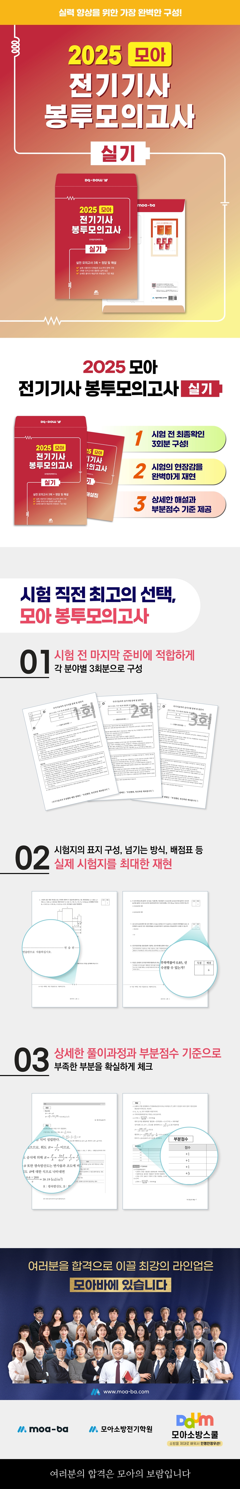 『2025 모아 전기기사 실기 봉투모의고사』는 전기기사 실기 시험 직전 최종 대비를 위한 교재로, 시험 적중률과 시험 재현도, 정확도 면에 초점을 두고 제작되었습니다. 실제 시험지를 재현한 디자인은 물론, 꼼꼼한 문제 해설과 관련 이론을 함께 수록하여 시험 전 최종 체크하기에 최적화되었습니다. 본 교재로 수험생들이 좋은 결과를 얻을 수 있기를 기대합니다.
