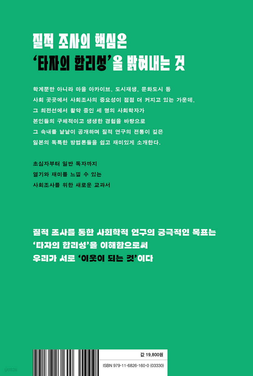 그 최전선에서 활약 중인 연구자들이 밝히는 질적 연구조사의 비법과 묘미 사회를 바라보고 분석하는 두 가지 주요 방법론이 있다. 하나는 객관성과 일반화를 추구하면서 모든 것을 통계화, 위계화, 서열화하려는 경향을 가진 양적 패러다임이고, 다른 하나는 (간)주관성을 인정하며 숫자로 포착할 수 없는 의미 구성과 경험에 초점을 맞추는 질적 패러다임이다. 이중 일본의 질적 방법론 전통은 매우 독특하고 깊이 있는데 〈단편적인 것의 사회학〉, 〈망고와 수류탄〉 등으로 한국에도 잘 알려진 기시 마사히코를 포함해 필리핀 빈민가에서 질적 연구를 수행한 이시오카 토모노리, 여성 노숙자와 함께 생활하며 필드워크를 수행한 마루야마 사토미까지 일본을 대표하는 현장 연구자들이 그 전통과 방법에 대해 쉽고 재미있게 소개한다. 저자들은 이 책을 쓰면서, ‘모든 사람의 모든 행위에는 이유가 있다’는 것을 가장 강조하고 싶었다고 밝힌다. 그리고 질적 조사에 기반한 사회학의 궁극적인 목표는 결국, 이 ‘이유’를 그려내는 것이어야 한다고 믿는다. 질적 조사를 통한 사회학적 연구의 궁극적인 목표는 ‘타자의 합리성’을 이해함으로써 우리가 서로 ‘이웃이 되는 것’이다 질적 조사란 간단히 말해서, ‘숫자를 사용하지 않는 조사’이다. 인터뷰, 청취, 참여관찰, 역사적 자료와 신문 기사 수집 등 오로지 ‘질적’인 데이터를 모아 분석하는 것이다. 이러한 질적 조사에는 양적 조사와 같은, ‘싹둑’ 하고 예리하게 자른 것처럼 명확한 지식을 얻는 일은 거의 없다. 그것은 그저 별것 아닌 것 같은, 땅에 발이 붙어 있는, 땅을 기어 다니는 것과 같은 충실한 조사이다. 따라서 거기서 얻을 수 있는 지식도 확실하지 않고, 애매모호 해서 정리가 안 되는 것이 되기 쉽다. 하지만 이 질적 조사를 통해서만 드러나는 살아 움직이는 세계가 있다. 질적 조사에는 흔히 사용되는 참여관찰과 생활사뿐만 아니라 비디오 분석, 대화 분석, 민속방법론 등 다양한 방법이 있지만, 이 책에서는 가장 기초적인 필드워크, 참여관찰, 생활사라는 세 가지 유형의 조사법을 다루고 있다. 우선 첫머리에서는 아주 대략적으로 정리된 양적 조사와 비교하면서 질적 조사란 애초에 무엇인가를 논의했고 제1장에서는, ‘종합적인 실태 조사’로서의 필드워크의 경험을 이야기하며, 제2장에서는 보다 ‘신체적’인 ‘참여관찰’이 소개된다. 그리고 제3장에서는 개인의 이야기를 바탕으로 한 ‘생활사’ 조사에 대해 알려준다. |