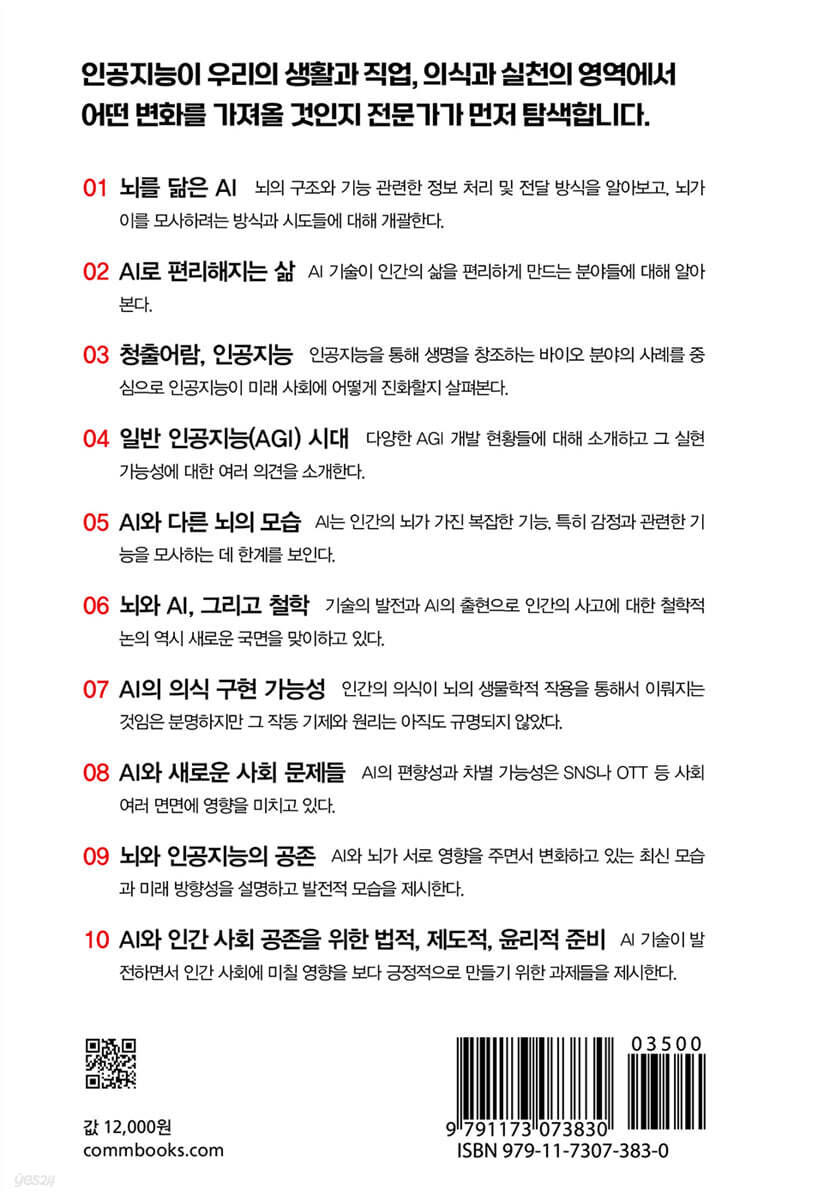 01 뇌를 닮은 AI 02 AI로 편리해지는 삶 03 청출어람, 인공지능 04 일반 인공지능 시대 05 AI와 다른 뇌의 모습 06 뇌와 AI, 그리고 철학 07 AI의 의식 구현 가능성 08 AI와 새로운 사회 문제들 09 뇌와 인공지능의 공존 10 AI와 인간 사회 공존을 위한 법적, 제도적, 윤리적 준비 |