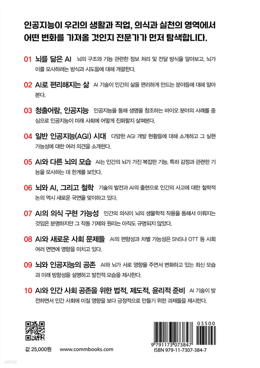 01 뇌를 닮은 AI 02 AI로 편리해지는 삶 03 청출어람, 인공지능 04 일반 인공지능 시대 05 AI와 다른 뇌의 모습 06 뇌와 AI, 그리고 철학 07 AI의 의식 구현 가능성 08 AI와 새로운 사회 문제들 09 뇌와 인공지능의 공존 10 AI와 인간 사회 공존을 위한 법적, 제도적, 윤리적 준비 |