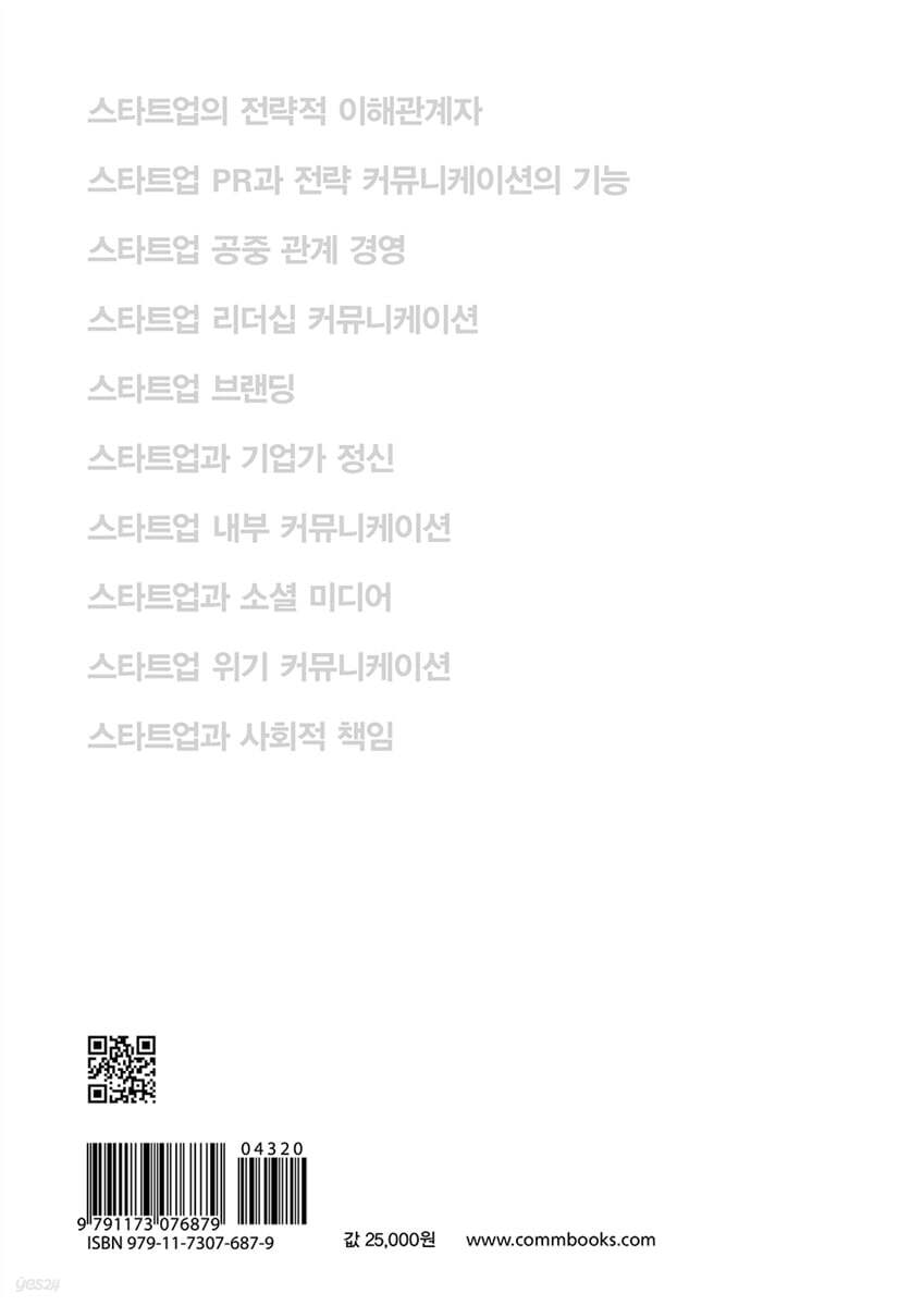 01 스타트업의 전략적 이해관계자 02 스타트업 PR과 전략 커뮤니케이션의 기능 03 스타트업 공중 관계 경영 04 스타트업 리더십 커뮤니케이션 05 스타트업 브랜딩 06 스타트업과 기업가 정신 07 스타트업 내부 커뮤니케이션 08 스타트업과 소셜 미디어 09 스타트업 위기 커뮤니케이션 10 스타트업과 사회적 책임 |