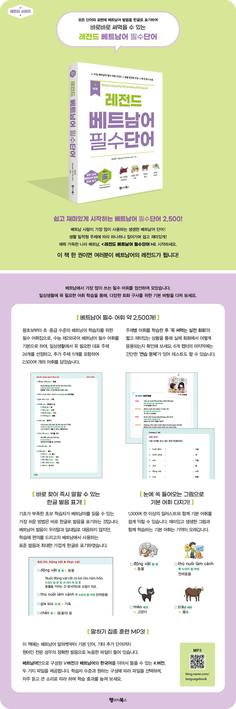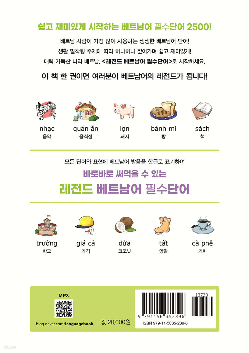 베트남어 필수 어휘 약 2,500개! 왕초보부터 초·중급 수준의 베트남어 학습 자를 위한 필수 어휘집으로, 수능 제2외국어 베트남어 필수 어휘를 기본으로 하여, 일상생활에서 꼭 필요한 대표 주제 24개를 선정하였고, 추가 주제 11개를 포함하여 2,500여 개의 어휘를 담았습니다. 24개 주제별 어휘 학습 후 ‘꼭 써먹는 실전 회화’에서는 짤막한 상황별 대화를 통해 실전 회화에서 어떻게 응용되는지 확인해 보세 요. 6개 챕터의 마지막 부분에는 간단한 ‘연습 문제’가 있어 스스로 실력을 확인해 볼 수 있어요. 눈에 쏙 들어오는 그림으로 기본 어휘 다지기! 1,000여 컷 이상의 일러스트와 함께 기본 어휘를 쉽게 익힐 수 있습니다. 기본 어휘를 재미있고 생생한 그림과 함께 담아 기억이 오래갑니다. 바로 찾아 바로 말할 수 있는 한글 발음 표기! 기초가 부족한 초보 학습자가 베트남어를 읽을 수 있는 가장 쉬운 방법은 바로 한글 발음입니다. 베트남어 발음이 우리말과 일대일로 대응하진 않지만, 여러분의 학습에 편의를 드리고자 베트남에서 사용하는 표준 발음과 최대한 가깝게 한글로 표기하였습니다. 초보자도 자신감을 갖고 말할 수 있어요. 말하기 집중 훈련 MP3! 이 책에는 베트남어 알파벳부터 기본 단어, 기타 추가 단어까지 베트남 원어민의 정확한 발음으로 녹음한 파일이 들어 있습니다. 베트남어만으로 구성된 ‘베트남어’ V 버전과 베트남어와 한국어를 이어서 들을 수 있는 ‘베트남어 + 한국어’ K 버전, 두 가지 버전의 파일을 제공합니다. 학습자 수준에 따라 원하는 구성의 파일을 선택하여, 자주 듣고 큰 소리로 따라 말하며 학습 효과를 높여 보세요. 머리말 쉽고 재미있게 만나는 베트남어 필수 단어 Xin Chao! 씬 짜오! 베트남어 공부의 첫발을 내디딘 여러분, 반갑습니다. 혹시 베트남을 아주 먼 나라라고 생각하시나요? 베트남은 12만 명 이상의 우리 교민 들이 거주하고 있으며, 많은 한국 기업들이 활발히 진출해 있는 전 세계에서 8번째로 많은 재외 동포 거주국이랍니다. 그리고 2018년 한 해 베트남 방문객 중 한국인이 340만 명을 넘어서는 등 베트남은 한국인들에게 점점 더 인기 관광지가 되고 있답니다. 이러한 추세에 힘입어 베트남어의 중요성은 점점 더 부각되고 있지요. 베트남과 우리나라는 각각 중국의 서쪽 끝과 동쪽 끝에 위치해 있어서 두 나라 모두 역사적으로 중국의 영향을 많이 받았고, 함께 동아시아 문화권에 속해 비슷한 문화를 갖고 있답니다. 언어 역시 비슷한 발음이 많아요. 예를 들면 사회(社會)는 xa h?i 싸 호이, 결혼(結婚)은 k?t hon 껟 혼이라고 한답니다. 정말 비슷하지요. 자 이제 여러분들도 자신감을 갖고, 베트남어를 함께 시작해 봅시다! 베트남어 하면 성조가 6개이고, 발음이 어렵다고 많이 생각하는데요. 문법이나 어휘는 한국어보다 간단한 부분이 많답니다. MP3를 익숙해질 때까지 자주 반복해서 들으며 따라 하세요. |