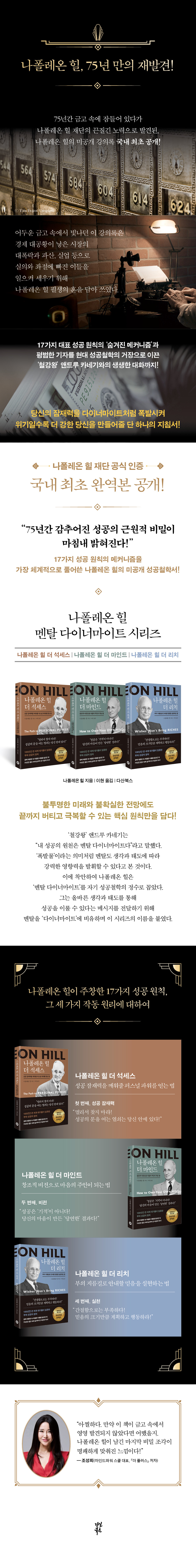 “내 성공의 원천은 멘탈 다이너마이트다!” 밥 프록터, 조셉 머피를 만든 ‘성공철학의 거장’이 남긴,불투명한 미래와 불확실한 전망에도끝까지 버티고 극복할 수 있게 할 핵심 원칙들!“명심하라, 이 철학을 공부하기 시작한 자여. 자기 마음의 주인이 되어 그것을 잘 사용한다면 ‘항상 운이 좋기만 한 사람은 없게 하는’ 바로 그 수레바퀴가 ‘항상 불행하기만 한 사람도 없게’ 해줄 것이다.”― 작가의 말 중에서미국의 ‘철강왕’ 앤드루 카네기는 “내 성공의 원천은 멘탈 다이너마이트다”라고 밝혔다. ‘폭발물’이라는 의미처럼 멘탈도 개인의 생각과 태도에 따라 강력한 영향력을 발휘할 수 있다고 본 것이다. 이에 착안하여 나폴레온 힐은 ‘멘탈 다이너마이트’를 자기 성공철학의 정수로 꼽았다. 그는 평생을 바쳐 올바른 생각과 태도를 통해 성공을 이룰 수 있다는 메시지를 전달하기 위해 멘탈을 ‘다이너마이트’에 비유하며 이 시리즈의 이름을 붙였다. ‘나폴레온 힐 멘탈 다이너마이트 시리즈’는 『나폴레온 힐 더 석세스』 『나폴레온 힐 더 마인드』 『나폴레온 힐 더 리치』 총 3권으로 구성되어 있으며, 나폴레온 힐의 17가지 성공 원칙을 성공 잠재력, 비전, 실천이라는 측면으로 엮은 뒤 각 원칙의 유기적인 작동 원리를 가장 쉽게 풀어쓴 시리즈다. 경제 불황, 파산, 실업, 급격한 시장 변동 등 반복되는 역사에서 꾸준히 입증된 대가의 철학은 당신을 위한 또 하나의 지침서가 되어줄 것이다.“간절함으로는 부족하다!믿음의 크기만큼 계획하고 행동하라!” 성공에 가까워지는 가장 간단한 방법!100년간 전 세계 대가들이 입증한 부와 성공의 원칙에 대하여세계대전은 끝났지만 여전히 세계 곳곳에서는 크고 작은 전쟁들이 지속되고 있으며, 경제 대공황 이후 영원히 우상향일 것 같았던 경제 성장 그래프는 다시 아래로 곤두박질치며 흔들리고 있다. 게다가 이전에 발견되지 않았던 전염병 바이러스의 등장으로 지금까지의 삶과 가치관 또한 180도 바뀌었다. 현대 경제와 똑같이 혼란스럽기만 했던 과거, 무너진 세계 경제 한가운데서 나폴레온 힐은 성공한 사람들을 철저하게 분석하기 시작했고, 그 결과 17가지 성공 원칙을 정립했다. 『나폴레온 힐 더 리치』는 막연하게 꿈꾸던 성공을 실현하는 방법을 설명한다.나폴레온 힐은 부를 축적하고 성공하기 위해선 믿음만으로는 부족하다는 사실을 발견하고, 행동의 중요성을 강조했다. 구체적인 행동을 통해 삶에 믿음을 적용해 나갈 때 비로소 성공의 비결인 자신감을 얻을 수 있었던 것이다. 이 책에서 나폴레온 힐은 실행하는 믿음, 열정, 체계적인 노력이 바로 꿈을 시각화할 수 있는 도구라고 말한다. 믿음을 실천할 때 부의 지름길에 한 걸음 더 가까워지며, 내면의 힘도 강해질 수 있다. 또한 당신에게 더 이상 ‘할 수 없다’와 같은 부정적인 생각은 존재하지 않을 것이다.