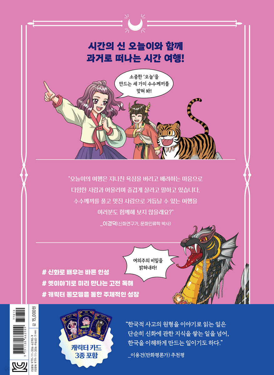 ◆ 초등 교과서도 다룬 ‘원천강본풀이’ 신화를 원전 그대로 읽는 학습 만화! ◆ 어린이의 정체성과 상상력의 단단한 뿌리가 되어 줄 우리 신화 인문학! “과거에 갇히지도 말고, 미래를 두려워하지도 말고, 최선을 다해 오늘을 지내는 거야!” 눈부신 오늘을 만드는 ‘원천강본풀이’ 신화의 세 가지 교훈 『만화 한국 신화』 7권의 주인공 오늘이는 부모를 찾기 위해 미지의 세계 원천강으로 길을 나선다. 가는 길에 여러 존재의 도움을 받는 대신 그들의 고민을 해결해 달라는 부탁을 받는다. 장상 도령과 내일 낭자는 자신들이 언제까지 책을 읽어야 하는지, 연꽃은 왜 꽃이 하나만 피는지, 여의주가 많은 이무기는 왜 승천하지 못하는지 그 이유를 찾아 달라고 한다. 끈기 있고 의리 있는 오늘이가 찾아 낸 답은 의외로 간단하다. 장상 도령과 내일 낭자는 준비가 끝났다면 세상에 뛰어들어야 하고, 연꽃은 한 송이에 대한 집착을 버려야 하며, 이무기는 욕심을 버리고 여의주를 하나만 가져야 한다는 사실이다. 아이들은 원천강본풀이 신화의 수수께끼를 풀며 삶을 살아가는 데 중요한 교훈을 얻는다. 더불어 시간의 신 오늘이를 통해 과거와 미래보다 현재, 오늘이 가장 소중하고 중요하다는 사실을 자연스럽게 깨닫게 된다. 1. 한국 신화로 배우는 문화정체성과 올바른 인성 신화는 오래전부터 이 땅에서 살아온 사람들이 겪은 삶의 경험과 생각이 담긴 이야기다. 그리스 로마 신화를 통해 서양 문화를 이해할 수 있다면, 한국 신화를 통해서는 우리 문화와 가치관을 배울 수 있다. 한국 신화를 안다는 건 우리 문화에 깔린 교훈과 변하지 않는 삶의 가치를 안다는 것이다. 더욱이 한국 신화에는 서로 경쟁하거나 타인을 지배하기보다는 더불어 살아가는 정신이 담겨 있다. 현대 사회를 주체적으로 살아갈 어린이들은 우리 민족의 뿌리와 시민성, 조화와 배려의 마음가짐을 배울 수 있다. 2. 옛이야기로 미리 만나는 고전 독해 상징으로 가득한 한국 신화는 어린이들이 앞으로 만날 고전을 해석하는 데 도움을 준다. 『만화 한국 신화』는 신화학자 이경덕 교수의 해설로 신화를 정확하고 폭넓게 이해할 수 있도록 한다. 흥부전, 심청전보다 재미있고 새로운 이야기로 우리 아이 고전 친화력을 높이고 문화 지식을 쌓을 수 있다. 3. 다양한 캐릭터 롤모델을 통한 주체적인 성장 한국 신화에는 여러 신과 인간이 주인공으로 등장한다. 여성 신들의 활약이 두드러지고, 인간에서 신이 되는 등 그리스 로마 신화나 북유럽 신화와는 다른 캐릭터 유형을 보는 재미가 있다. 이들은 우리가 익히 봐온 신과는 사뭇 다른 방식으로 문제를 해결하고 세상의 질서를 주도적으로 바로잡는다. 부드럽게 보듬고 서로를 보살피며 살아가는 힘을 보여 주는 신들의 모습은 어린이들에게 바람직한 롤모델을 제시해 준다. |