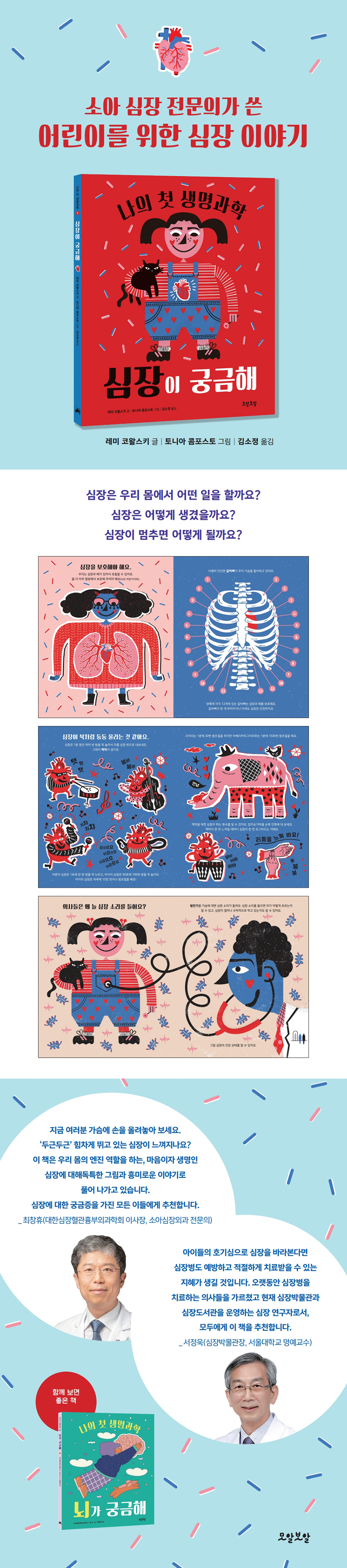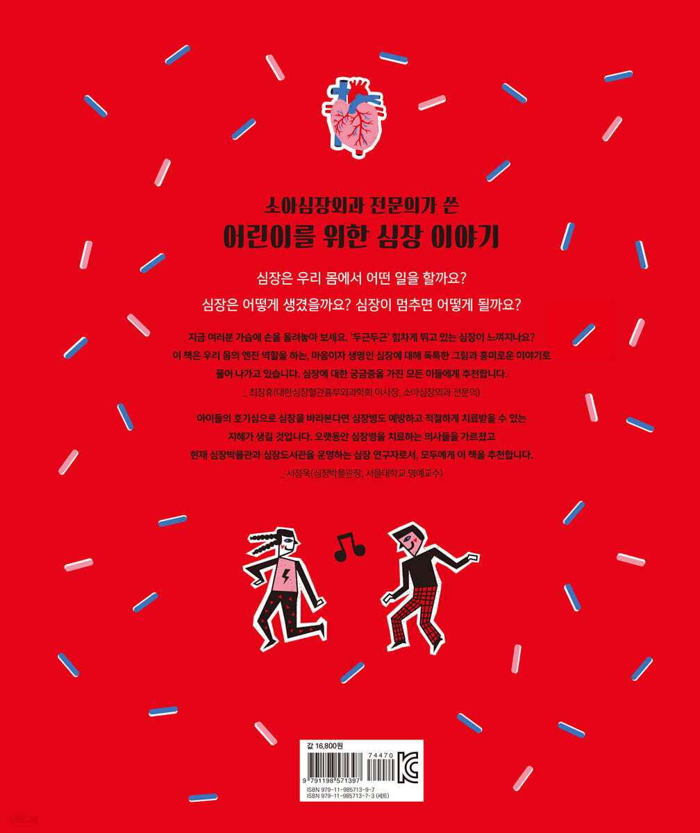 지금 여러분 가슴에 손을 올려놓아 보세요. ‘두근두근’ 힘차게 뛰고 있는 심장이 느껴지나요? 이 책은 우리 몸의 엔진 역할을 하는, 마음이자 생명인 심장에 대해 독특한 그림과 흥미로운 이야기로 풀어 나가고 있습니다. 심장의 구조와 기능을 소개하고, 심장에 대한 지식과 건강 관리 정보까지 쉽게 정리해 놓았습니다. 아픈 아이들의 심장을 날마다 만지고 보면서 수술하는 심장외과 의사가 보기에도 참 재미있습니다. 심장에 대한 궁금증을 가진 모든 이들에게 추천합니다. - 최창휴 (대한심장혈관흉부외과학회 이사장, 소아심장외과 전문의)