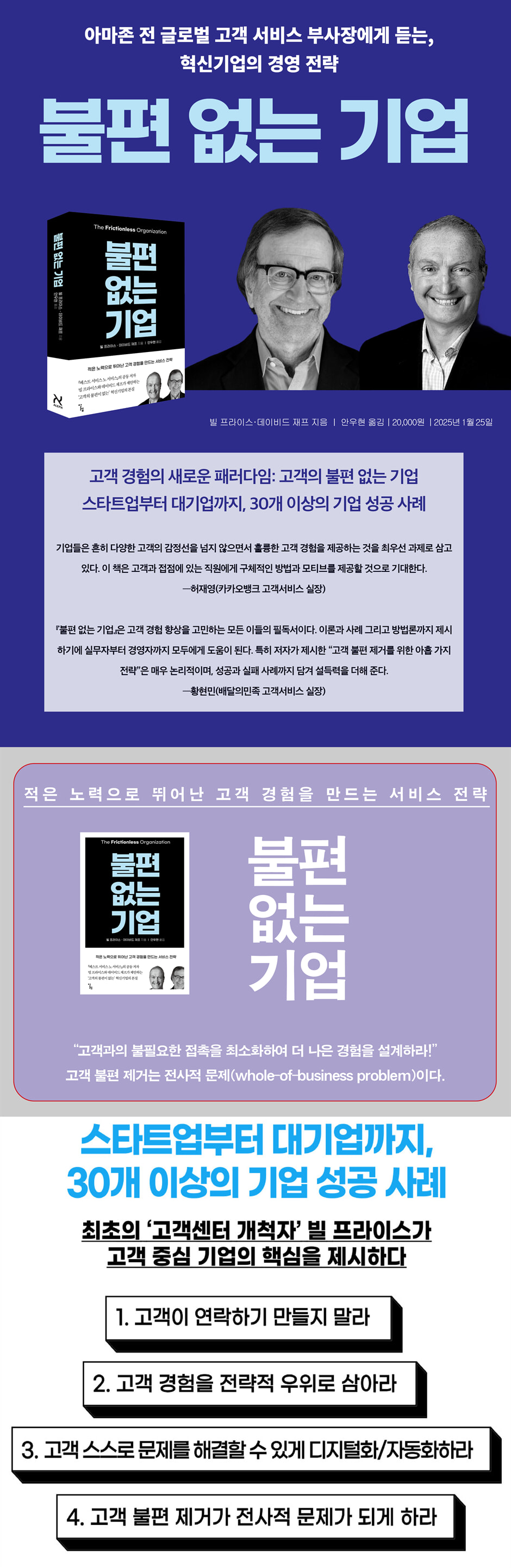 『불편 없는 기업』은 고객 경험 향상을 고민하는 모든 이들의 필독서이다. 이론과 사례 그리고 방법론까지 제시하기에 실무자부터 경영자까지 모두에게 도움이 된다. 특히 저자가 제시한 “고객 불편 제거를 위한 아홉 가지 전략”은 매우 논리적이며, 성공과 실패 사례까지 담겨 설득력을 더해 준다. 고객 경험 향상을 위해 조직 전체가 어떻게 움직여야 할지 고민하고 있다면, 이 책을 강력하게 추천한다. - 황현민 (배달의민족 고객서비스 실장)