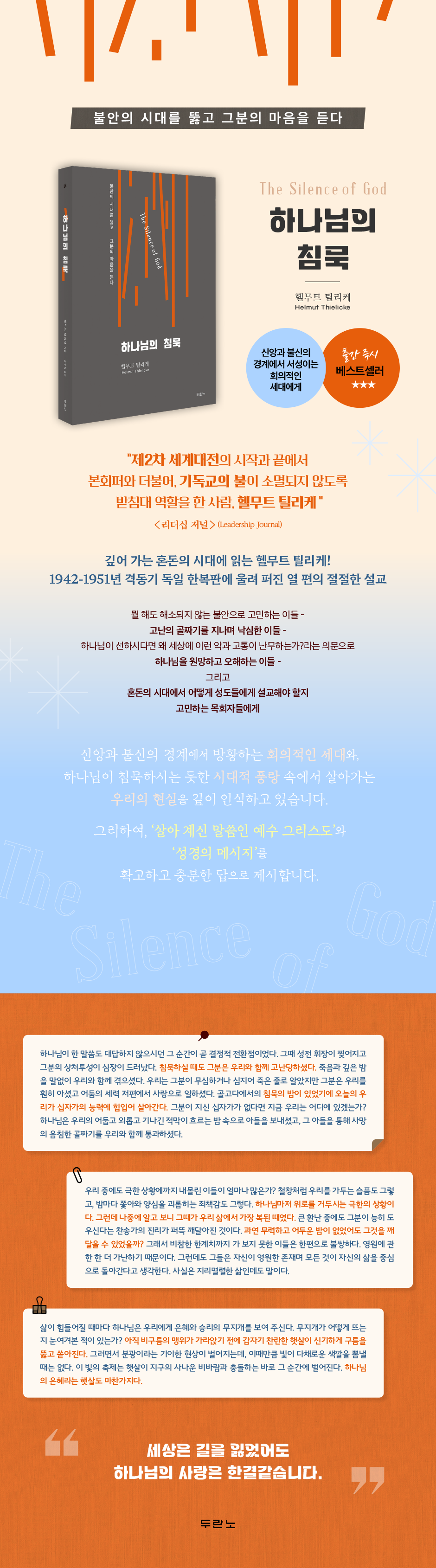 신앙과 불신의 경계에서 서성이는 회의적인 세대에게“세상은 길을 잃었어도하나님의 사랑은 한결같습니다.”이 책은 참화에 무너진 세상을 묵시록적 차원에서 진단하면서, 바로 그 세상을 향해 하나님의 메시지인 구원과 심판을 선포한다. ‘하나님의 영원한 말씀’이 어떻게 인간의 시간 속에 들어와 엄연한 실재로서 우리를 떠받치고 인도하는지를 생생하게 보여 줌으로써, 시름에 잠긴 우리를 위로하고 격려한다. 1부의 설교들은 전쟁으로 폐허가 된 일상과 사회적 긴장 속에서 불안에 시달리는 이들에게 하나님 앞에서 고통에 대한 바른 질문을 던지도록 이끌며, 궁극적으로 그리스도의 십자가에서 나타난 하나님의 심오한 섭리와 목적에 참여하는 해방을 경험하게 이끈다. 2부의 절기 설교들은 복음의 굵직한 주제에 기초한 것으로, 틸리케 설교의 정수를 보여 준다. 특히 그는 예수님의 성육신과 십자가 죽음과 부활의 메시지를 당대의 상황에 적용했다. 세월이 흘러 오늘날은 그가 살던 시대와 많은 면에서 달라졌으나 여전히 세상은 악과 고통이 가득하며, 형태는 다르나 또 다른 종류의 불안의 시대를 살아가는 이들에게 그의 복음 메시지는 여전히 유효하다.